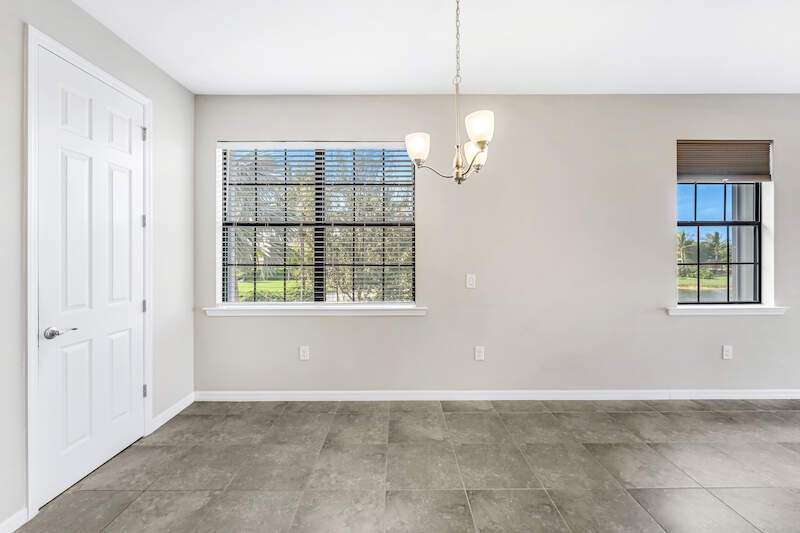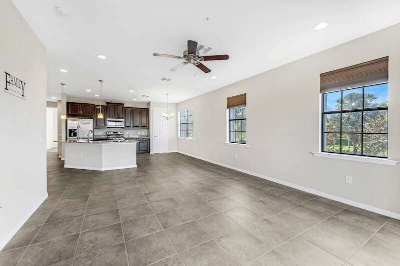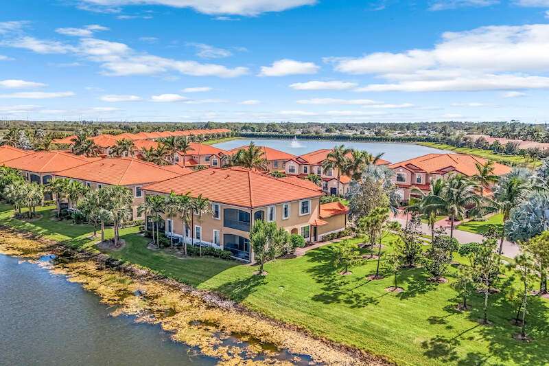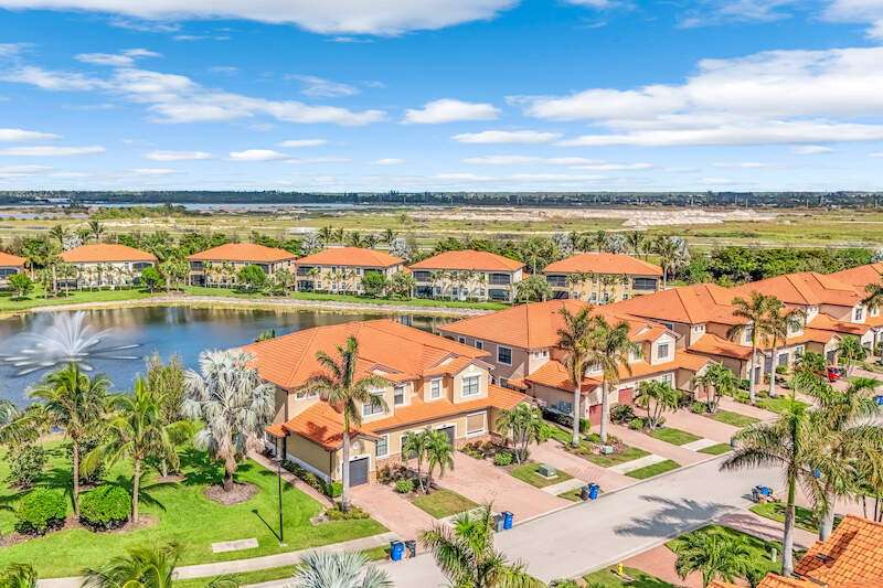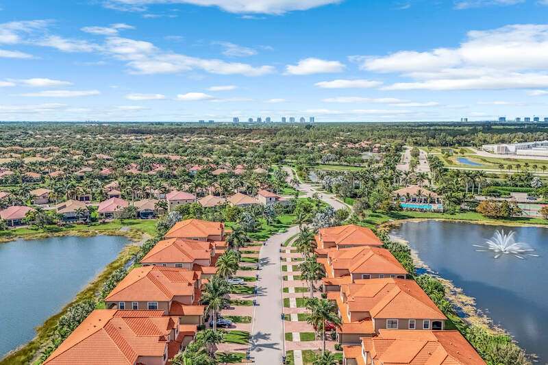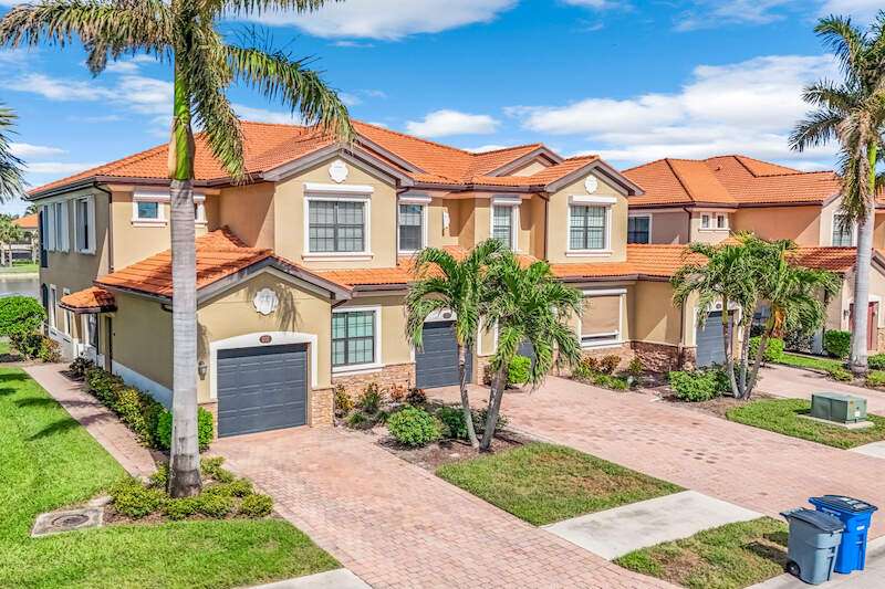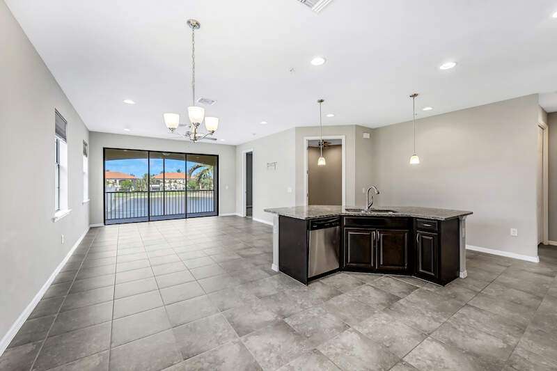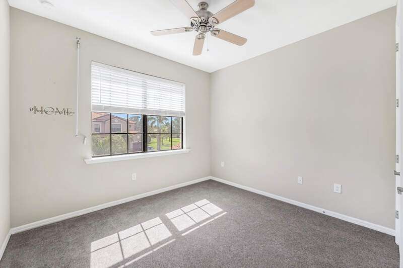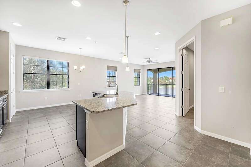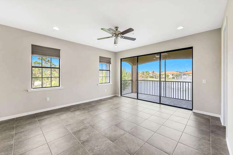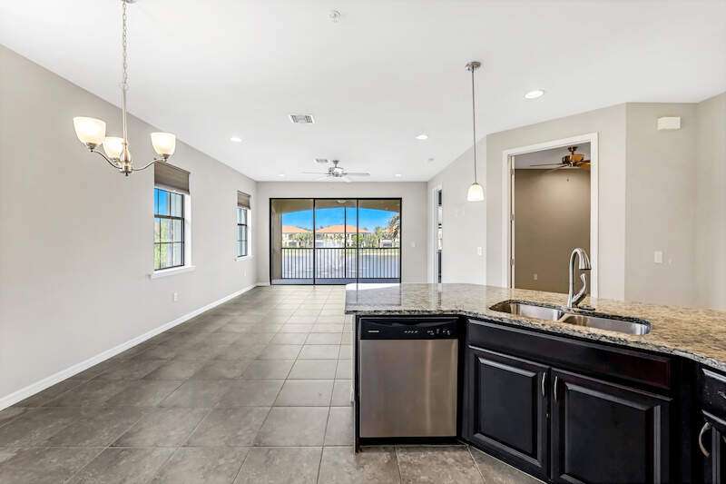 A MUST SEE Light & Bright second floor end unit offers a fantastic lake and fountain view. Just freshly painted throughout this 3 bedroom plus den features a spacious open floor plan with ceramic tiled living areas and 2 full baths. Beautifully appointed with 42" upper kitchen cabinets, granite counter tops, stainless steel kitchen appliances and a huge walk-in pantry makes for a cooks kitchen. For your convenience there are New accordion and rollup shutters added in 2022. At Paloma you'll enjoy a maintenance free lifestyle and resort style amenities with swimming pool, bocce court, fitness and club house with card room, gathering room, catering kitchen and tennis courts! Paloma is a gated community located in Bonita Springs, just off Imperial Pkwy with only minutes to the beach and Coconut Point Mall.