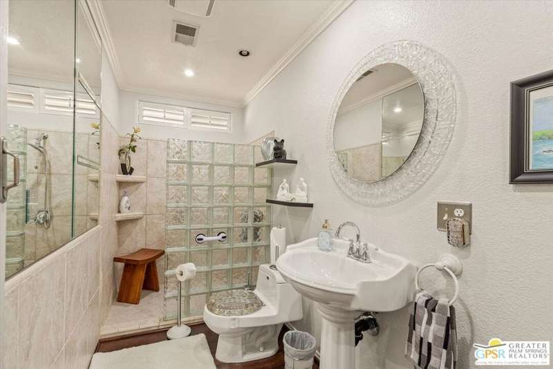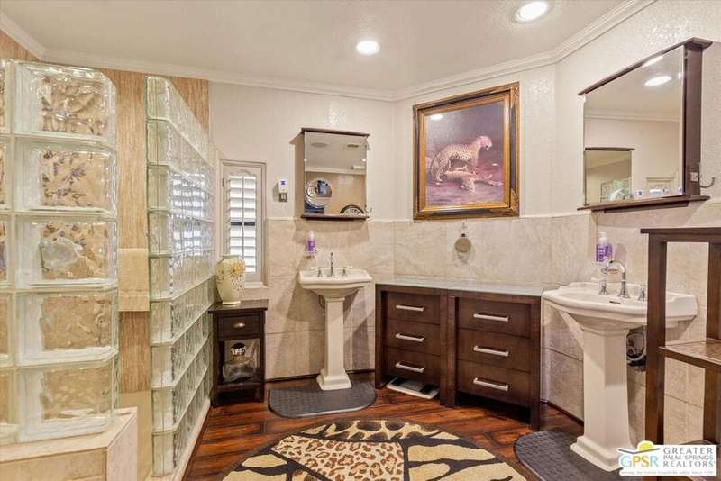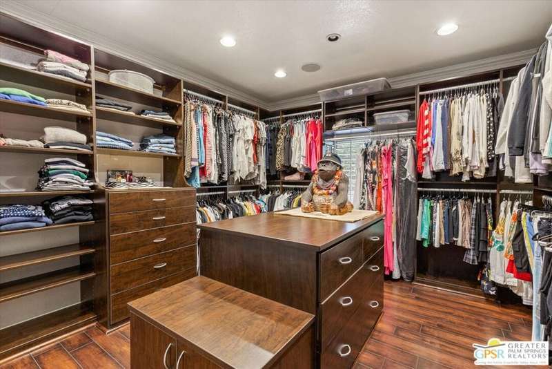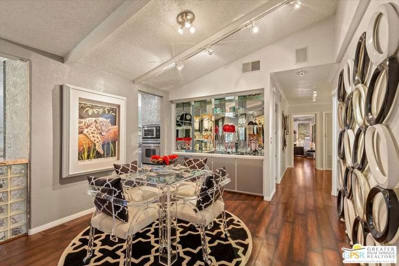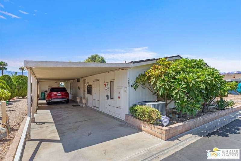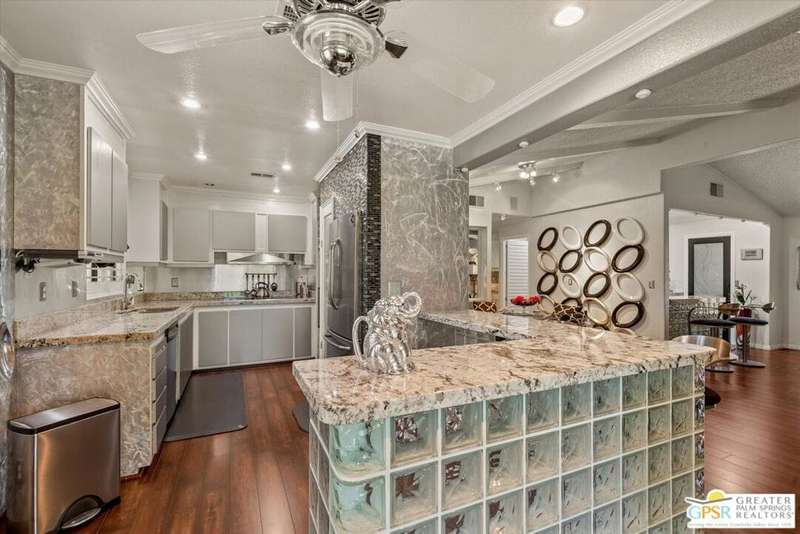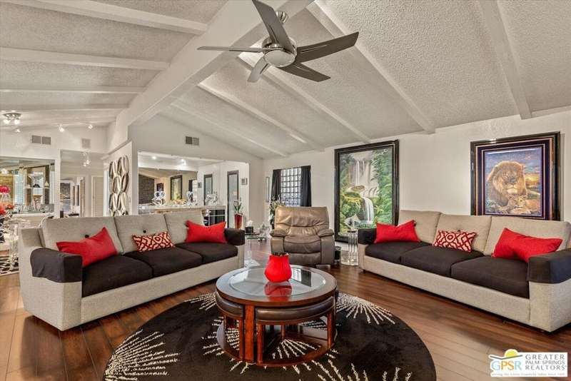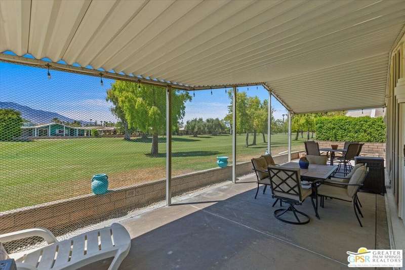 Framed by beautiful golf course views and mountain panoramas, this impressive move-in-ready fairway residence is destined to sell at Palm Desert's gated Suncrest Country Club, which is reserved for those who are 55 and better. The spacious triple-wide design extends approximately 1,920 square feet over one level and impresses with a large living room with fireplace, views and floor-to-ceiling windows. Living areas flow effortlessly to a chic walk-in wet bar and a dining room with built-in buffet and mirrored display shelves. Light and open with a vaulted and beamed ceiling, the interior is enviably private and welcomes fabulous entertaining and simple relaxation. Completely reimagined, the open kitchen is adorned with artistic stainless steel wall panels, granite countertops, mosaic tile, a breakfast bar, access to a covered patio, crown molding, a walk-in pantry and stainless steel appliances. Two bedrooms and two upgraded baths are showcased, with the secondary bedroom currently featured as a massive walk-in closet with furniture-caliber built-ins. This room can easily be transformed back into a bedroom. An opulent sanctuary, the primary suite displays a custom accent wall, custom office with built-in desk and cabinets, and a spacious remodeled bath with soaking tub, walk-in shower and separate sinks. Extras include solar power, a security system, whole house audio, plantation shutters and a newer roof. The backyard is located directly on the edge of the golf course, providing gorgeous unobstructed views from two covered patios. For added convenience, the home's carport accommodates two vehicles. Located in the heart of Palm Desert, Suncrest Country Club presents a luxurious clubhouse with billiards, library, locker rooms, pro shop and cafe. Residents enjoy easy access to a trio of swimming pools, in-ground spas, lighted tennis and pickleball courts, and a gorgeous 9-hole golf course. Premium resorts, abundant shopping, countless restaurants, and Eisenhower Medical Center are moments away, and Rancho Mirage and Palm Springs are nearby.