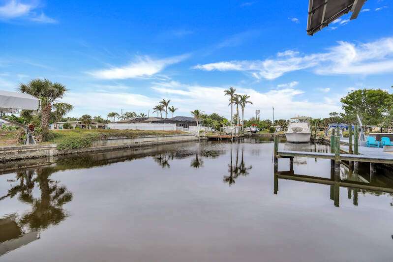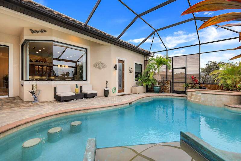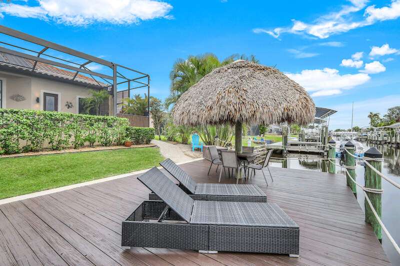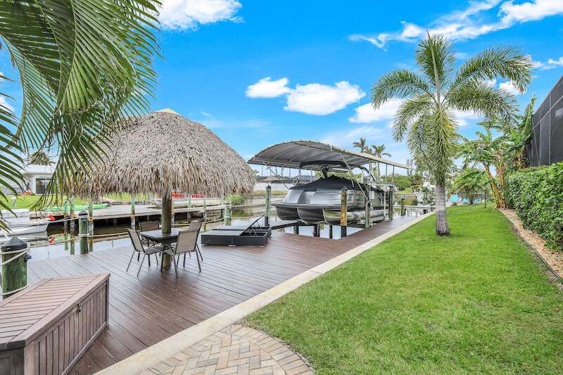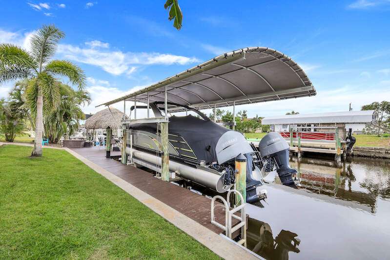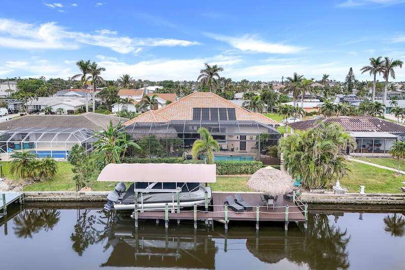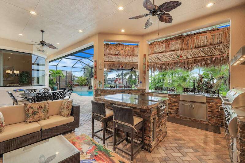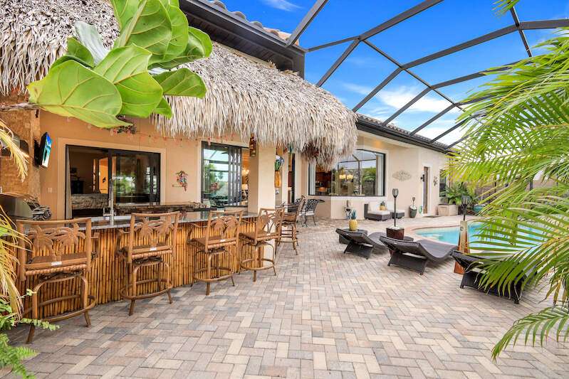 Experience the Ultimate Outdoor Lifestyle in Sunny Southwest Florida! Welcome to your personal tropical oasis! This stunning home features a tiki bar, outdoor kitchen, saltwater pool and spa, and a private dock with a tiki hut and boat lift offering direct Gulf access with no bridges or locks-just minutes to open water! As you arrive, you'll be greeted by a professionally landscaped yard filled with mature greenery, setting the tone for the beauty inside. Step through the elegant double-entry doors, and your eyes will be drawn to the sparkling pool with in-water seating, surrounded by a lush outdoor paradise. Inside, the home boasts tall ceilings, travertine flooring in the main living areas, crown molding, and tray ceilings. The chef in your family will love the dream kitchen, complete with custom wooden cabinetry, granite countertops, a breakfast bar, stainless steel appliances, and a large island with a wine fridge. The kitchen seamlessly flows into the living room, a casual eat-in area with pool views, and a formal dining space-perfect for entertaining. Slide open the glass doors to the expansive tiki bar, where you'll find a custom stone fireplace, charcoal and gas grills, an icemaker, dishwasher, pot filler, and outdoor burners, including a griddle. Relax by the heated (electric and solar) pool, grab a seat at the covered bar to catch your favorite sporting event, or enjoy your morning coffee on the canal-side dock. The primary suite is a serene retreat with access to the lanai, a spacious walk-in closet, and an ensuite bathroom featuring a separate tub and a walk-through shower. The home's split floor plan ensures privacy, with two guest bedrooms-one ensuite and the other adjacent to the pool bath-plus a versatile den/office currently set up as a fourth bedroom. This meticulously maintained home is being sold TURNKEY and exudes pride of ownership throughout. Live the vacation lifestyle every day with 5200 square feet of indoor/outdoor living! Built in 2014 by Frey & Sons, this home has not experienced any flooding. Call today to schedule your private showing and make this tropical retreat yours!
