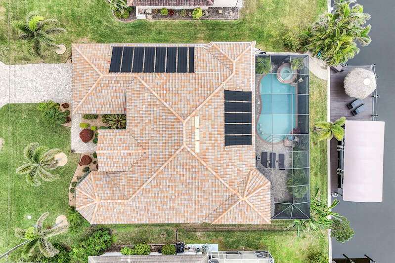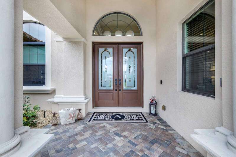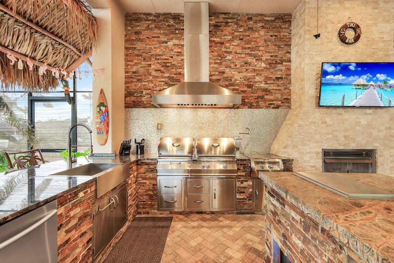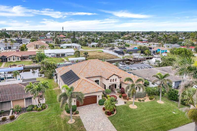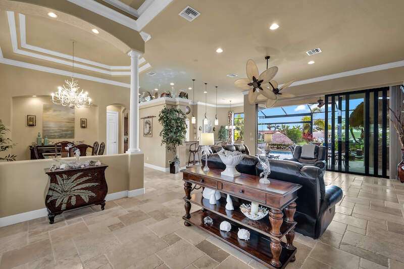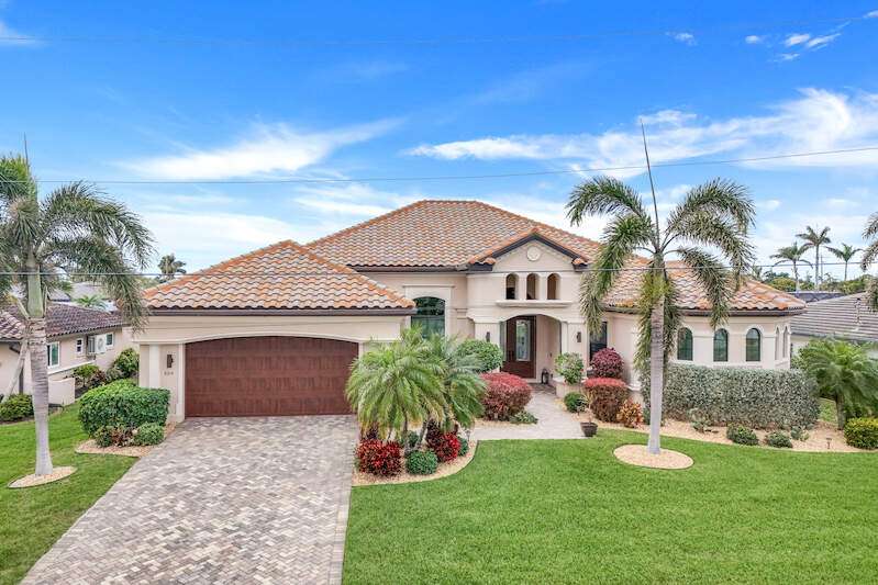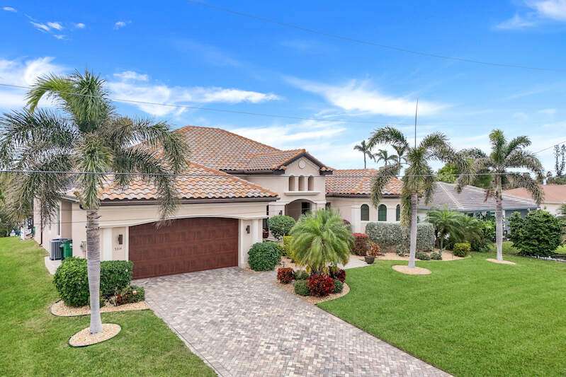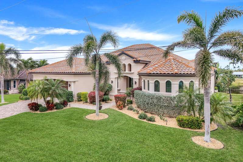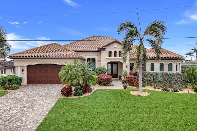 Experience the Ultimate Outdoor Lifestyle in Sunny Southwest Florida! Welcome to your personal tropical oasis! This stunning home features a tiki bar, outdoor kitchen, saltwater pool and spa, and a private dock with a tiki hut and boat lift offering direct Gulf access with no bridges or locks-just minutes to open water! As you arrive, you'll be greeted by a professionally landscaped yard filled with mature greenery, setting the tone for the beauty inside. Step through the elegant double-entry doors, and your eyes will be drawn to the sparkling pool with in-water seating, surrounded by a lush outdoor paradise. Inside, the home boasts tall ceilings, travertine flooring in the main living areas, crown molding, and tray ceilings. The chef in your family will love the dream kitchen, complete with custom wooden cabinetry, granite countertops, a breakfast bar, stainless steel appliances, and a large island with a wine fridge. The kitchen seamlessly flows into the living room, a casual eat-in area with pool views, and a formal dining space-perfect for entertaining. Slide open the glass doors to the expansive tiki bar, where you'll find a custom stone fireplace, charcoal and gas grills, an icemaker, dishwasher, pot filler, and outdoor burners, including a griddle. Relax by the heated (electric and solar) pool, grab a seat at the covered bar to catch your favorite sporting event, or enjoy your morning coffee on the canal-side dock. The primary suite is a serene retreat with access to the lanai, a spacious walk-in closet, and an ensuite bathroom featuring a separate tub and a walk-through shower. The home's split floor plan ensures privacy, with two guest bedrooms-one ensuite and the other adjacent to the pool bath-plus a versatile den/office currently set up as a fourth bedroom. This meticulously maintained home is being sold TURNKEY and exudes pride of ownership throughout. Live the vacation lifestyle every day with 5200 square feet of indoor/outdoor living! Built in 2014 by Frey & Sons, this home has not experienced any flooding. Call today to schedule your private showing and make this tropical retreat yours!