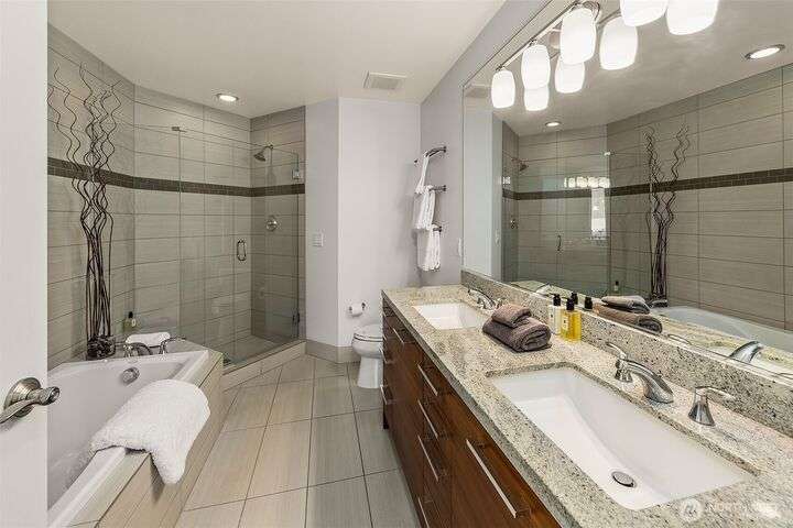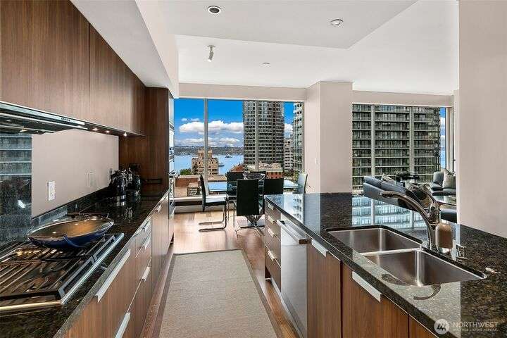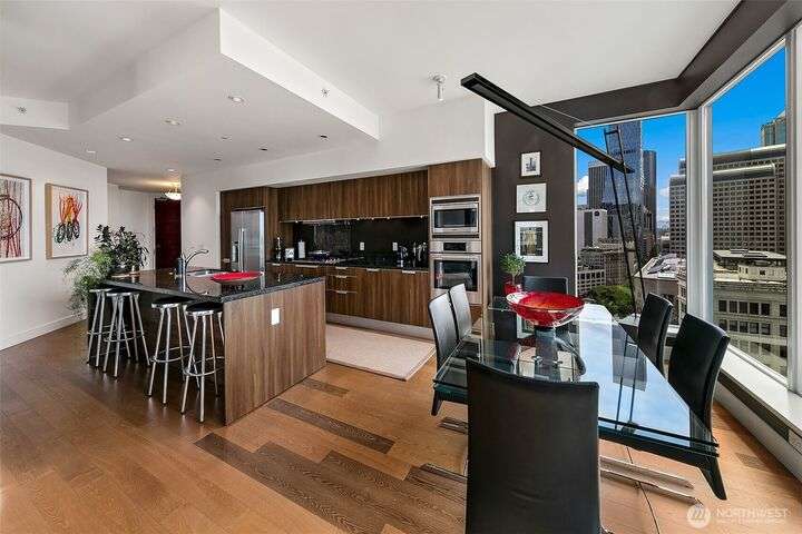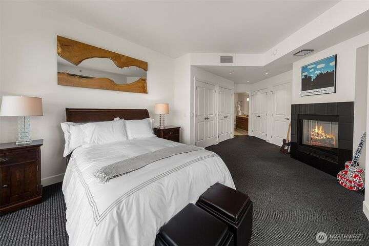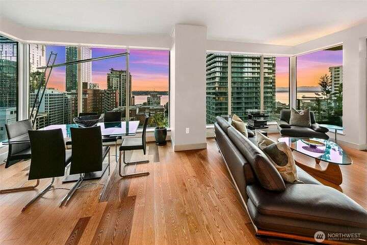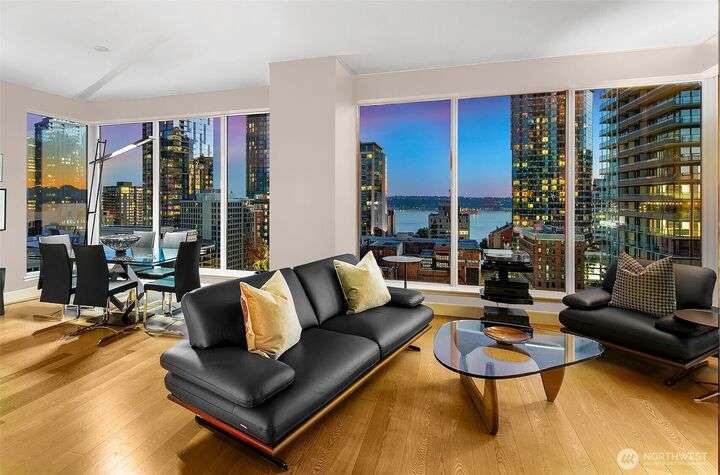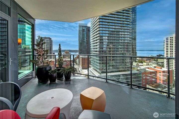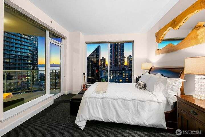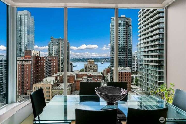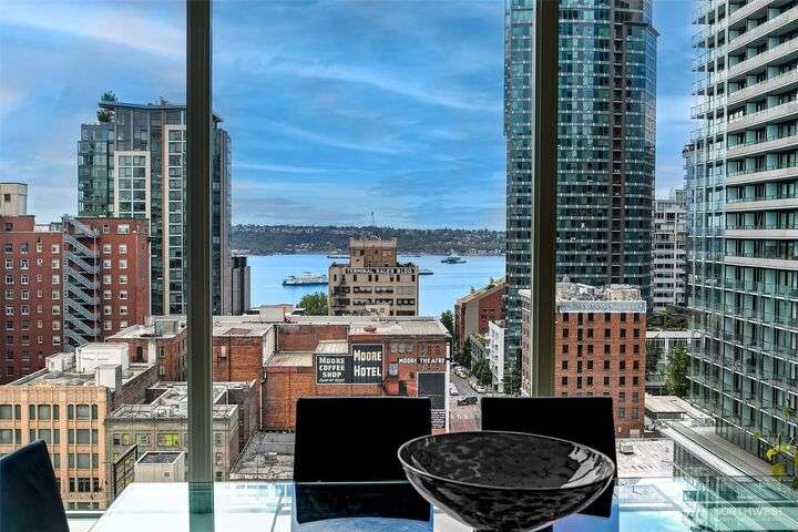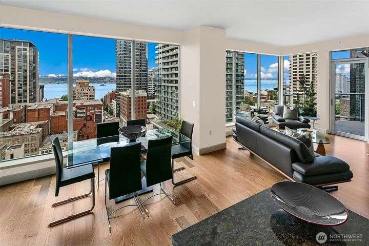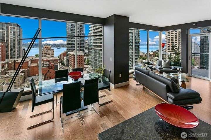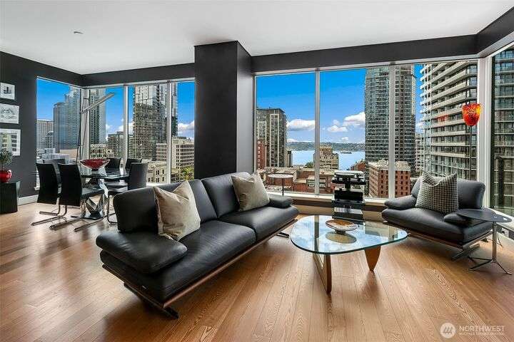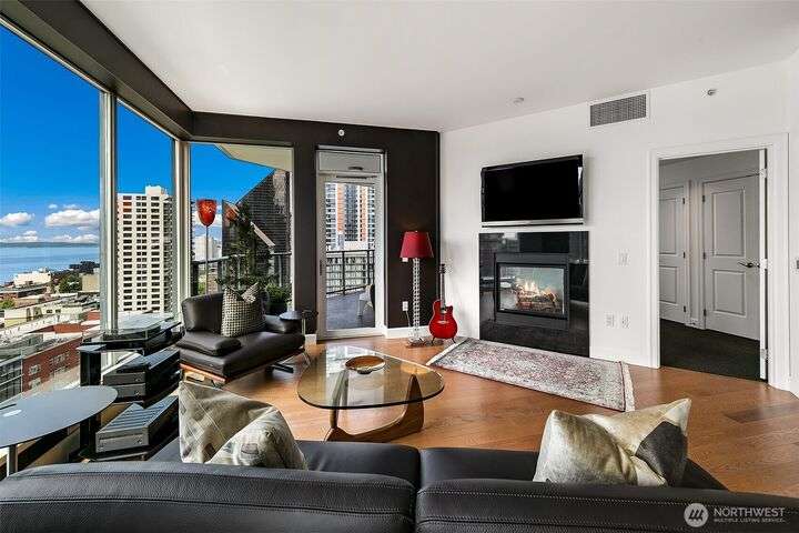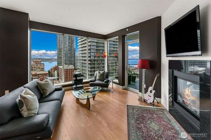Stunning water & city view home at Escala! Enjoy enviable views of Elliott Bay, Olympic mountains & Space Needle. Perched high above the city, this 17th floor NW corner home features an open concept floor plan. Seamless flow from kitchen, dinning, living & outdoor terrace. Home is wrapped with 10ft' floor to ceiling west facing windows,flooded with natural light. Enjoy spacious living-1607 sqft with oversized primary, flanked by double sided gas fireplace. Chef inspired kitchen, featuring an oversized prep island, top tier appliances, gas cooking and Pedini Italian cabinets. Spa like bath with double vanity & oversized soaking tub. World-class amenities, 24/7 concierge, 2 parking + storage. A/C, pet friendly,BBQ's permitted on balcony.