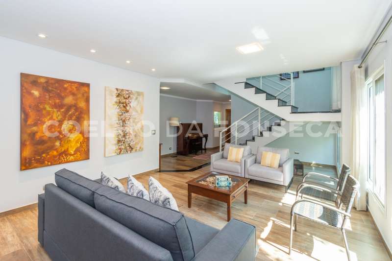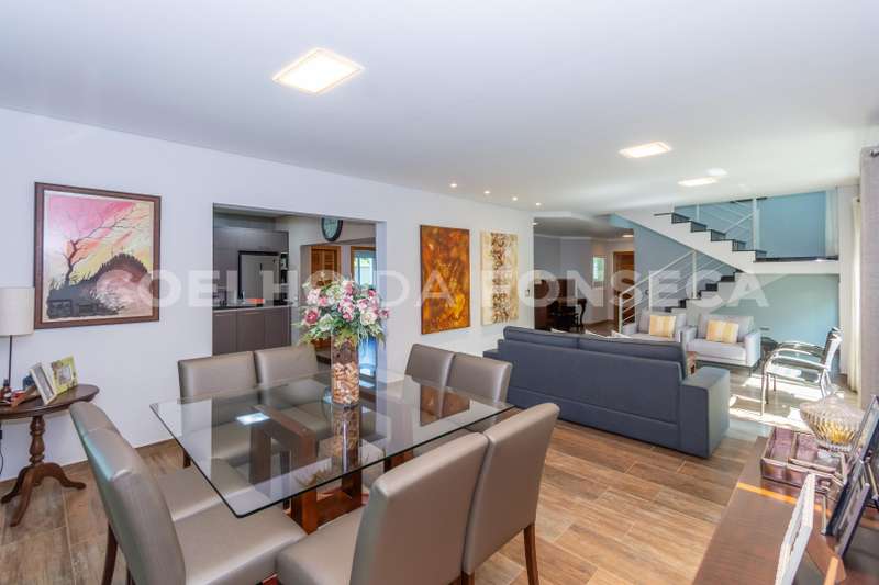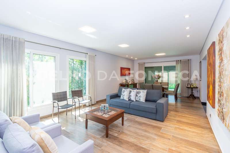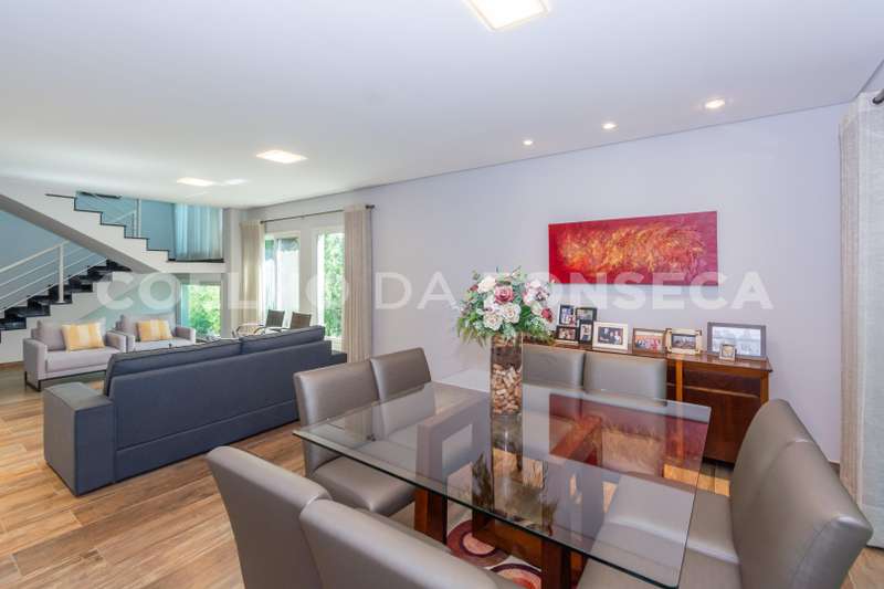 Bela casa moderna em rua sem saída, pavimento superior 3 suítes mais escritório. No pavimento térreo uma suíte, sala de estar e jantar, adega para 200 garrafas, cozinha integrada com espaço gourmet com sala de TV, area de serviço, e quintal, jardim nos fundos e na frente.