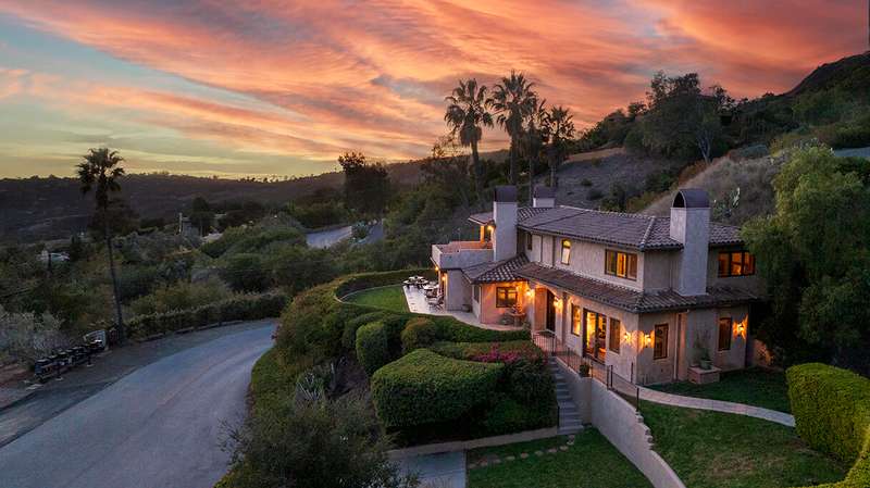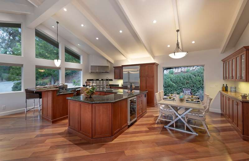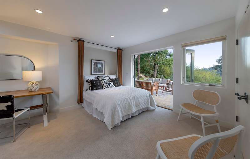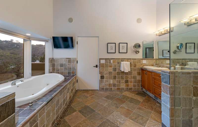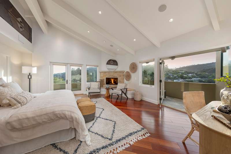 The luxurious primary suite is a private retreat, complete with its own view deck, fireplace, vaulted ceilings, multiple walk-in closets, a spa-like jetted tub, and a glass enclosed shower. The additional three bedrooms feature French doors which provide access to the yard and allow in copious amounts of natural light.