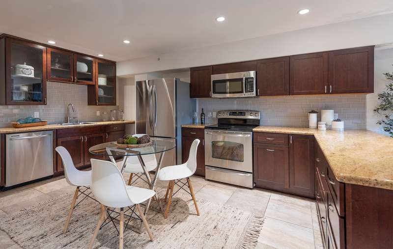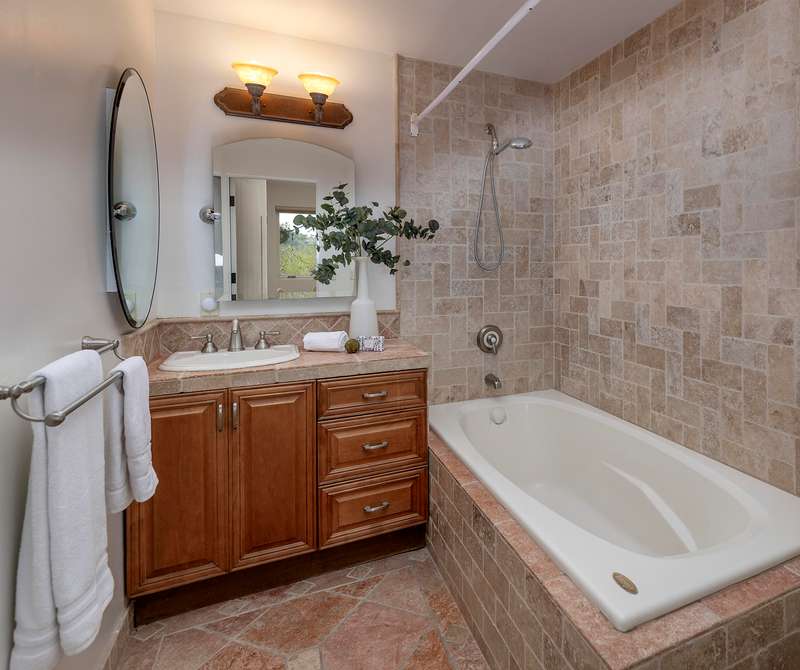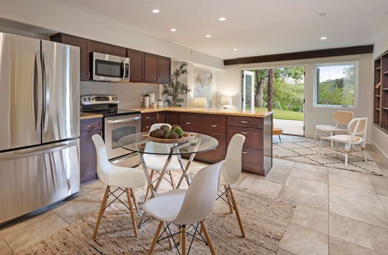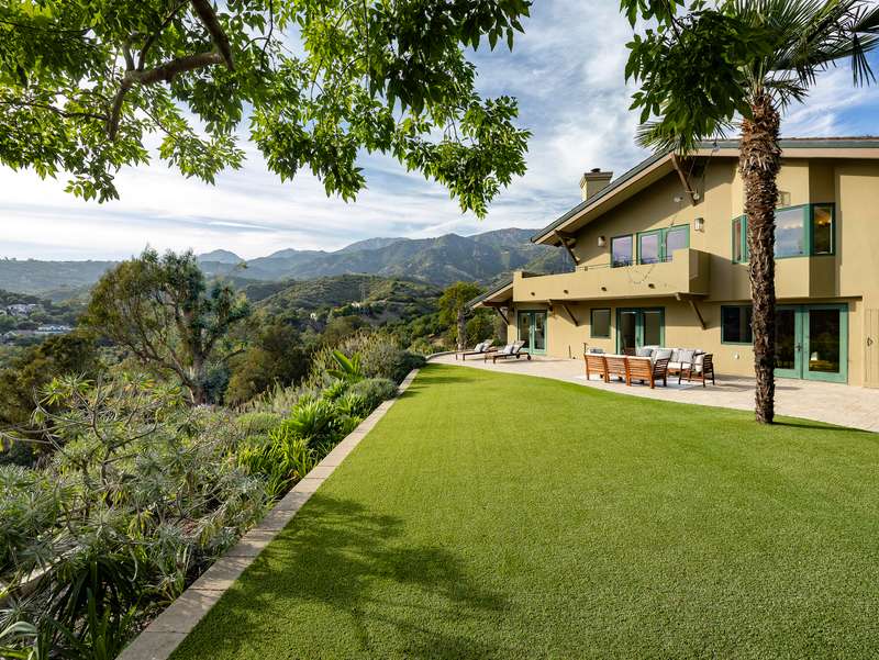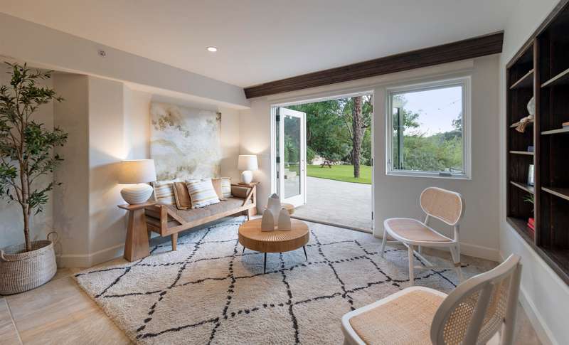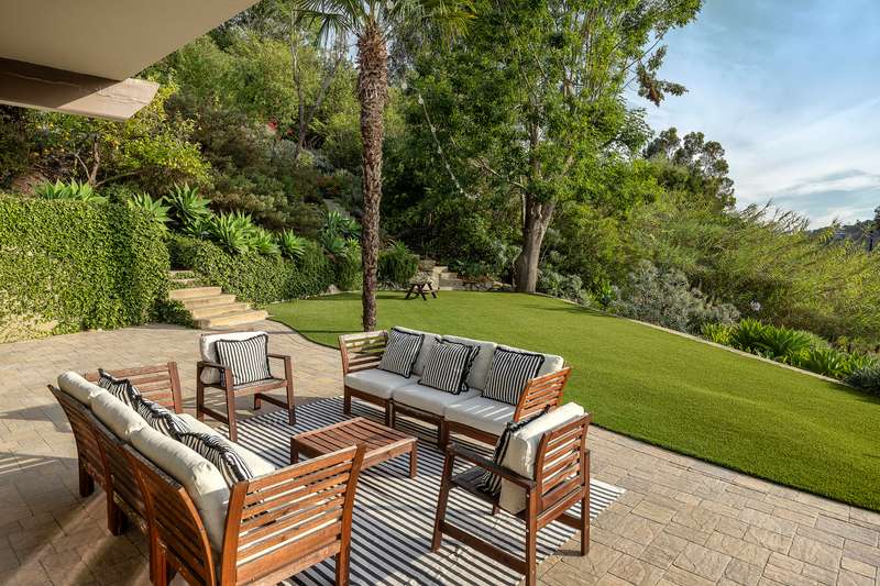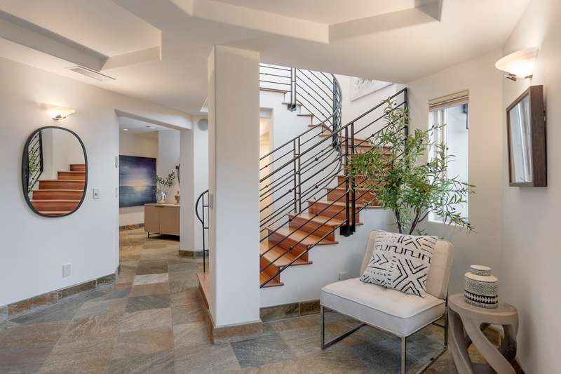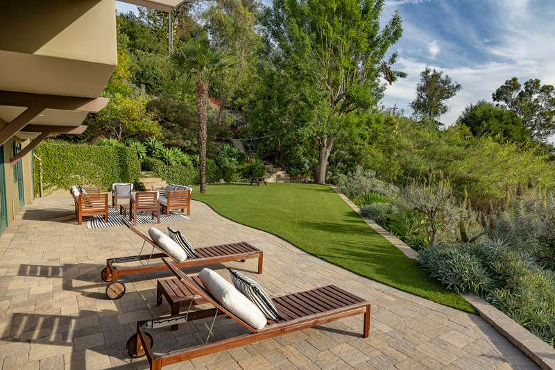 Designed with both relaxation and entertainment in mind, the outdoor spaces have been meticulously upgraded with beautifully hardscaped walls, stairways, and rock features. Fruit trees, custom low-voltage landscape lighting and irrigation enhance the lush landscaping, while paver walkways and turf create inviting yet drought tolerant outdoor living areas.