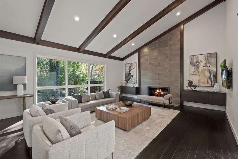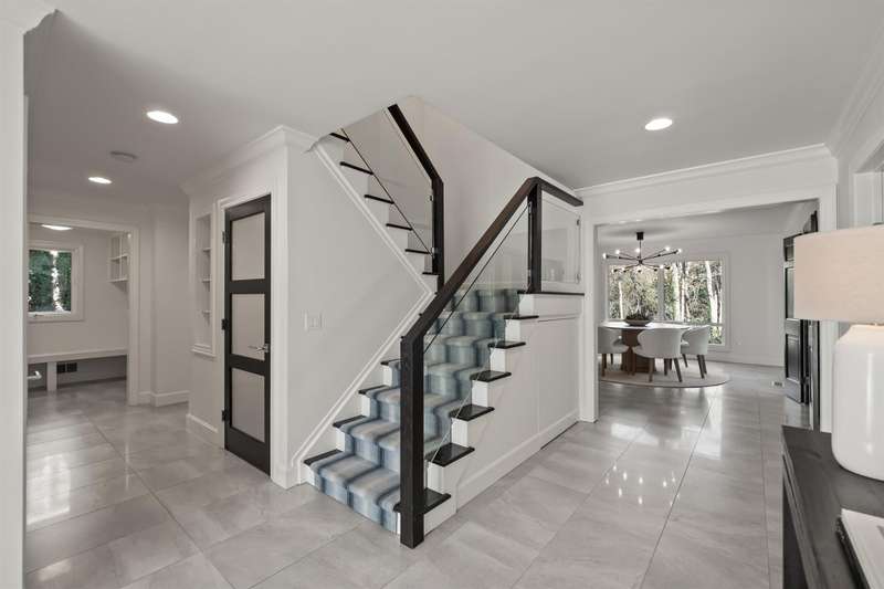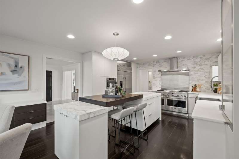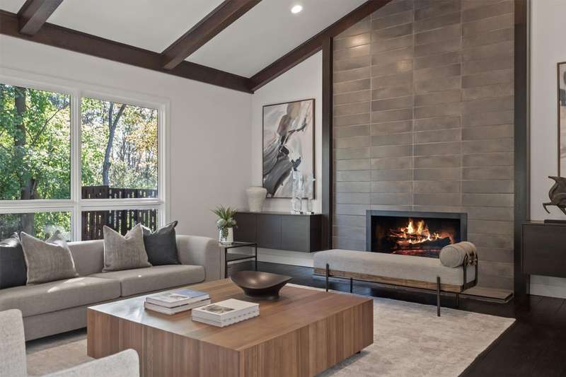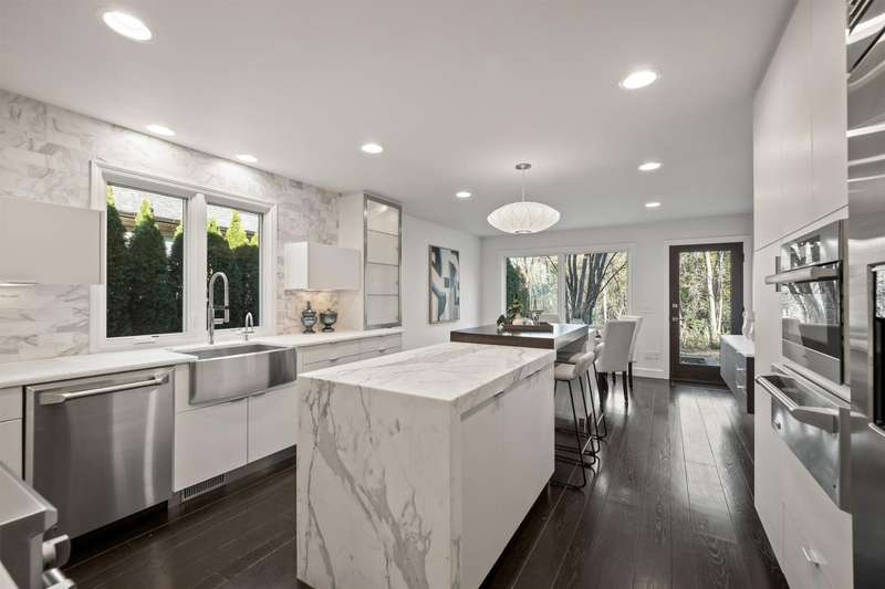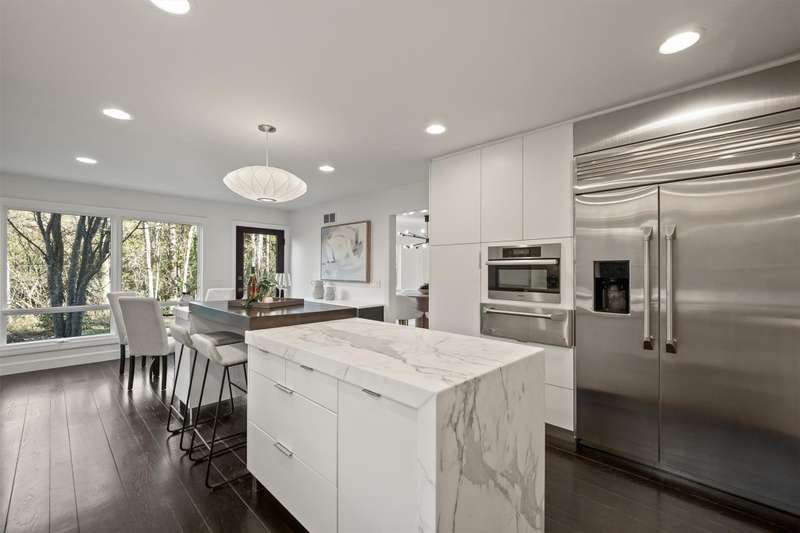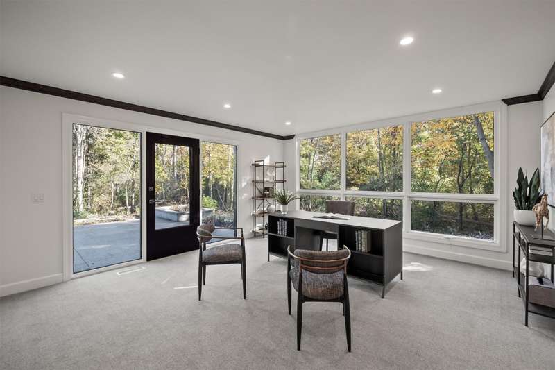 Modern elegance on one of the premier streets in Quarton Lake Estates! Just over the bridge, north of Oak, on Lakeside Drive. Impeccably designed & completely renovated, blending mid-century & modern refinement. Set on a serene lot with the side & back yards surrounded by protected woodlands owned by the City of Birmingham, with the Rouge River flowing through it. Circular driveway, glass paneled garage door & large glass front door with sidelights are distinguishing first impressions. Two-story foyer opens to living room featuring a fireplace flanked by John Morgan built-ins & a vaulted, beamed ceiling. Sliding frosted glass doors open to the adjacent library/den. Floor-to-ceiling windows in the library & large living room windows, all with southern exposure, create a sun-filled interior. Stunning John Morgan Perspectives kitchen. Refinished marble countertops, marble tile backsplash. GE Monogram gas range, four burners, a grill & griddle. GE Monogram refrigerator, warming drawer & dishwasher, Miele microwave. Marble waterfall island, butcher block center, seats four. Stainless steel farmhouse sink. Adjacent room for a breakfast nook or cozy seating area with access to the deck. Glass staircase banister. Second-floor loft sitting area. Large primary suite, John Morgan spa-like bath. Oversized steam shower, tub, water closet. An enormous walk-in closet could accommodate a large clothing island, desk, or exercise equipment. Marble coffee/wine bar, beverage fridge. Two additional bedrooms and two baths complete the upstairs. 2nd floor full-size stackable laundry. Endless possibilities in the 1,800 SF in the unfinished LL, with additional laundry. Exposed aggregate patio overlooking the wooded backdrop. New roof 2023, HVAC 2024. Birmingham Schls: Quarton, Derby, Seaholm. Step out your front door to the walking trail around Quarton Lake. A short stroll to all the dining & shopping Downtown Birmingham has to offer. Home shows like new construction. Pristine condition!