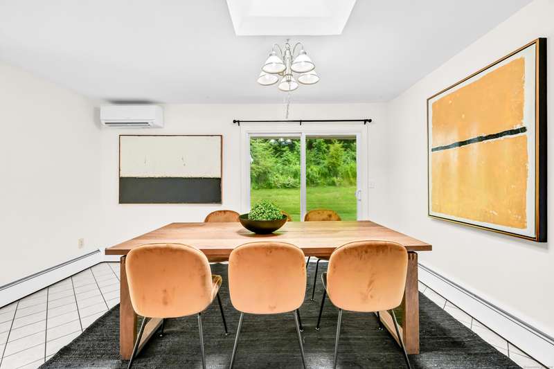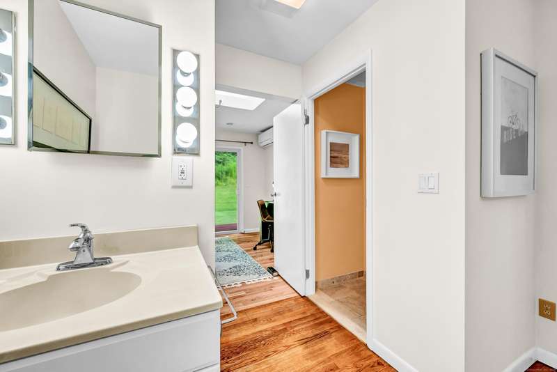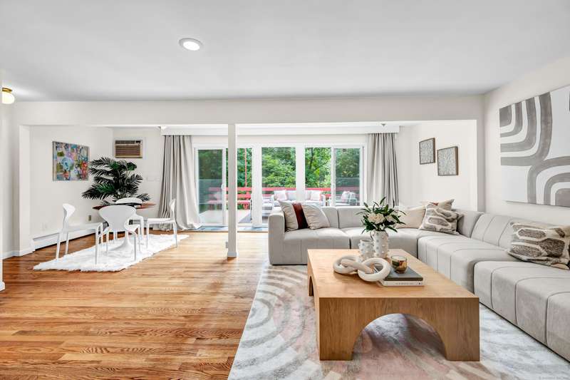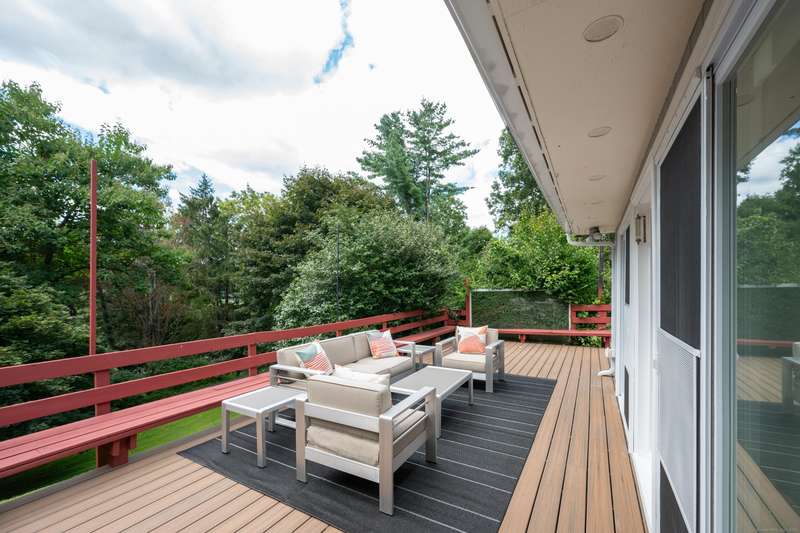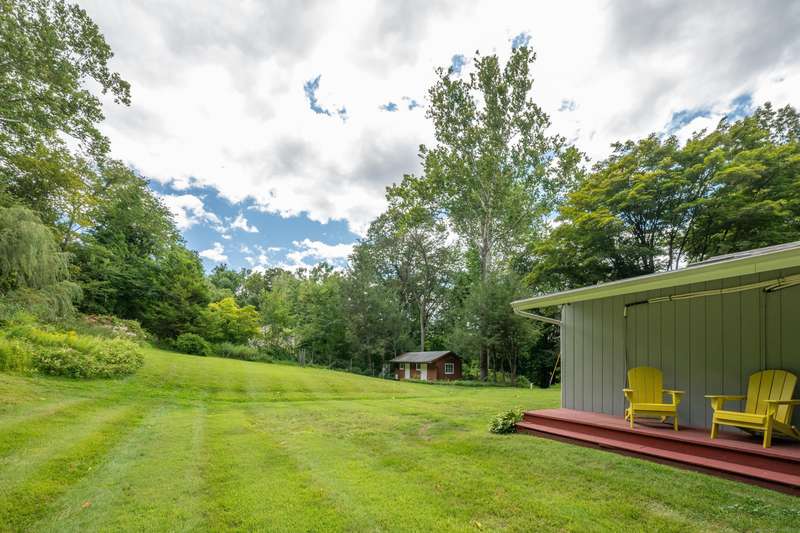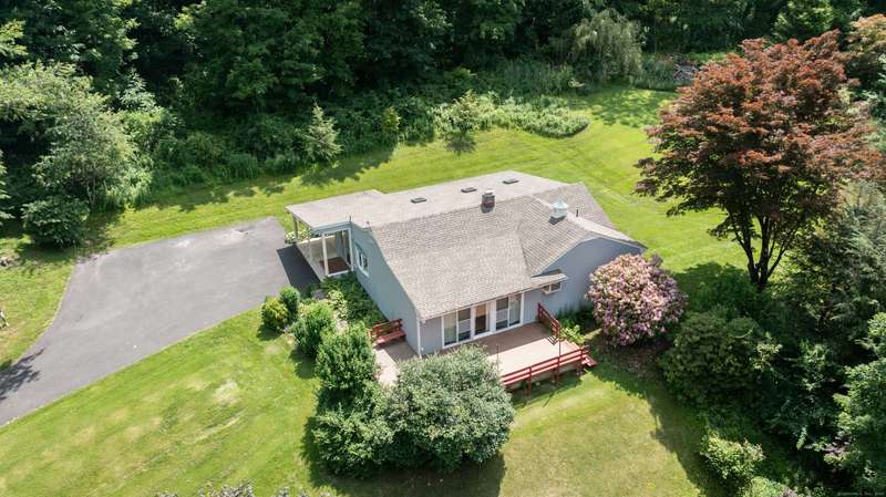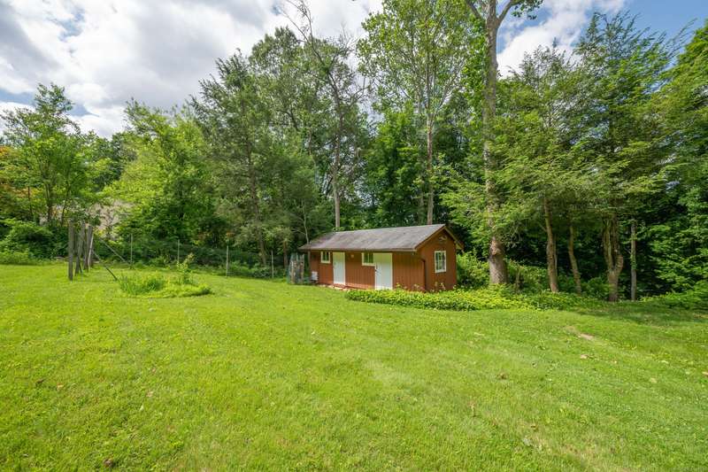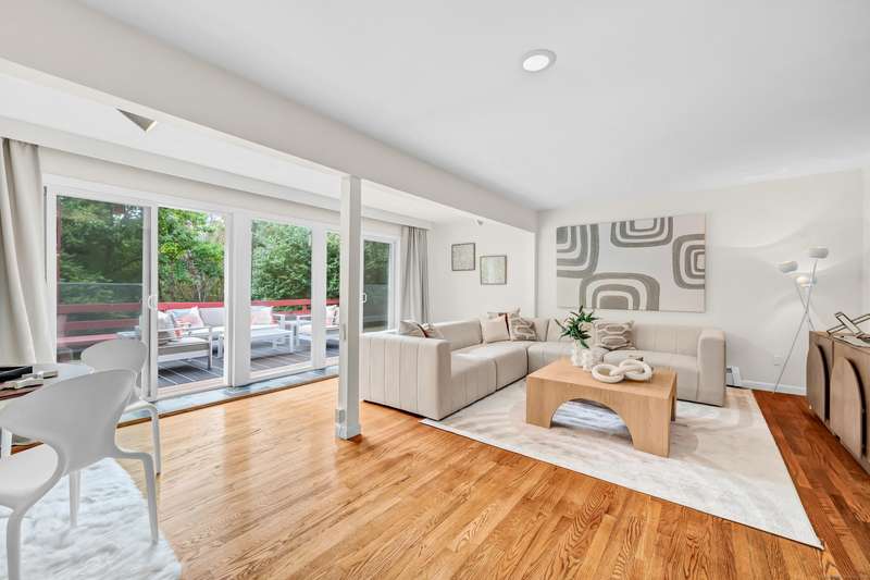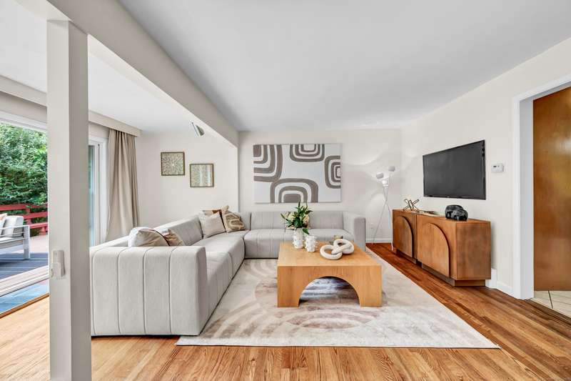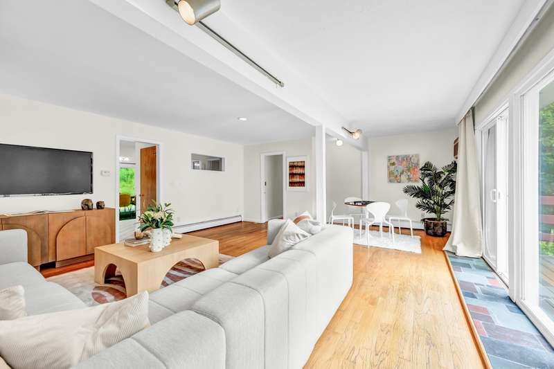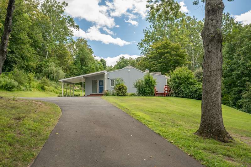 Tucked away on a private lot surrounded by woods with views of nature all around, you'll find this lovely Mid-Century 3 bedroom Ranch style home. Charming features throughout with modern touches, including hardwood flooring and a cozy kitchen with picture window and breakfast/dining area with sliders to the back decking. The expansive living room offers a wall of windows and sliders to the sunny and private wrap-around decking. There are three bedrooms and two full bathrooms, one en-suite that steps out to the back yard as well. The lower level has tons of potential with multiple storage areas and a finished laundry room with convenient sink. Outside you'll find a carport, newer driveway with lots of room for guests and a large shed with space for chickens. The grassy, level yard has complete privacy with plenty of space for playing, a pool or gardening. Numerous recent improvements totaling over $100,000, including a newer septic system, driveway, AC units, sliding doors, refinished h