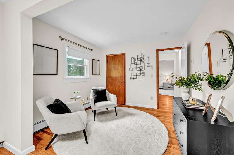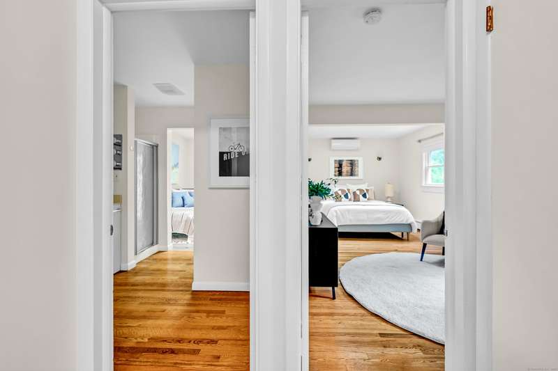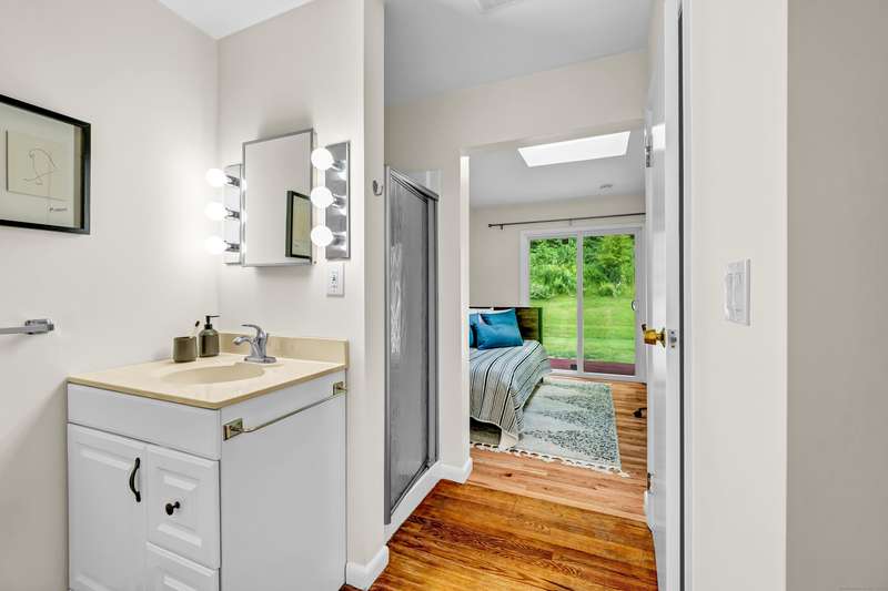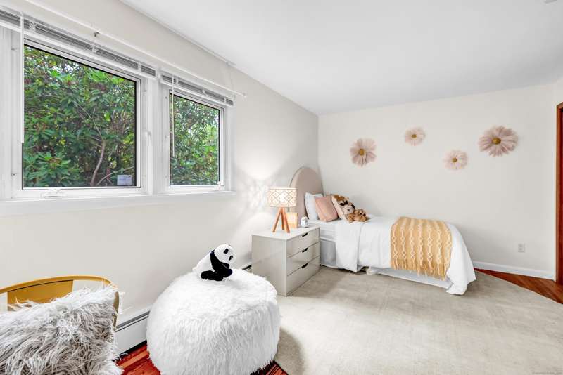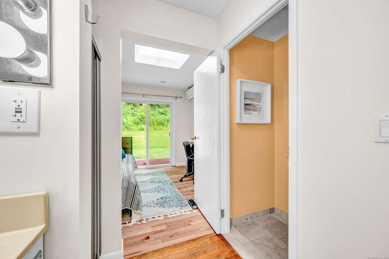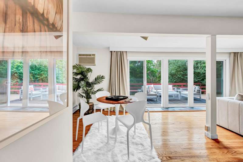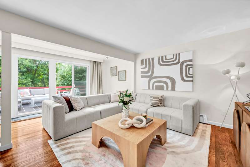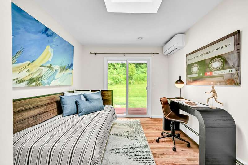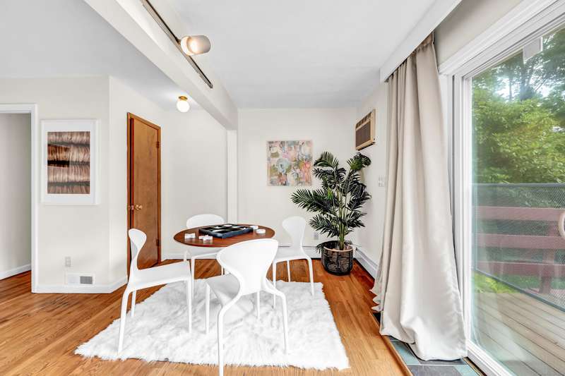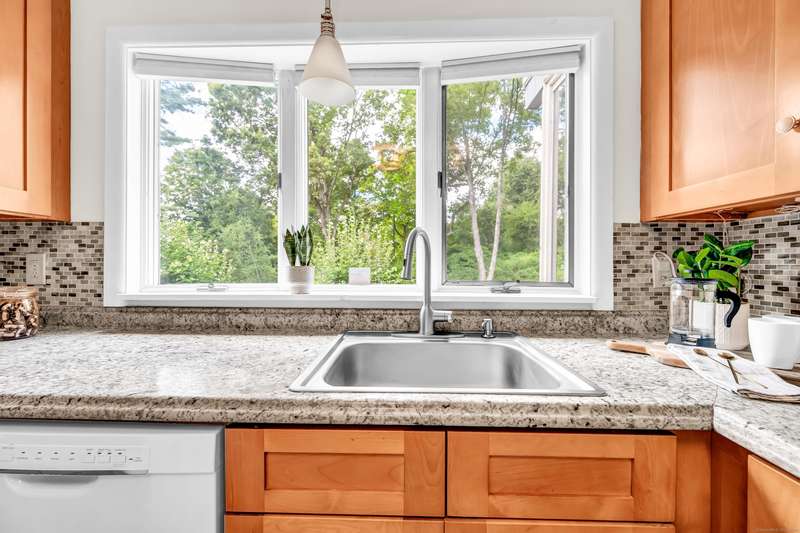 Tucked away on a private lot surrounded by woods with views of nature all around, you'll find this lovely Mid-Century 3 bedroom Ranch style home. Charming features throughout with modern touches, including hardwood flooring and a cozy kitchen with picture window and breakfast/dining area with sliders to the back decking. The expansive living room offers a wall of windows and sliders to the sunny and private wrap-around decking. There are three bedrooms and two full bathrooms, one en-suite that steps out to the back yard as well. The lower level has tons of potential with multiple storage areas and a finished laundry room with convenient sink. Outside you'll find a carport, newer driveway with lots of room for guests and a large shed with space for chickens. The grassy, level yard has complete privacy with plenty of space for playing, a pool or gardening. Numerous recent improvements totaling over $100,000, including a newer septic system, driveway, AC units, sliding doors, refinished h