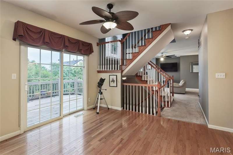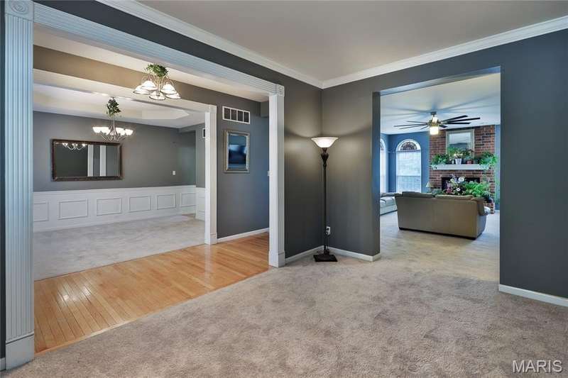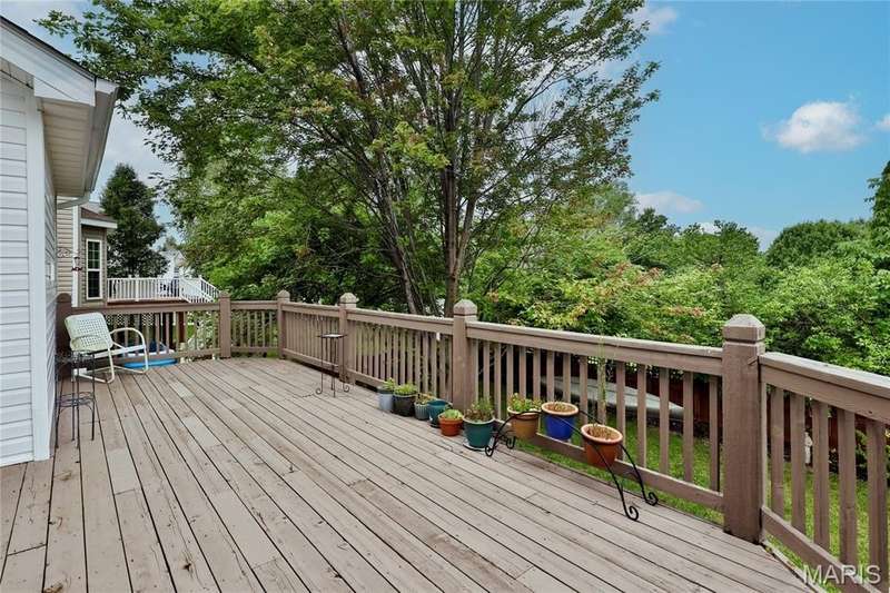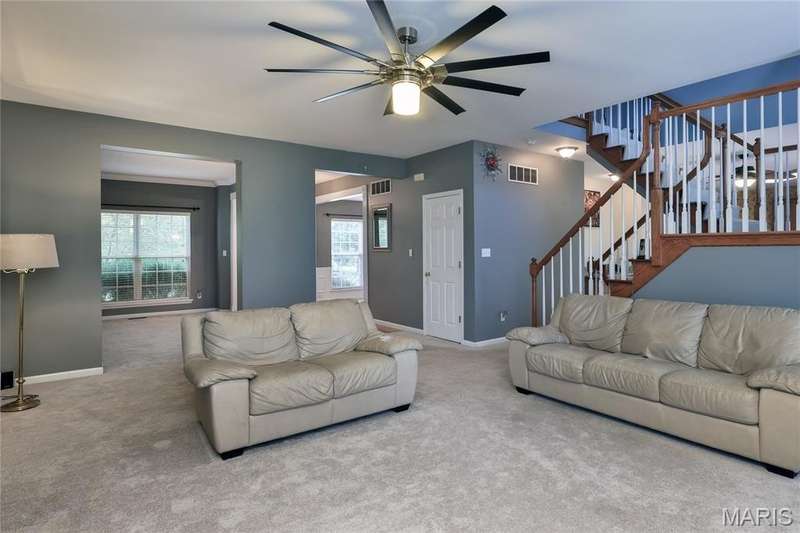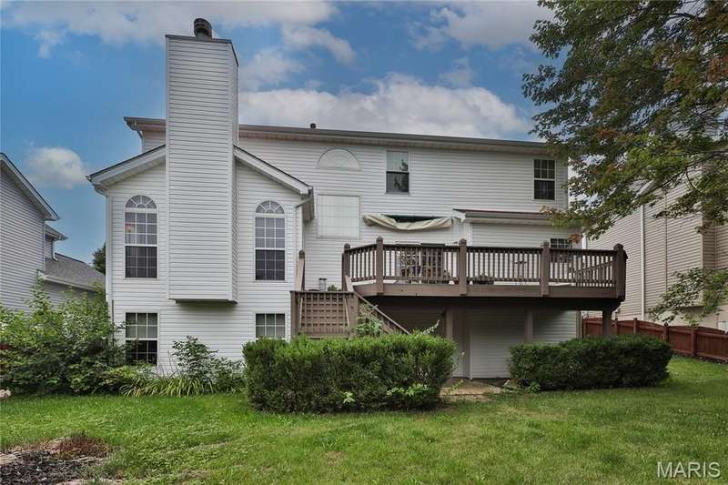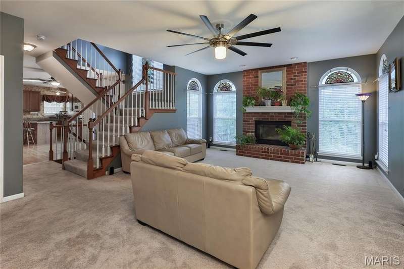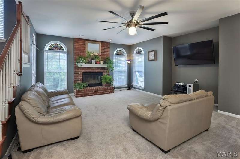 This popular floor plan is designed to welcome both large families and those who love to entertain. The inviting entry foyer is flanked by a formal dining room (9ft. main floor ceilings)—ideal for hosting large gatherings—and a versatile sitting room-enjoyed as a playroom, music room, or home office. The modified layout features an expanded family room that comfortably fits a massive sectional, complete with a wood-burning fireplace and abundant natural light. Rear spindled staircase leads to the breakfast room and kitchen, featuring a butterfly island, granite counters, planning desk and a charming corner window—overlooking the yard. Adjacent to the kitchen, you’ll find a spacious main-floor laundry and direct access to the 3 car attached garage. Love the outdoors? Step out onto the oversized deck—perfect for entertaining or relaxing—and enjoy the level, fully fenced backyard, ideal for kids and pets alike. Upstairs, begin at the landing with a massive primary suite offering a private luxury bath and a true walk-in closet. Three additional bedrooms feature large closets, plenty of natural light, and ceiling fans, sharing a full bath. The lower-level recreation room is perfect for family movie nights! Peace of mind comes with the HVAC (2020) and 2024 updates: roof, siding, gutters, and garage door. Plus, close proximity to all the schools, Fort Zumwalt Park, Westhoff Park, Alligator's Creek Aquatic Center, Car Shield Field (O'Fallon Hoots), and Heritage and Freedom Festival.