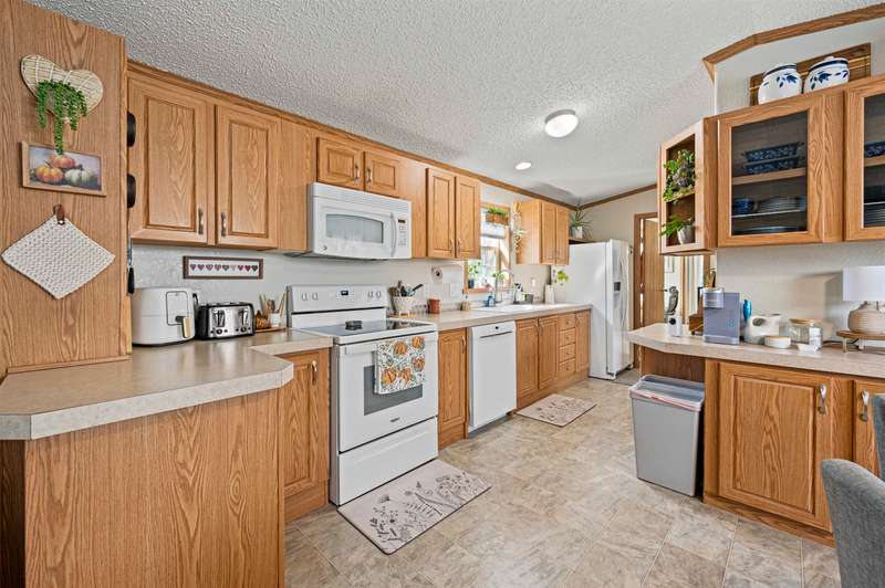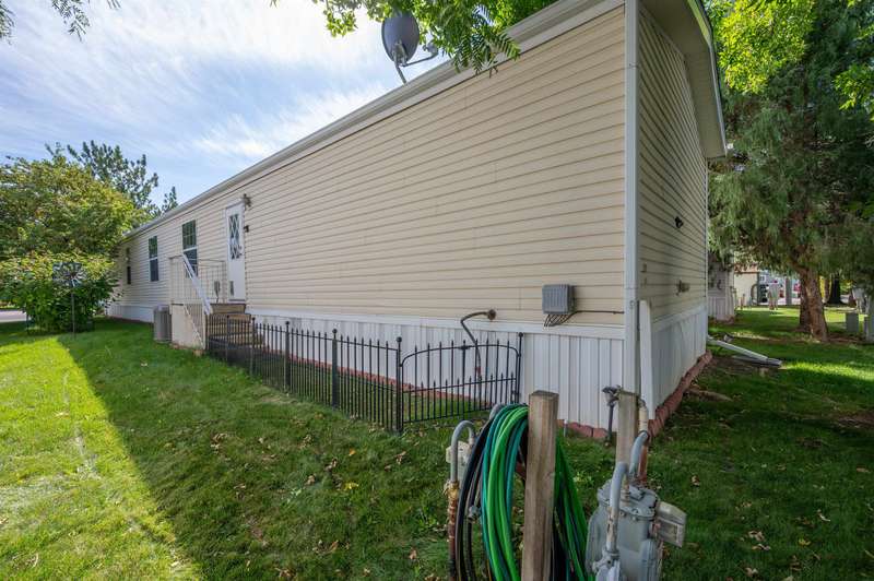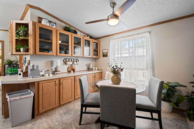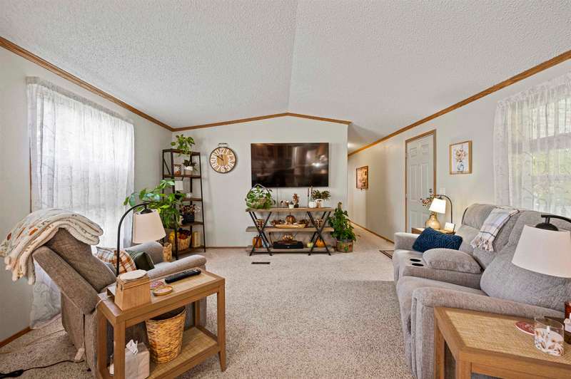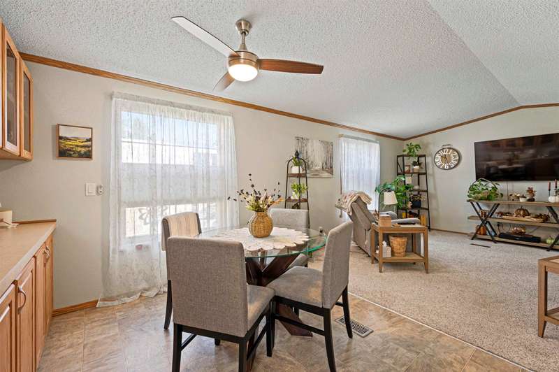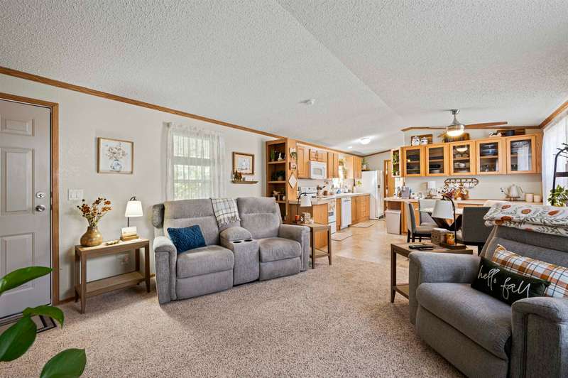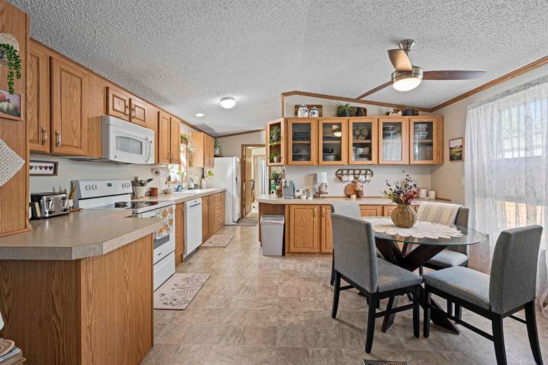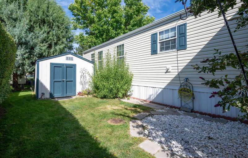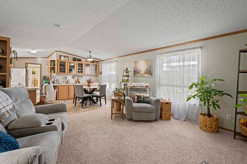 Welcome home! This 3-bedroom, 2-bathroom mobile home offers comfort, functionality, and plenty of natural light. The open-concept kitchen features abundant cabinet space, a farmhouse sink, an electric range/oven, microwave, refrigerator, and disposal—all included, with newer appliances as well. The home has also been freshly painted and includes newer heating and air conditioning, creating a move-in ready space. The large master suite has a generous walk-in closet and a spacious master bathroom. Step outside to enjoy a private patio with shades and new deck carpet—perfect for relaxing or entertaining. Additional features include manual sprinklers set every other day and park-maintained tree trimming, giving you more time to enjoy your home. A large shed provides extra storage. The subdivision offers expansive green space, a park, a community garden, and rentable RV space. Don’t miss this opportunity—schedule your showing today!