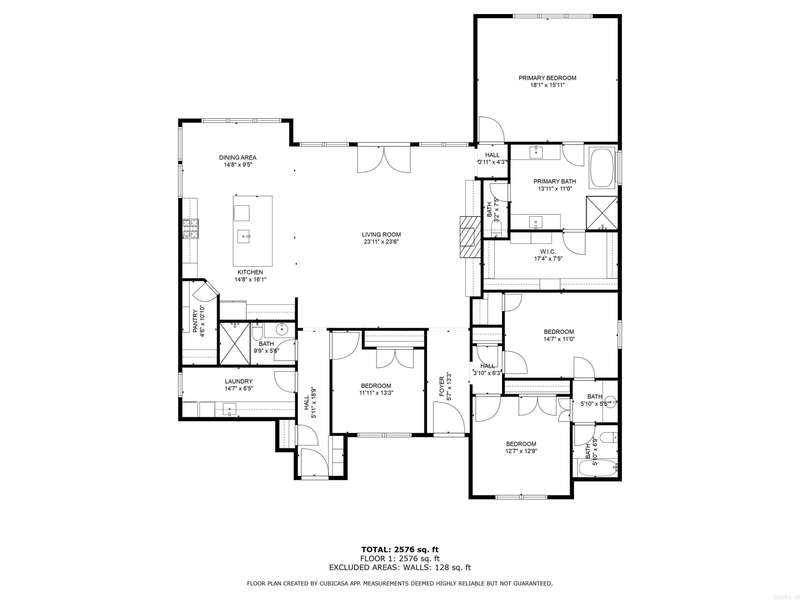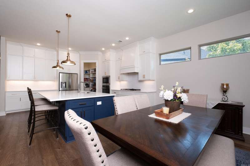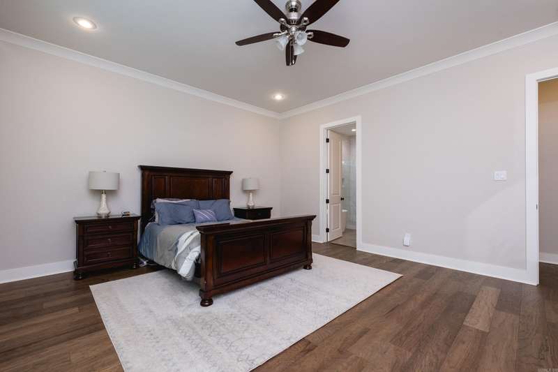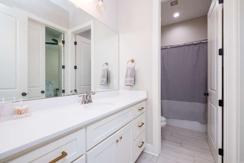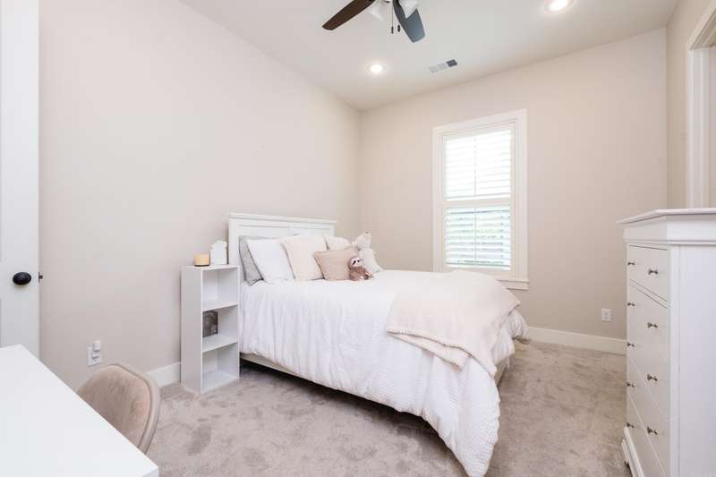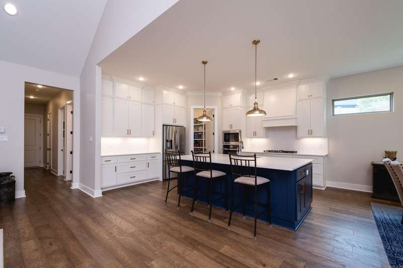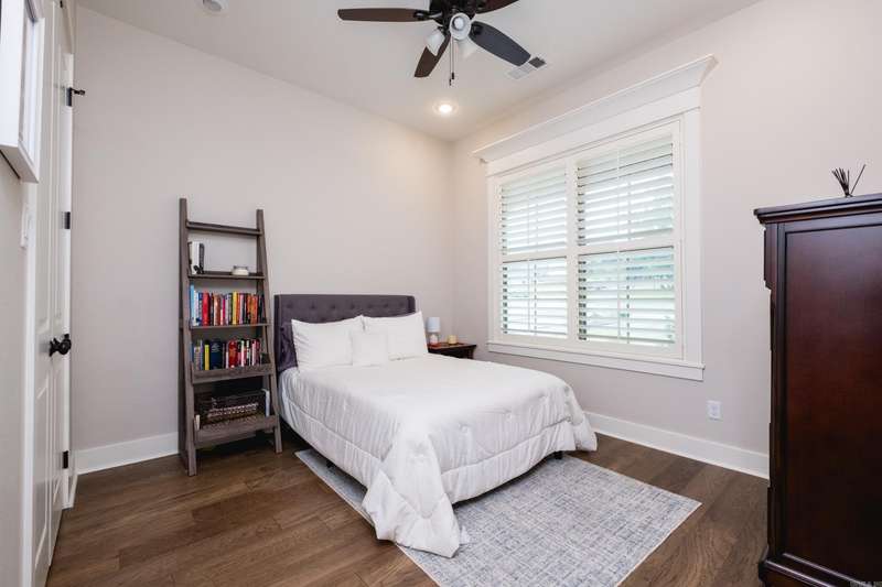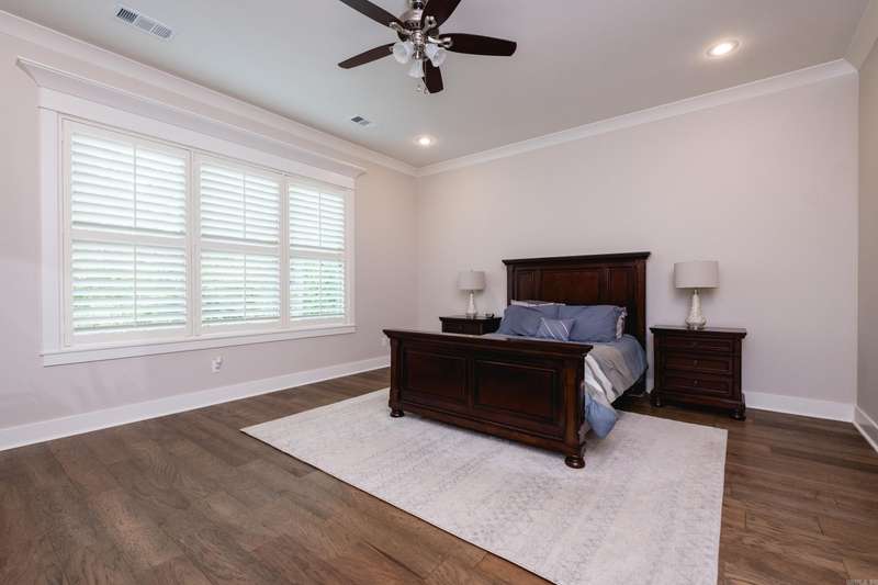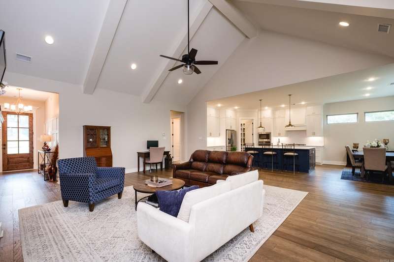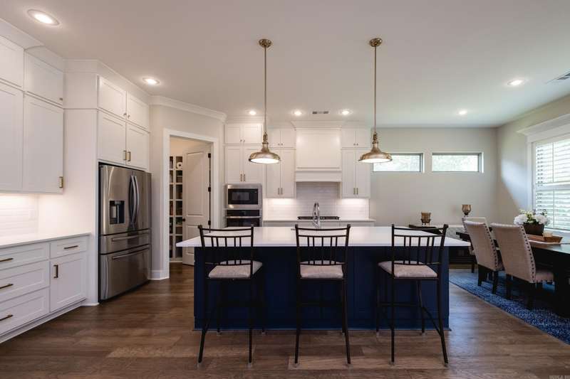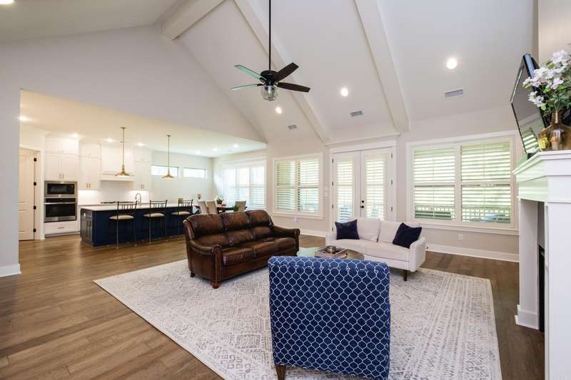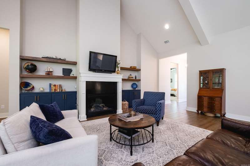Wonderful like new 2022 brick one level with plantation shutters and a smart, open layout. Beautiful wood floors in living areas, carpet in bedrooms, and tile baths. Vaulted great room with gas fireplace, built-ins, and French doors to a covered deck overlooking green space. Chef’s kitchen features a large island with seating, gas cooktop, wall ovens, walk-in pantry, and a dining area that fits a large table within the open space. Spacious primary suite includes a spa style bath and oversized closet. Two guest bedrooms share a bath; a third is set apart near another full bath, ideal for guests or an office. Hallway storage closets, family sized laundry, and drop zone from the two-car garage with walk up attic storage. Under-house storage adds even more space. Come see!