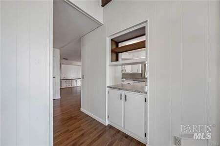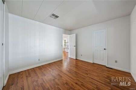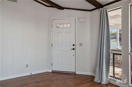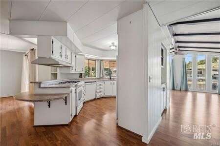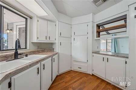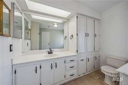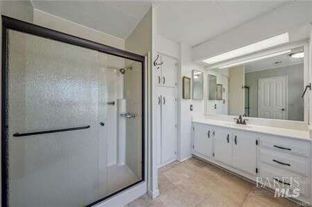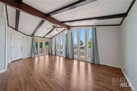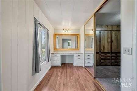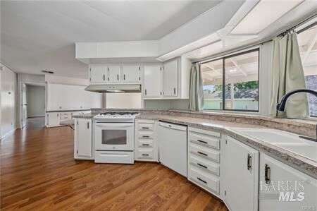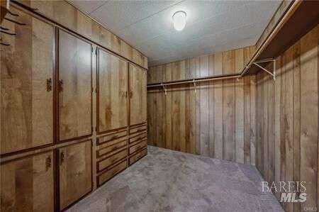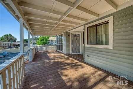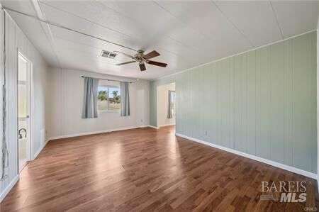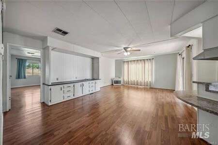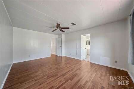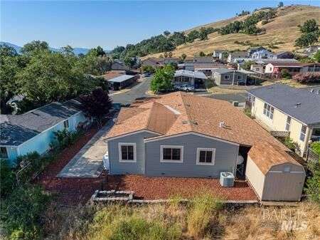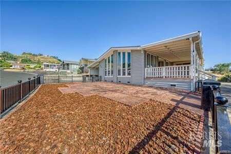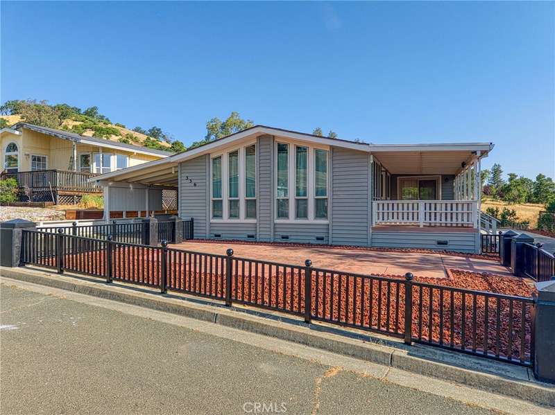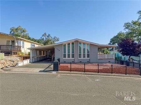 This 1850 sq ft home in Walnut Estates features two driveways and a front patio with a wrought iron fence. The bright, open floor plan includes a living room and family room that open to a covered deck with a partial lake view. The kitchen has a propane range, dishwasher, pantry, pass-through to the dining area, and a breakfast bar. The laundry room provides access to the hall bathroom with a walk-in shower, which is also accessible from the first bedroom. The primary bedroom includes a walk-in closet, dressing room, and an en-suite bathroom with a walk-in shower and soaking tub overlooking the open space. The home has central heating and air conditioning, plus a monitor heater. There is covered parking with a storage shed and additional open, flat parking. Located near the lake, residents can enjoy water sports and outdoor activities, and the Lakeport community offers local events