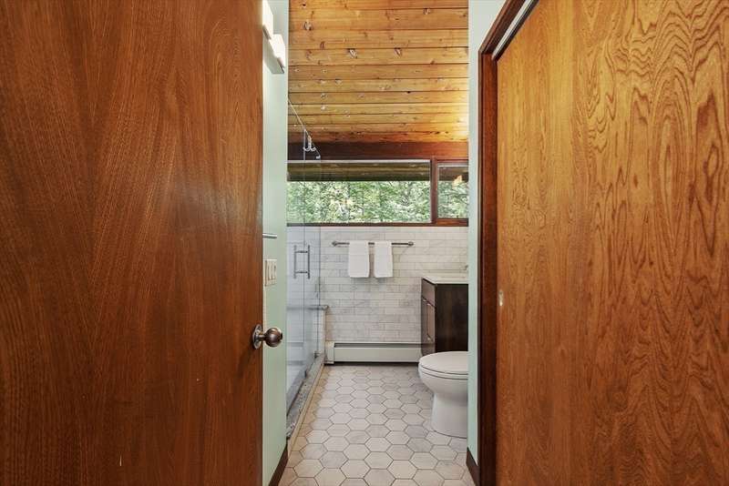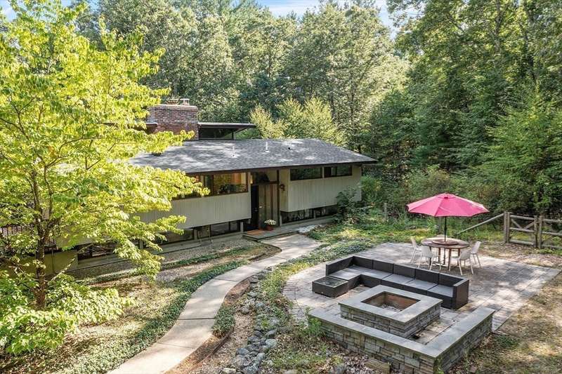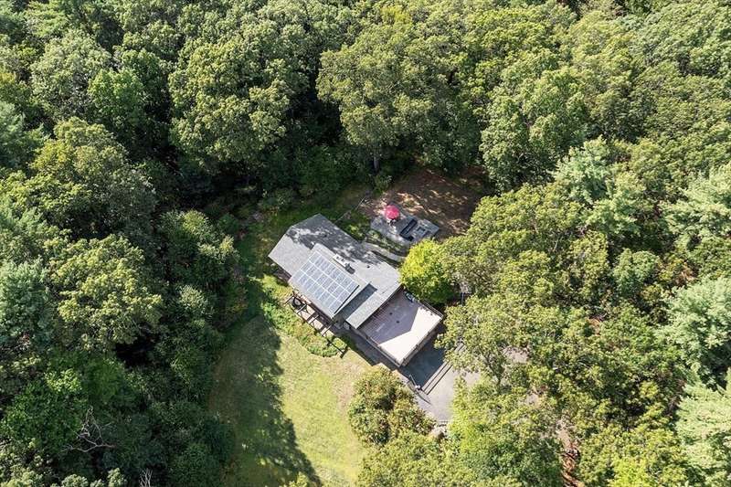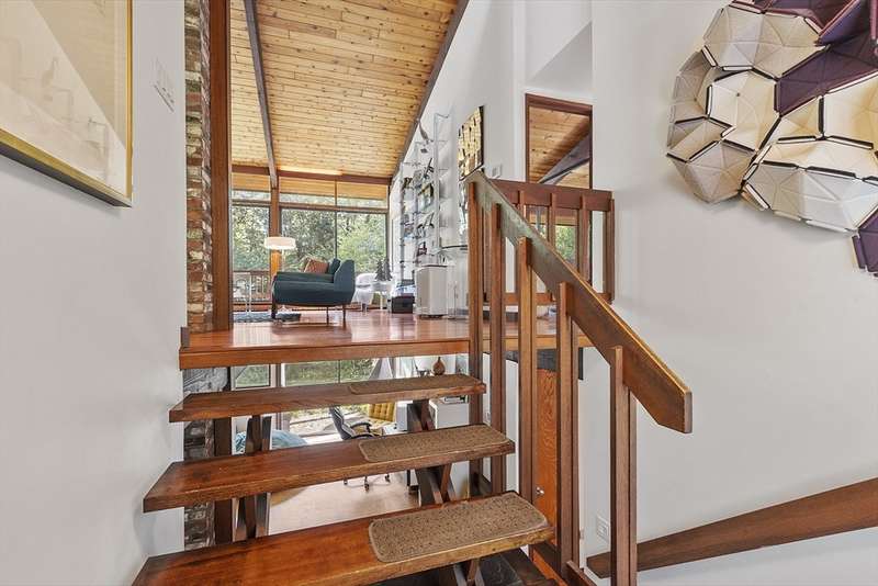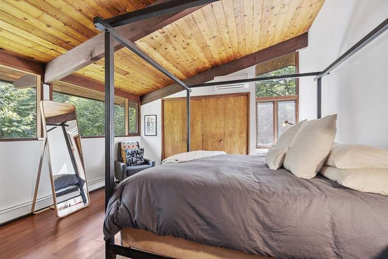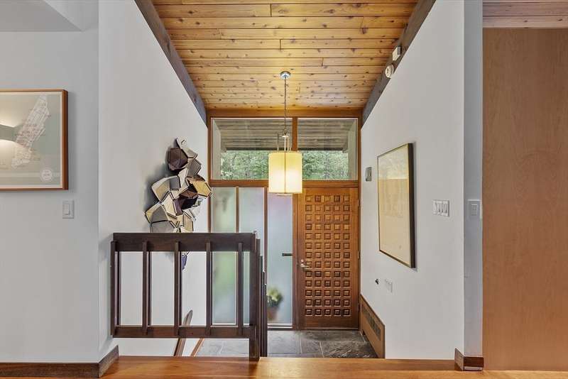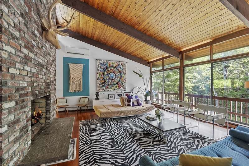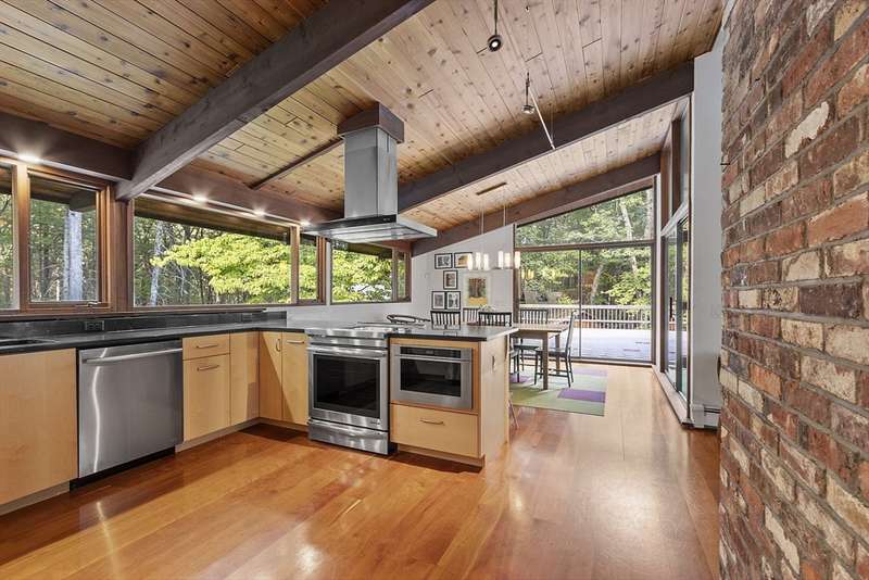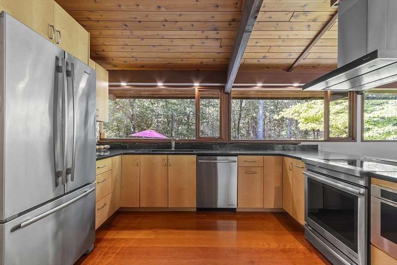 Tucked away in a serene natural setting, this contemporary 4-bedroom, 2-bath deck house is privately set on over 6 acres offers the perfect blend of modern design and tranquil living. Flooded with natural light, the open-concept first floor showcases soaring ceilings, warm wood accents, and expansive windows. A sunroom off the oversized deck provides a seamless space for entertaining, while the balcony offers peaceful views of the lush yard below perfect for morning coffee or quiet evenings. The chef s kitchen is a true centerpiece, featuring high-end Jenn-Air stainless steel appliances, sleek cabinetry, and ample prep space to inspire your culinary creations. With privacy, space, and style all in one, this home is a rare retreat where contemporary living meets nature s calm.