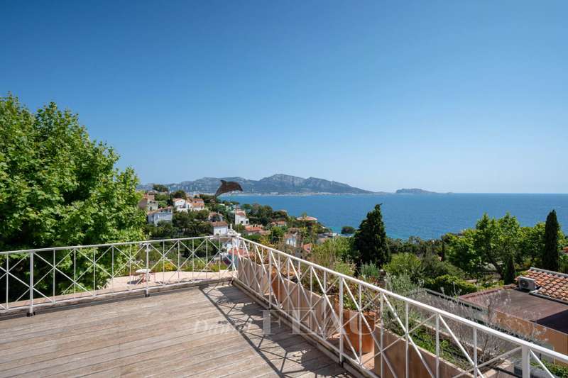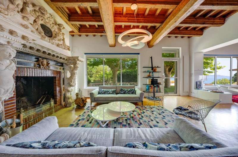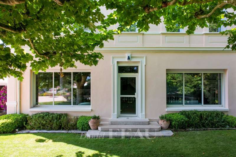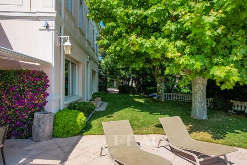 Bompard neighbourhood. This elegant 19th century mansion set in about 1700 sqm of leafy grounds commands a panoramic sea view. The 260 sqm main house includes a double living/reception room with a fireplace enjoying a view of the Mediterranean, and a spacious kitchen (both opening onto the garden). Upstairs are a master suite with a bathroom, a wc and a private terrace enjoying a sea view, two further bedrooms each with a shower room and wc, and a dressing room. The top floor comprises a 4th bedroom also enjoying a sea view, a shower room and a wc. With an overflow swimming pool and a jacuzzi. With a 53 sqm guest house comprising a living room opening onto a terrace, a kitchen, and two bedrooms each with a shower room. With a second 48 sqm two-room annex, a garage and parking space for several cars.
