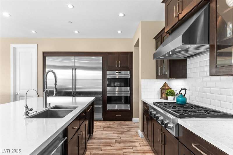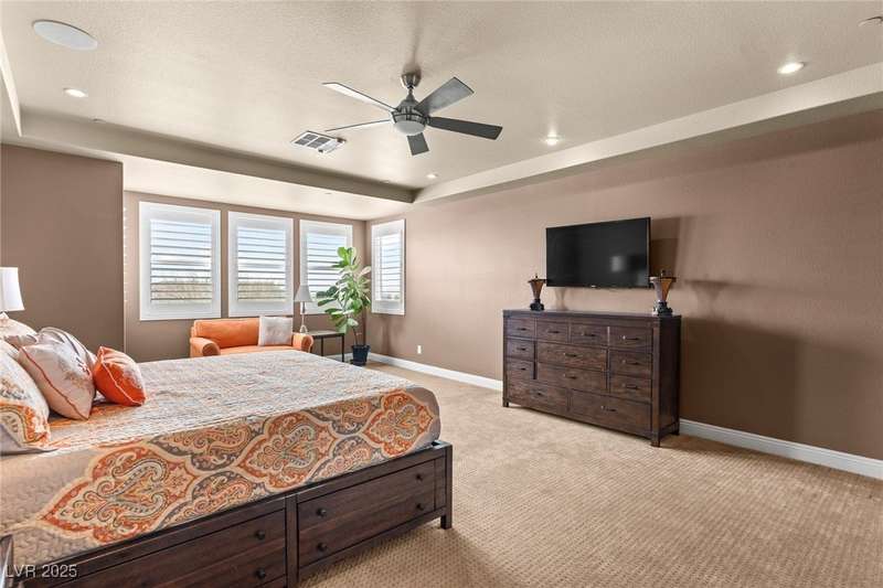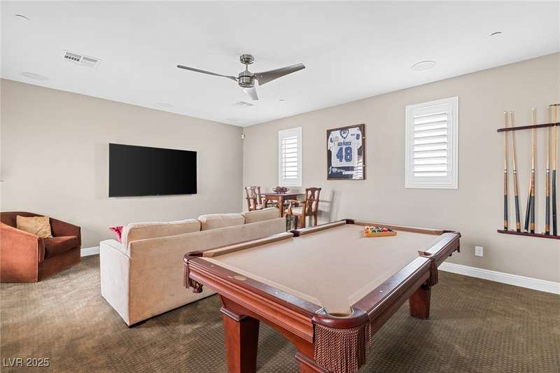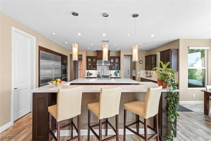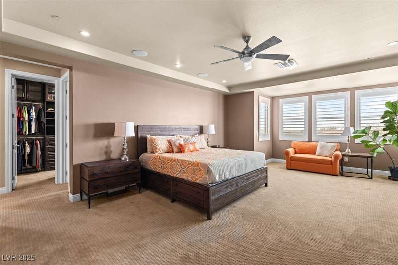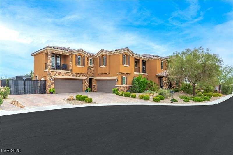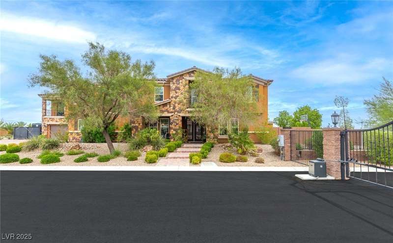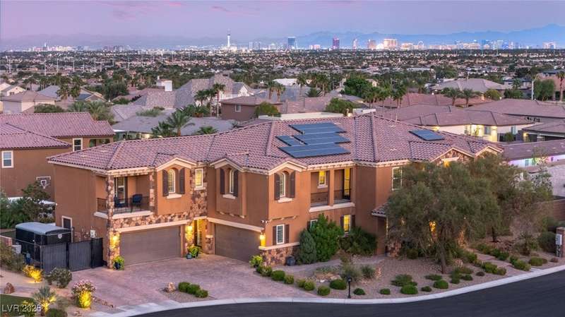 Welcome to a truly extraordinary estate in the heart of Lone Mountain, built for entertaining, comfort & sweeping Strip views. On a half-acre lot, this two-story home features a rare 630-sq ft casita w/double-door entry, Murphy bed, kitchenette, living room & full bath-ideal for guest or multi-generational living. The main home boasts plantation shutters, custom lighting & refined finishes. A gourmet kitchen shines w/dual quartz island, Sub-Zero fridge, Wolf appliances, two dishwashers, double oven & dual pantries. Flexible dual-primary layout: downtains suite w/spa bath & backyard access; upstairs suite w/retreat, loft, reading nook & balconies. Additional spaces: media room w/wet bar, office, formal living/dining, & family room w/tray ceilings. The backyard offers a saltwater pool w/solar heat, pull-thru garage, outdoor kitchen, travertine, fireplace lounge, sports & basketball courts, putting green, plus RV gate & 4-car epoxy garage. Owned solar panels enhance efficiency.