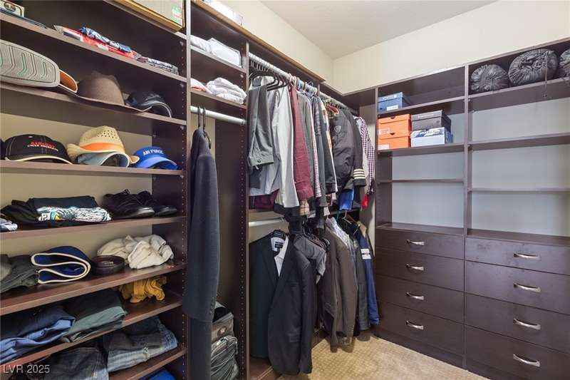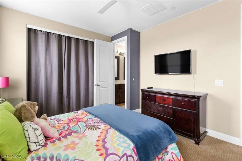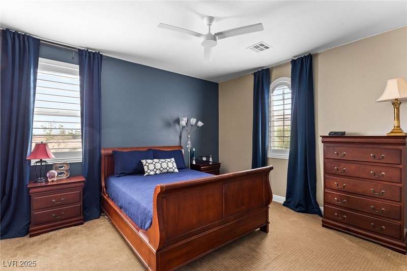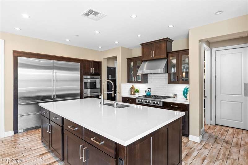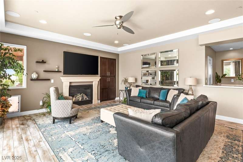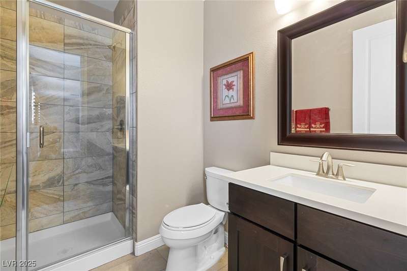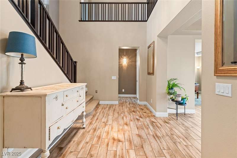 Welcome to a truly extraordinary estate in the heart of Lone Mountain, built for entertaining, comfort & sweeping Strip views. On a half-acre lot, this two-story home features a rare 630-sq ft casita w/double-door entry, Murphy bed, kitchenette, living room & full bath-ideal for guest or multi-generational living. The main home boasts plantation shutters, custom lighting & refined finishes. A gourmet kitchen shines w/dual quartz island, Sub-Zero fridge, Wolf appliances, two dishwashers, double oven & dual pantries. Flexible dual-primary layout: downtains suite w/spa bath & backyard access; upstairs suite w/retreat, loft, reading nook & balconies. Additional spaces: media room w/wet bar, office, formal living/dining, & family room w/tray ceilings. The backyard offers a saltwater pool w/solar heat, pull-thru garage, outdoor kitchen, travertine, fireplace lounge, sports & basketball courts, putting green, plus RV gate & 4-car epoxy garage. Owned solar panels enhance efficiency.