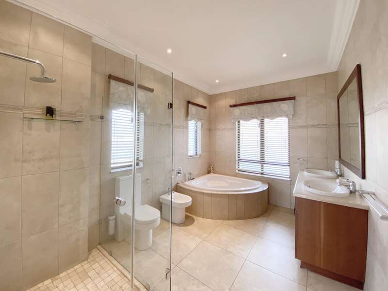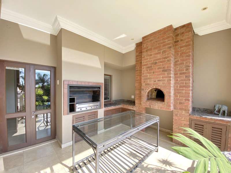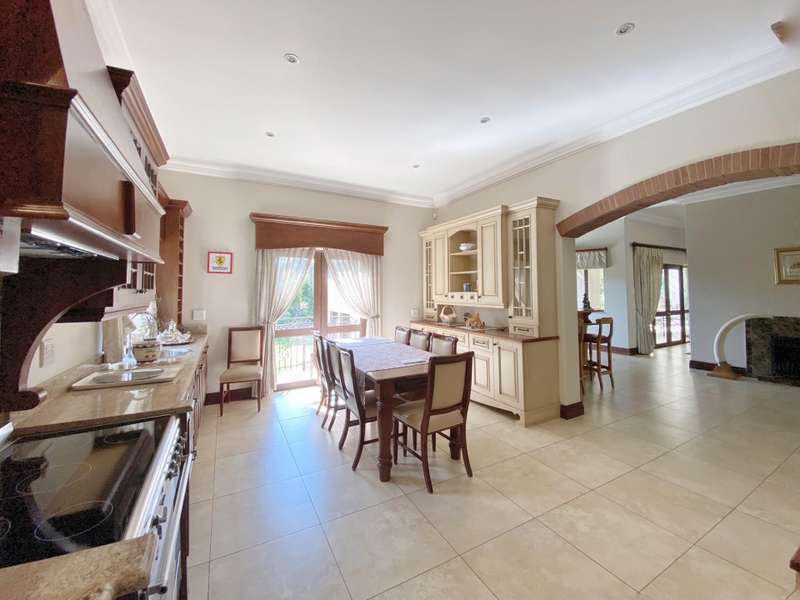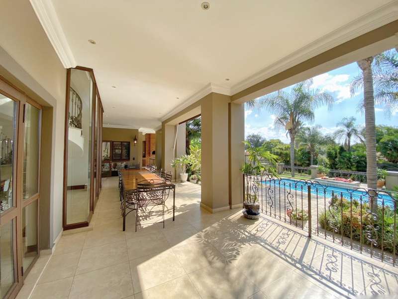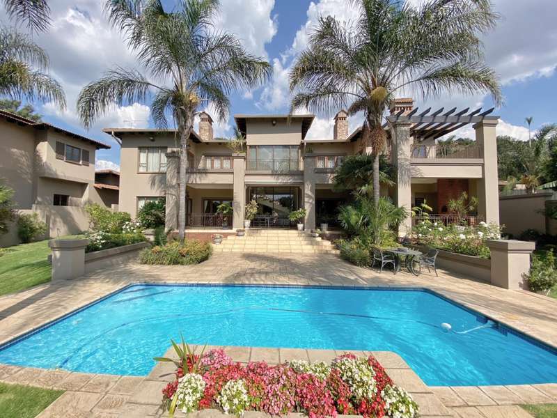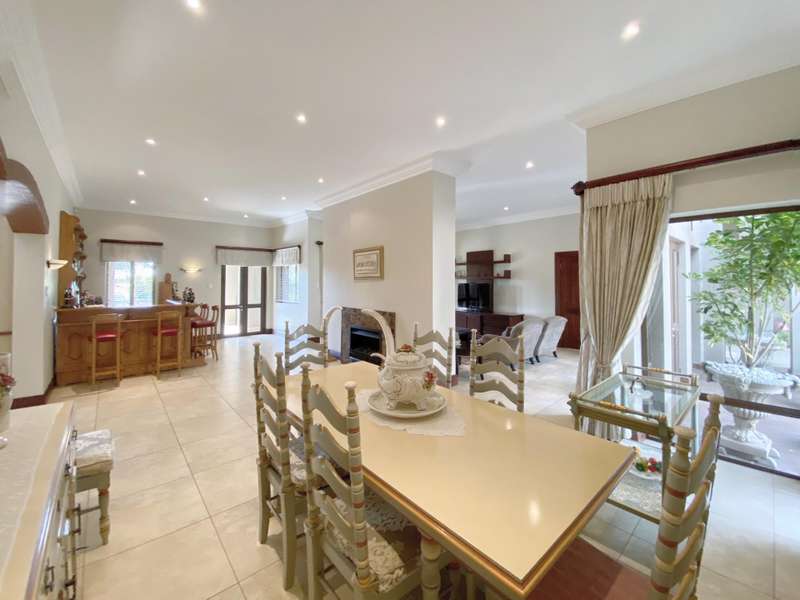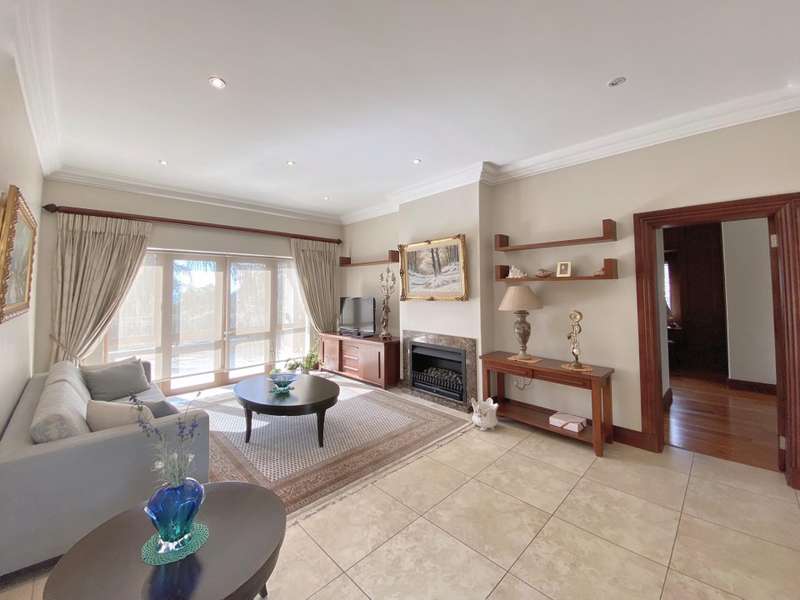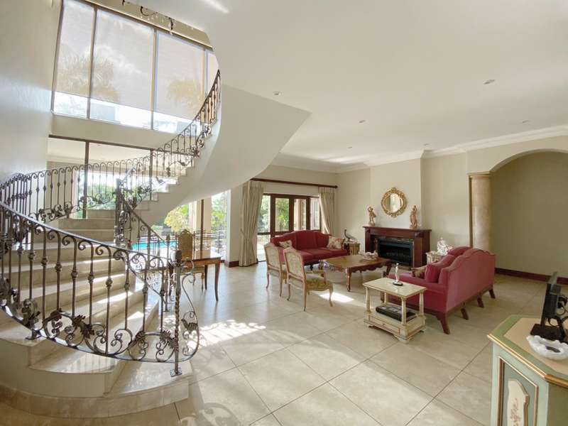 This palatial residence is one for the connoisseur seeking an elite lifestyle coupled with grand family living. Set on landscaped surrounds - with irrigation - and a sparkling pool, this well-proportioned residence welcomes family through a double entrance leading onto the formal lounge with spiral staircase and gas fireplace. Adjacent to the lounge is the open plan family room flowing effortlessly onto the dining area with fitted bar. The pristine kitchen is complimented with solid wood finishes, Quartz tops and plentiful cupboards space to delight the growing family. There is also a separate scullery and pantry leading off from the kitchen. Upstairs can be found a second family room with gas fireplace and doors leading onto the balcony offering beautiful treetop views. The 3 bedrooms are located upstairs with the fourth bedroom located downstairs with its own en suite. The 3 bathrooms are modern with high gloss finishes and solid wood doors. With a bright covered patio featuring a built-in braai and pizza oven overlooking the tranquil surrounds, automated garaging for 4 cars, excellent security and an immaculate interior completes this refined, elegant residence!