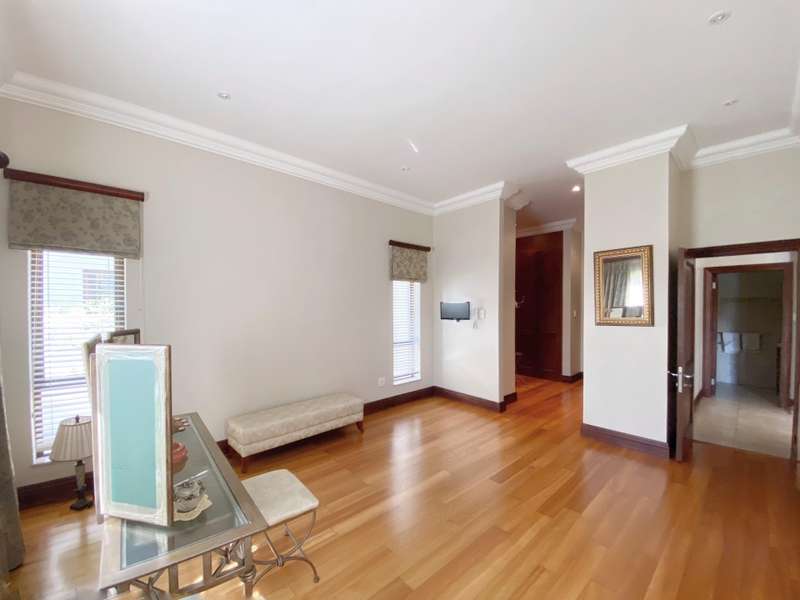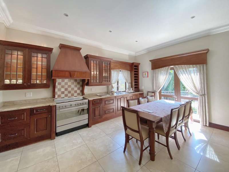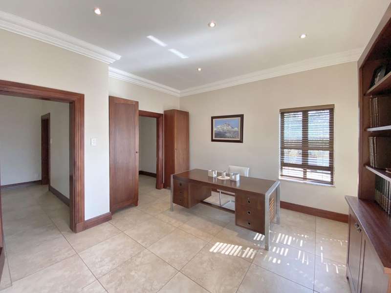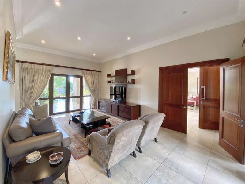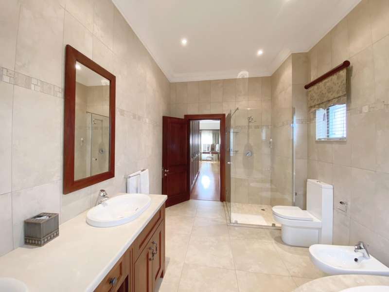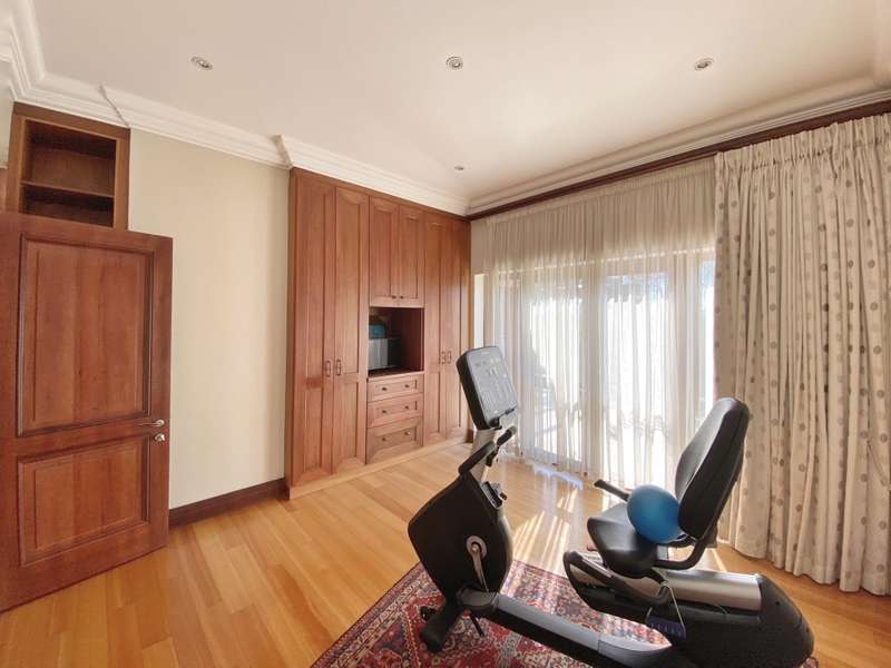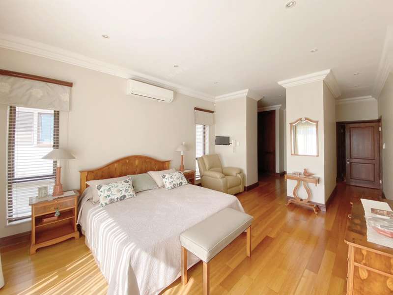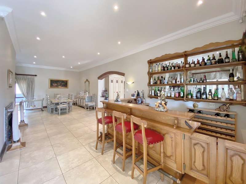 This palatial residence is one for the connoisseur seeking an elite lifestyle coupled with grand family living. Set on landscaped surrounds - with irrigation - and a sparkling pool, this well-proportioned residence welcomes family through a double entrance leading onto the formal lounge with spiral staircase and gas fireplace. Adjacent to the lounge is the open plan family room flowing effortlessly onto the dining area with fitted bar. The pristine kitchen is complimented with solid wood finishes, Quartz tops and plentiful cupboards space to delight the growing family. There is also a separate scullery and pantry leading off from the kitchen. Upstairs can be found a second family room with gas fireplace and doors leading onto the balcony offering beautiful treetop views. The 3 bedrooms are located upstairs with the fourth bedroom located downstairs with its own en suite. The 3 bathrooms are modern with high gloss finishes and solid wood doors. With a bright covered patio featuring a built-in braai and pizza oven overlooking the tranquil surrounds, automated garaging for 4 cars, excellent security and an immaculate interior completes this refined, elegant residence!