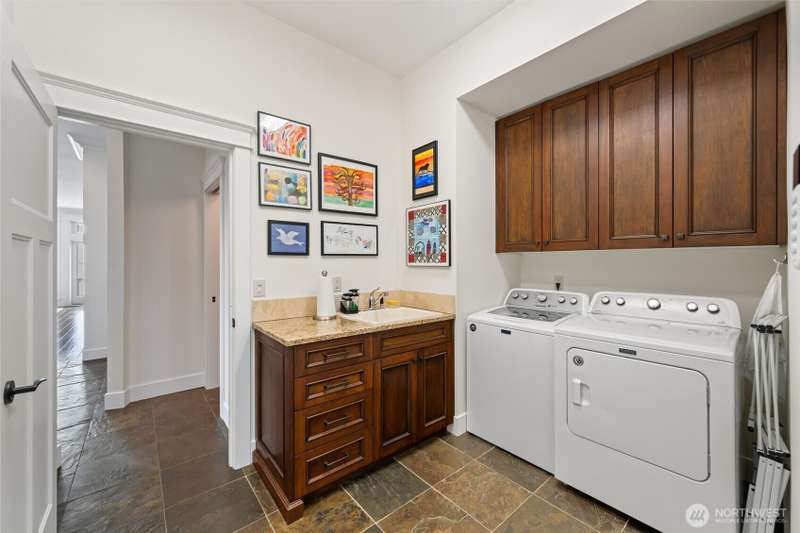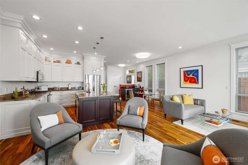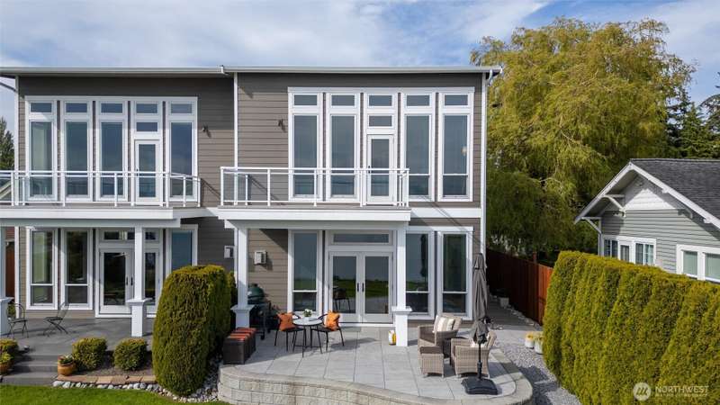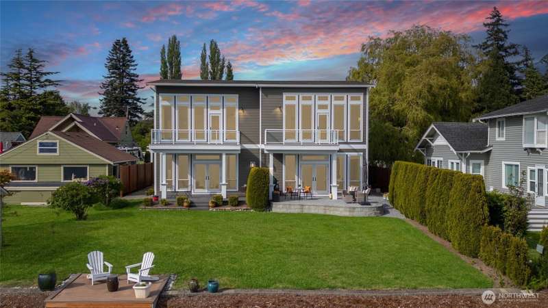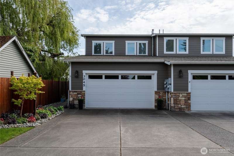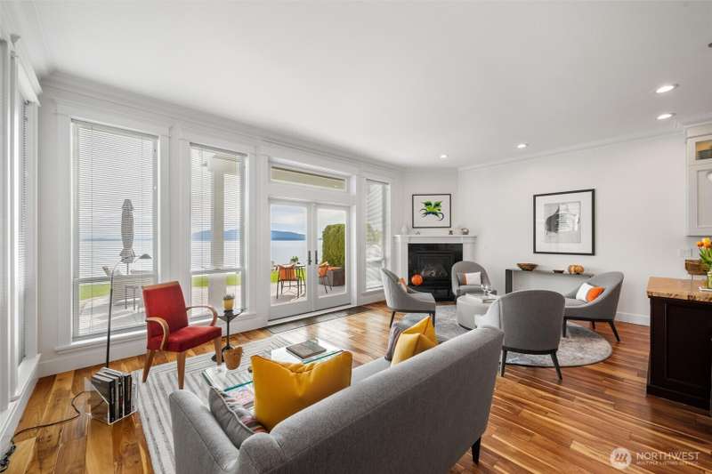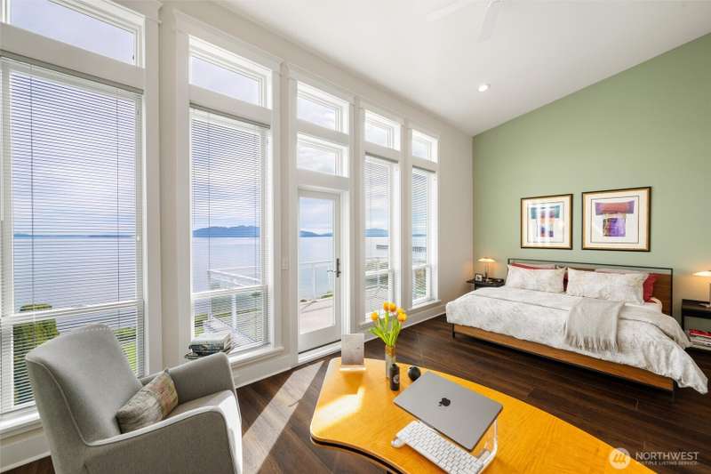 Luxury townhouse w/amazing southern bay/sound, island & mountain views through walls of windows up to soaring vaulted ceilings & high-end finishes throughout. This 2580 sqft unit lives like a similarly sized house w/3 bedrooms, office, 2-car garage w/the lock & go convenience of a condo. Fabulous primary suite features a spa bath & separate dual-shower enclosure, radiant heat, walk-in closet, and large balcony w/sweeping unobstructed views. Originally built in 2010, the current owners have completely gone through entire unit, upgrading fixtures, flooring, windows, appliances, patio. Complete interior paint refresh. Private patio, lawn and set back from the road with off-street parking. Rare two-unit association amongst single-family homes.