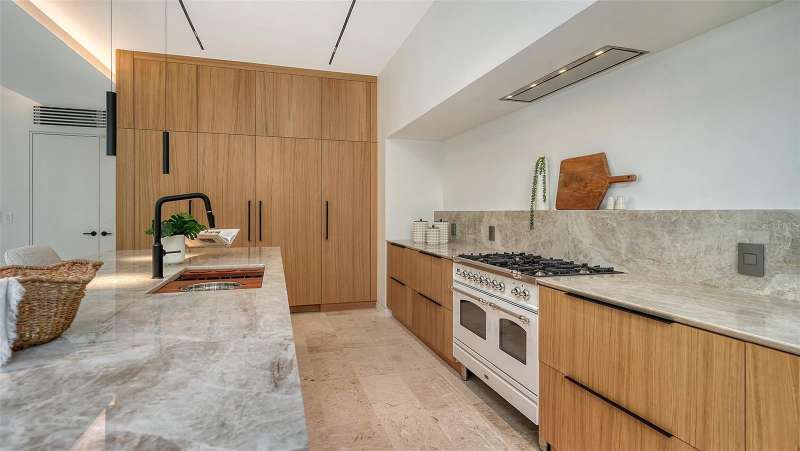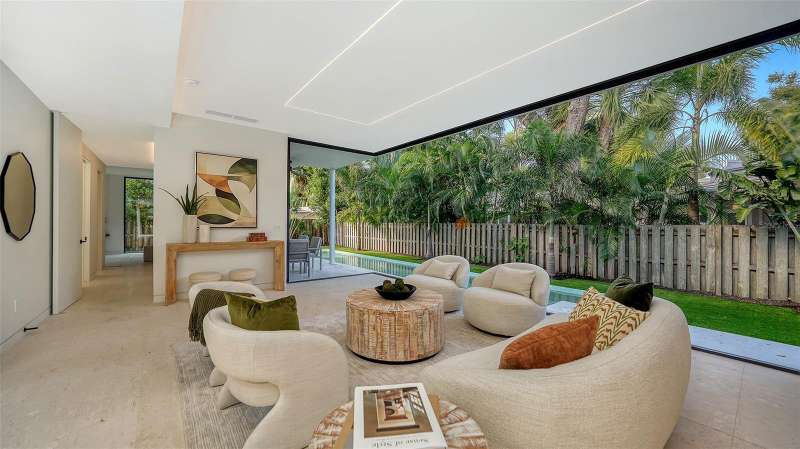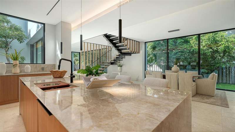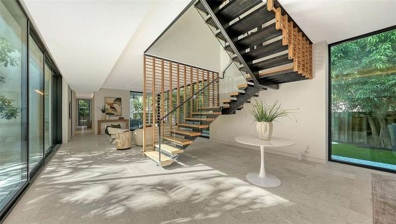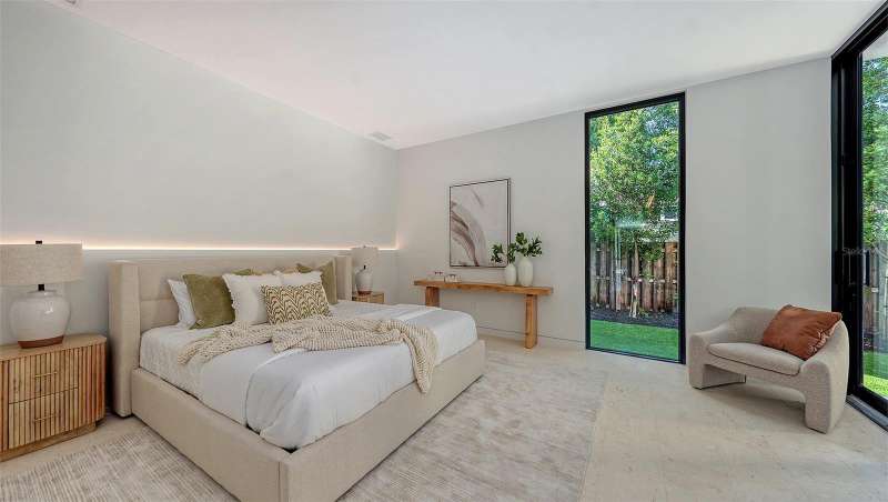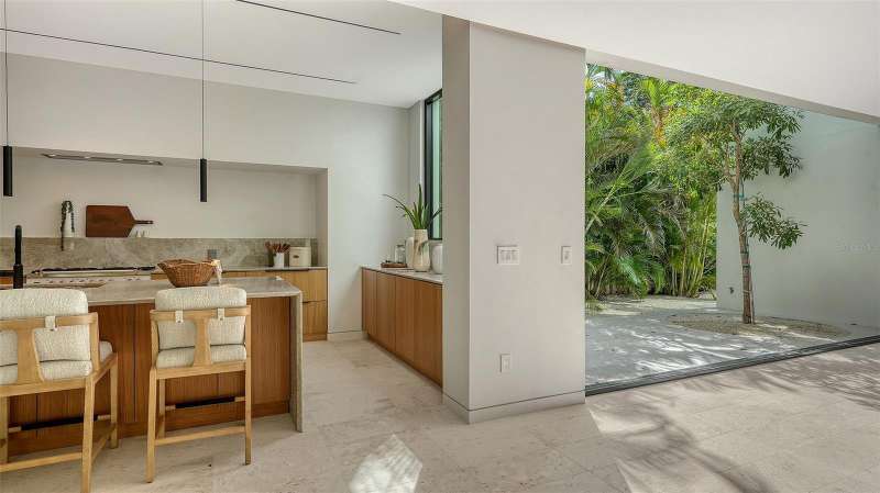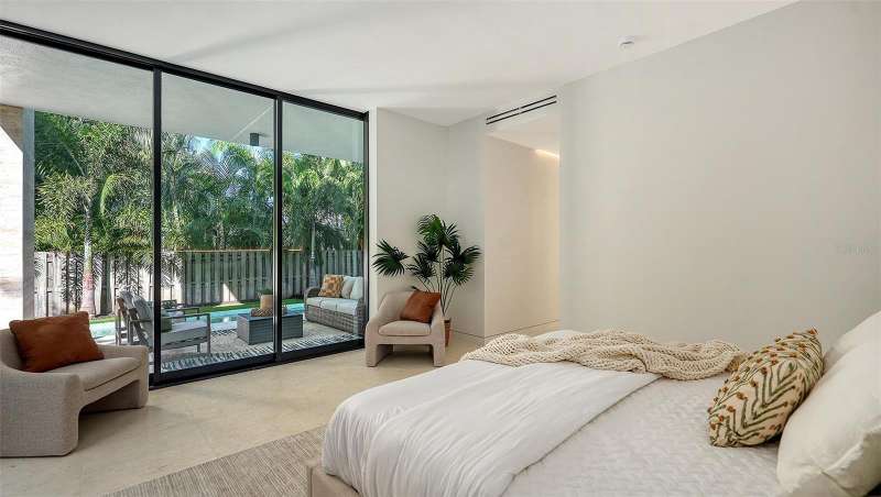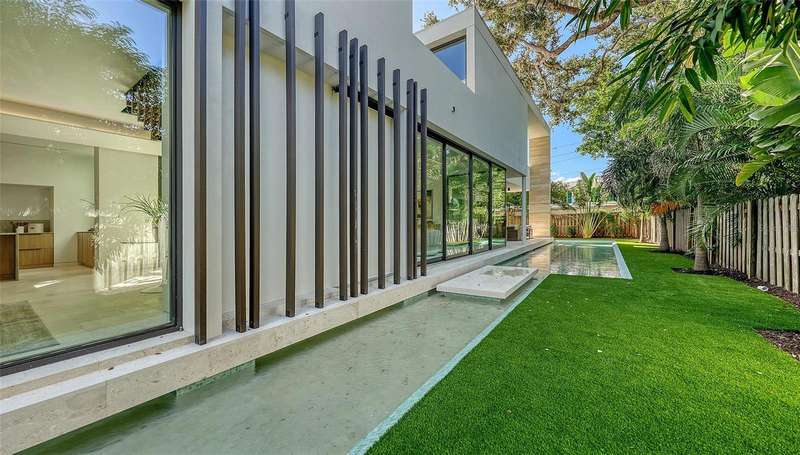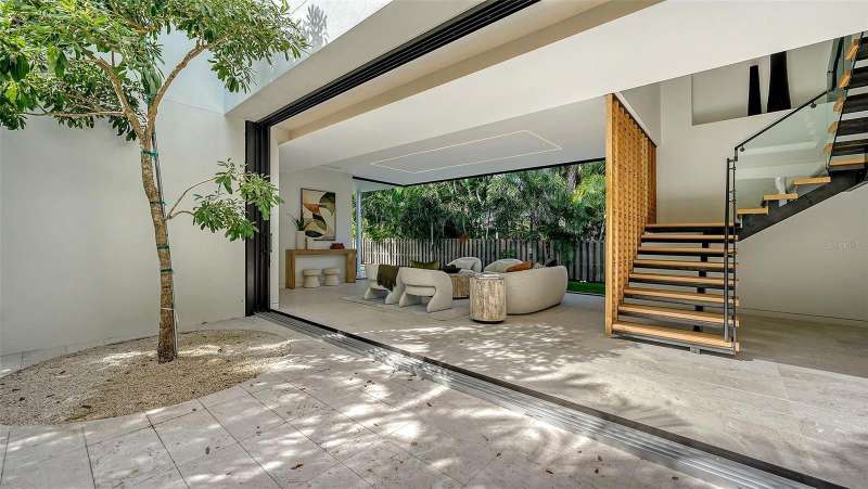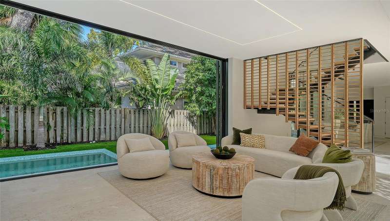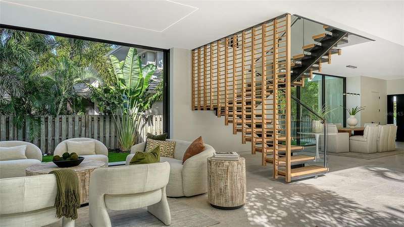 Stunning New Construction by Award-Winning Architect Dan Lear in coveted West of Trail Neighborhood** This meticulously designed luxury home offers the perfect blend of modern elegance and timeless sophistication. Near Selby Gardens, Morton's Market, and Sarasota Memorial Hospital, this exceptional property provides both convenience and style. Spanning over 3,800sqft of living area, this expansive residence boasts four spacious bedrooms, five full bathrooms, a enormous den with terrace, and a dedicated office space, all thoughtfully crafted for contemporary living. The grand, open-concept great room is the heart of the home, seamlessly floating over the pool area with a stunning large corner pocketing glass door that connects the interior to the beautifully landscaped outdoor oasis. The second floor features three guest suites, each with its own private terrace, offering tropical views and tranquility. The home's striking exterior showcases luxurious vein-cut travertine, creating a refined, sophisticated look. This is an extraordinary opportunity to move right in to a worry free one-of-a-kind masterpiece.