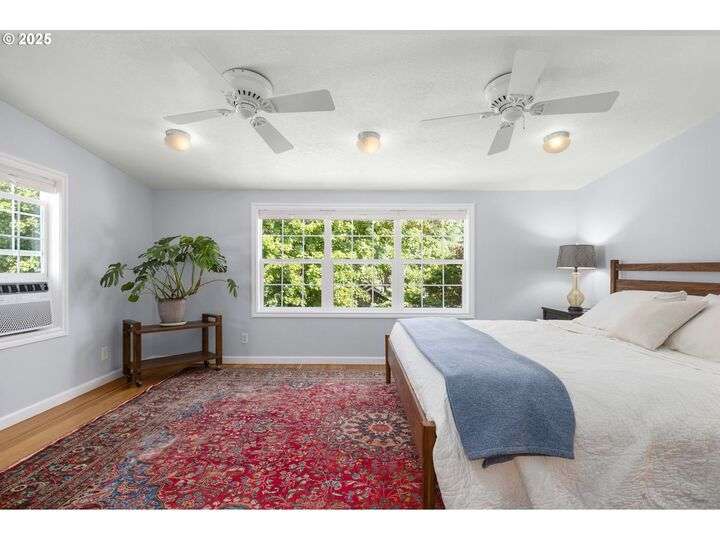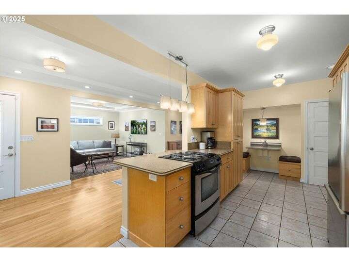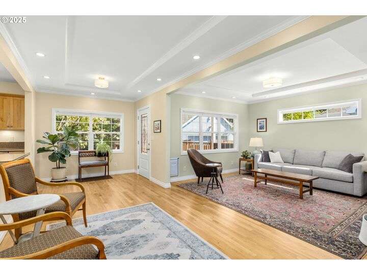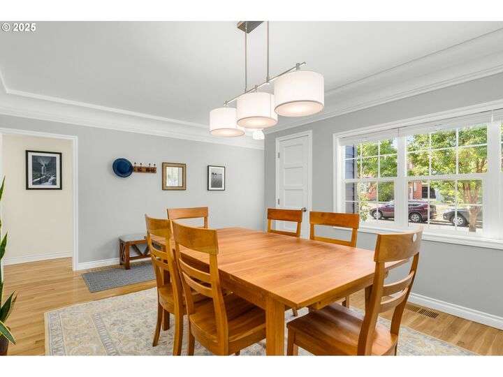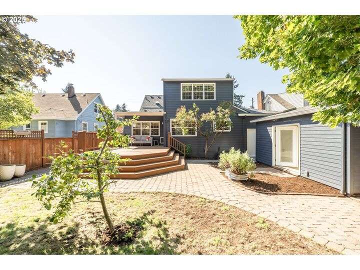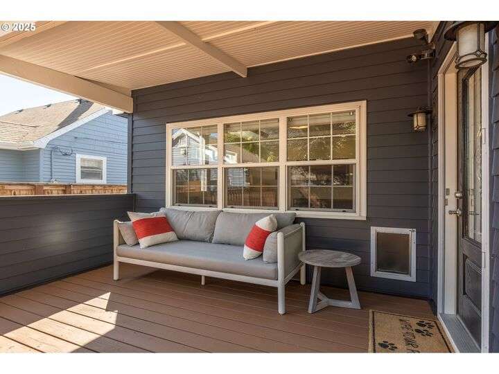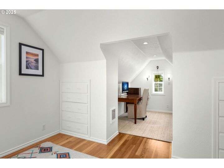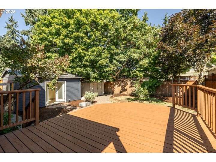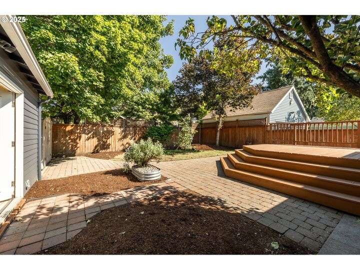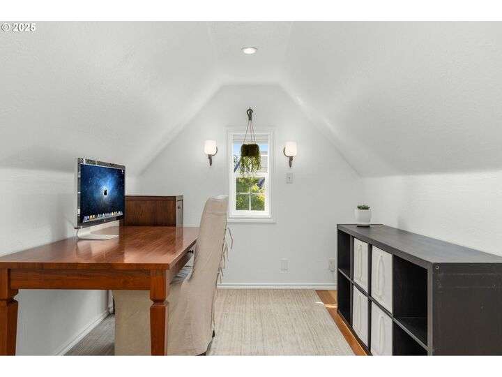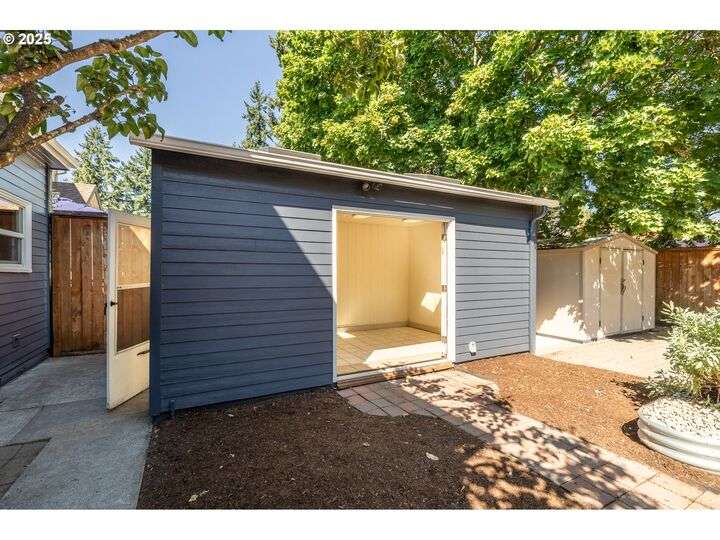 Move right into this statuesque English cottage in established Rose City Park neighborhood. Many charming details, including hardwood floors, tray ceilings and gorgeous original wood-burning fireplace in spacious dining area. Updated open kitchen features stainless steel appliances, downdraft range and cozy breakfast nook with built-in booth. Main floor bedroom adjacent to large bathroom. Light-filled landing upstairs with built-in storage leads to primary bedroom with large walk-in closet, bathroom, and third bedroom with built-in dresser and separate study alcove. Zero-VOC paint and new top-down bottom-up shades throughout. Finished basement has well-equipped laundry area with sink, folding area and lots of cabinet space, plus a large separate storage room. Seismic-retrofitted foundation. New 50-year roof (2023) includes transferrable platinum warranty. New Hardie Plank exterior lap siding (2024), electrical panel (2024), energy- efficient heat pump hot water heater (2025) and insulation (2023). Fully-fenced garden with beautiful landscaping, deck and fruit trees, plus detached bonus building for yoga or art studio, home office or gym. Walk to Normandale Park, Rose City Park and Golf Course. Two blocks to bus line, food trucks and beer garden. [Home Energy Score = 3. HES Report at https://rpt.greenbuildingregistry.com/hes/OR10203728]