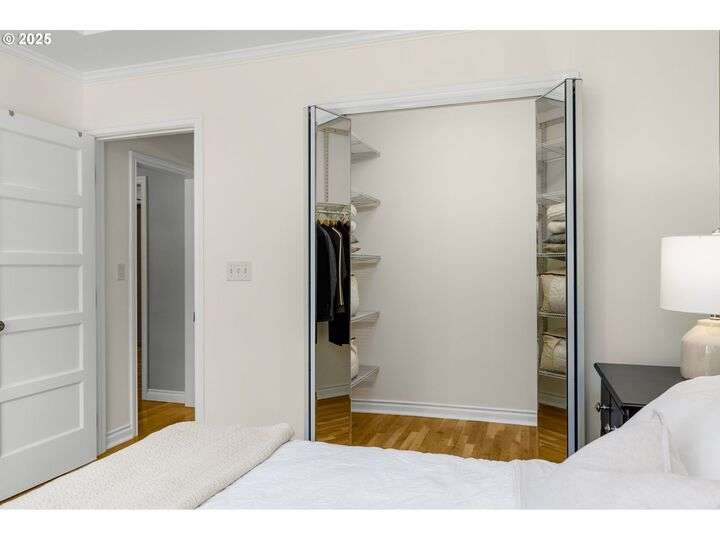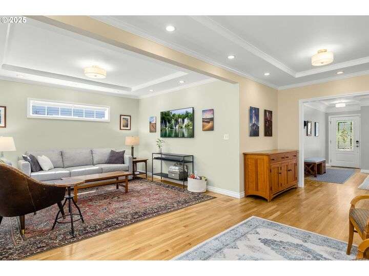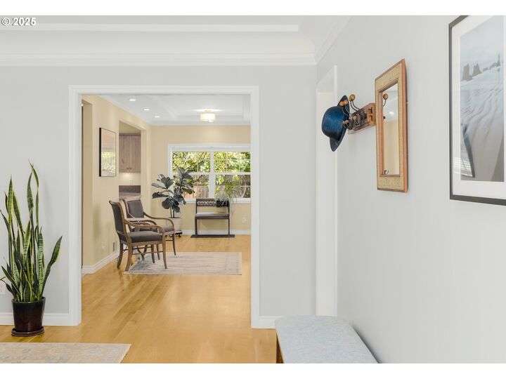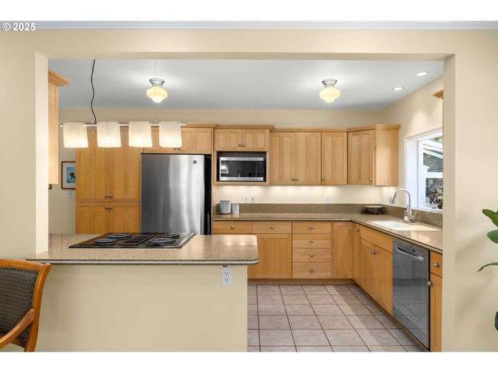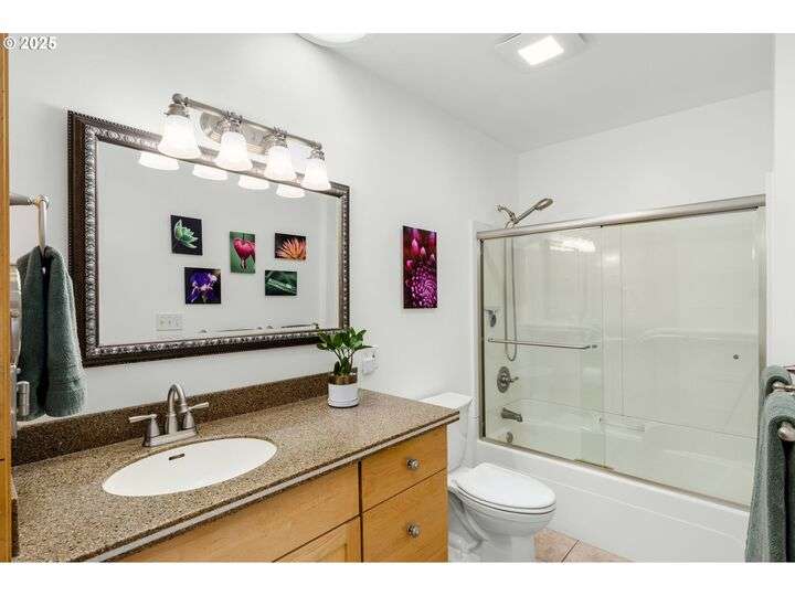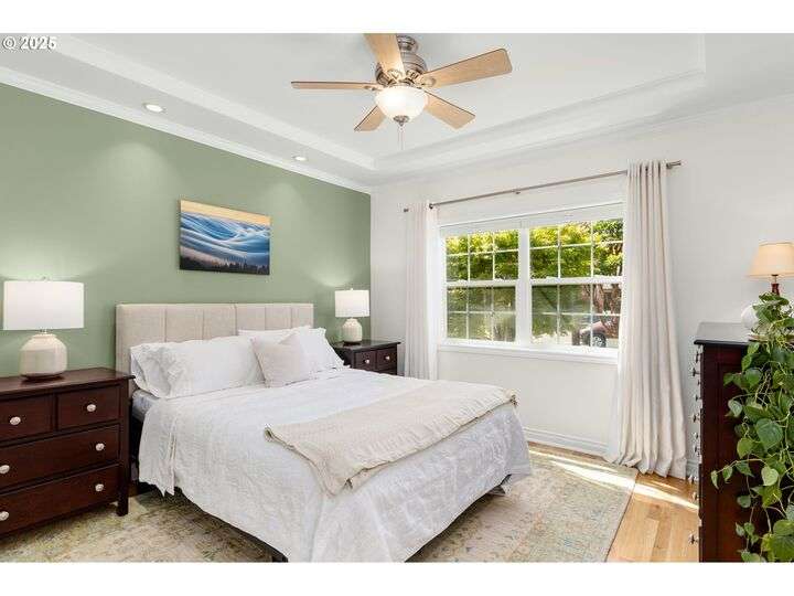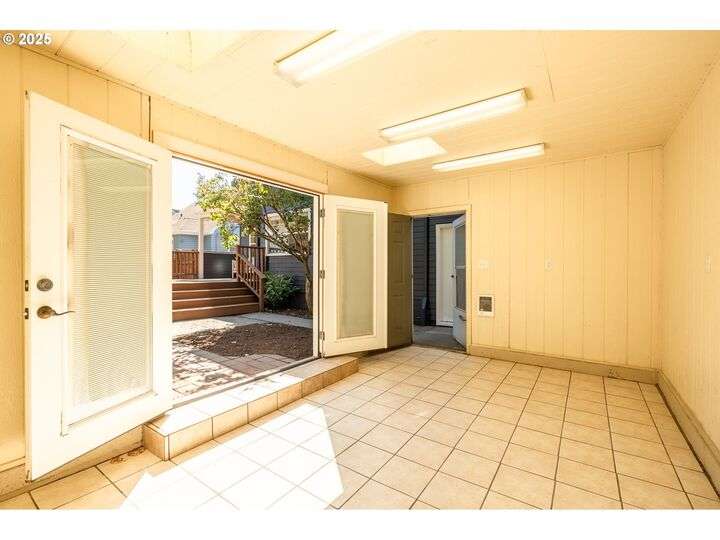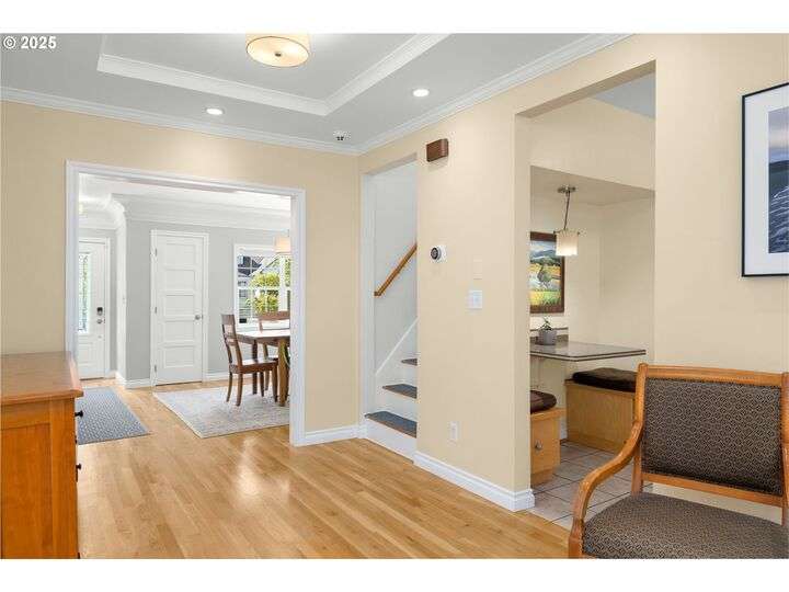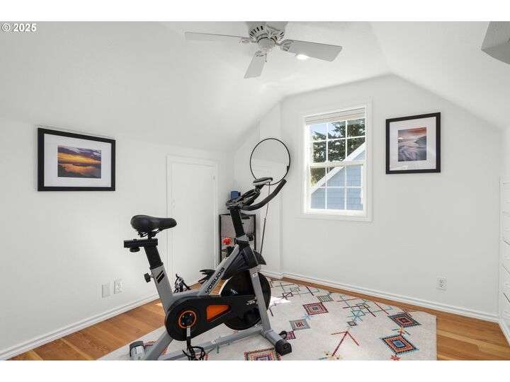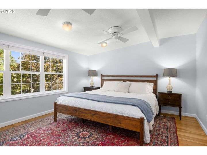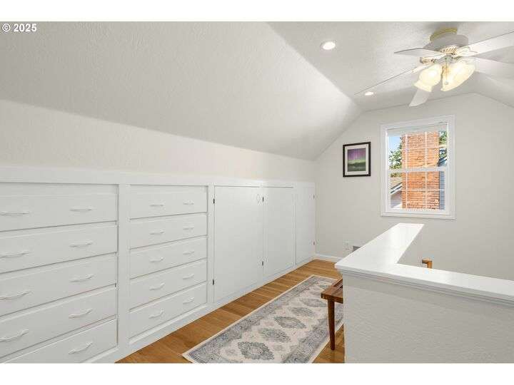 Move right into this statuesque English cottage in established Rose City Park neighborhood. Many charming details, including hardwood floors, tray ceilings and gorgeous original wood-burning fireplace in spacious dining area. Updated open kitchen features stainless steel appliances, downdraft range and cozy breakfast nook with built-in booth. Main floor bedroom adjacent to large bathroom. Light-filled landing upstairs with built-in storage leads to primary bedroom with large walk-in closet, bathroom, and third bedroom with built-in dresser and separate study alcove. Zero-VOC paint and new top-down bottom-up shades throughout. Finished basement has well-equipped laundry area with sink, folding area and lots of cabinet space, plus a large separate storage room. Seismic-retrofitted foundation. New 50-year roof (2023) includes transferrable platinum warranty. New Hardie Plank exterior lap siding (2024), electrical panel (2024), energy- efficient heat pump hot water heater (2025) and insulation (2023). Fully-fenced garden with beautiful landscaping, deck and fruit trees, plus detached bonus building for yoga or art studio, home office or gym. Walk to Normandale Park, Rose City Park and Golf Course. Two blocks to bus line, food trucks and beer garden. [Home Energy Score = 3. HES Report at https://rpt.greenbuildingregistry.com/hes/OR10203728]