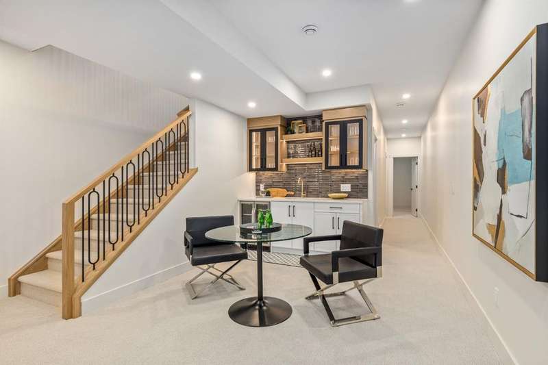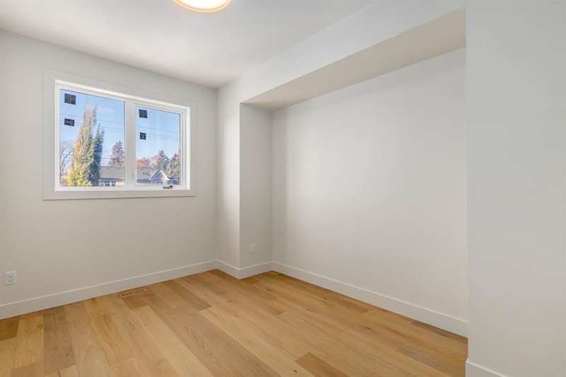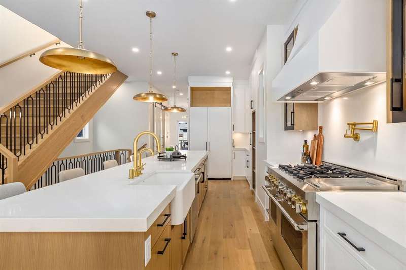 OPEN HOUSE Sat Nov 8 1-4PM, Sun Nov 9 11AM-1PM & 3-5PM! Experience elevated inner-city living with this impeccably designed, brand-new home nestled in one of Calgary’s most sought-after neighbourhoods: Hillhurst. Constructed by a trusted local builder known for craftsmanship, functionality, and aesthetic excellence, this 2-storey residence offers 2,224 SF above grade, with a fully developed basement, 4 bedrooms, and 4.5 bathrooms—a perfect blend of modern luxury and thoughtful detail. From the striking brick facade to the high-end engineered wide plank oak hardwood, every inch of this home exudes quality. The main floor welcomes you with a built-in entry feature and a front formal dining area, accented by elegant wall mouldings, white and gold sconces, and a designer chandelier. At the other end, an open-concept living room is a showstopper, featuring a large-format textured tile fireplace, custom built-ins with display lighting, and massive patio sliders leading to a west-facing, 135-ft deep backyard with a raised patio and gas line—ideal for indoor-outdoor entertaining. The chef’s kitchen is nothing short of stunning, complete with a 2.5" thick quartz island, panel-ready fridge/freezer with knurled handles, sleek quartz countertops, a gas range with pot filler, and backlit display cabinets framing the custom hood fan. You’ll also find a farmhouse sink, full slab backsplash, hidden coffee/appliance nook, built-in pantry, and a drawer-style microwave—each designed to inspire culinary creativity. Tucked behind a barn-style sliding door, the den offers a quiet workspace with a built-in desk, shelving, and bright window. The mudroom, also with a barn door, features tiled flooring, a built-in bench, and a large closet for seamless organization. Upstairs, each of the three spacious bedrooms come with walk-in closets and custom built-ins, along with private ensuites. The primary is sure to impress with vaulted ceilings, a LED-lit feature wall, statement gold light fixture, and a spa-inspired ensuite that boasts a steam shower, dual vanities, and a standalone soaker tub with dramatic black and white tile wall backdrop. A nearby laundry room offers convenience with a sink, folding station, shelving, and tile backsplash. The fully finished, carpeted basement, with 9-ft ceilings, is roughed in for in-floor heating and designed for comfort and versatility—featuring a spacious rec area, a TV wall with built-in components, a wet bar with lit display shelves and tile flooring, a full bath, and a large fourth bedroom with built-ins including a desk. An efficient mechanical room completes the lower level, with additional upgrades including solid core doors and built-in speakers throughout the entire home. Perfectly situated just steps from shops along 14 St NW and walking distance to Kensington Village, Calgary’s extensive river pathways, and the Downtown Core—this is urban luxury at its finest. Act now and make this exceptional Hillhurst property your forever home.