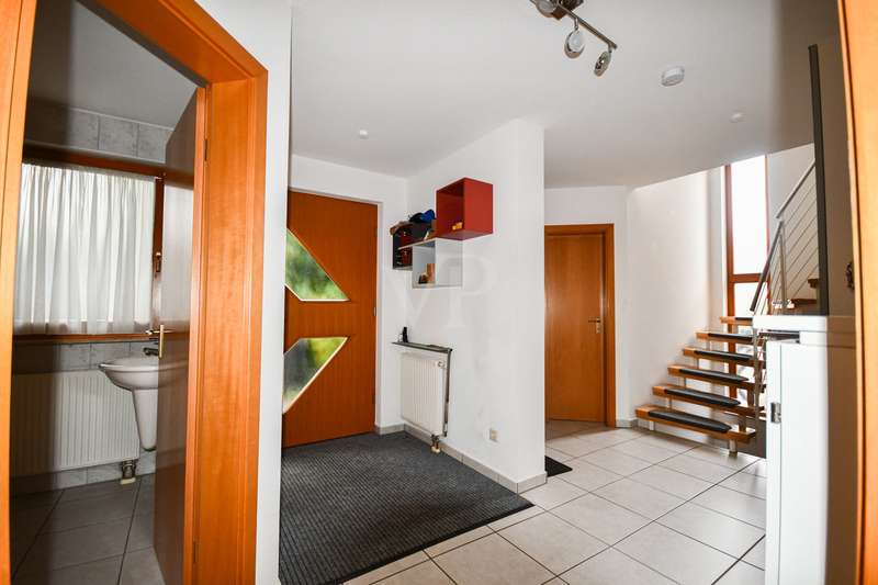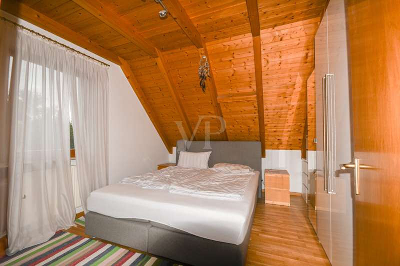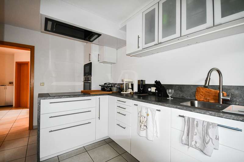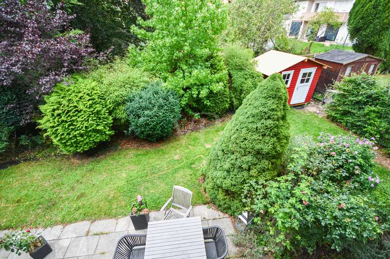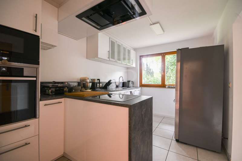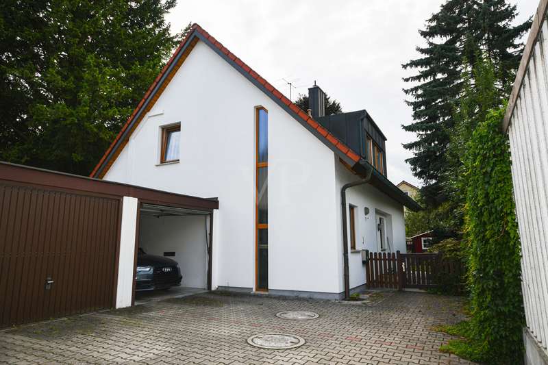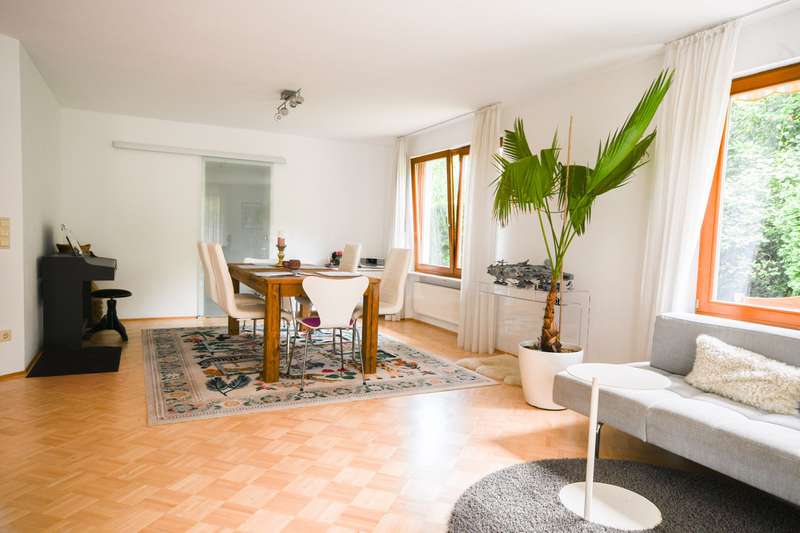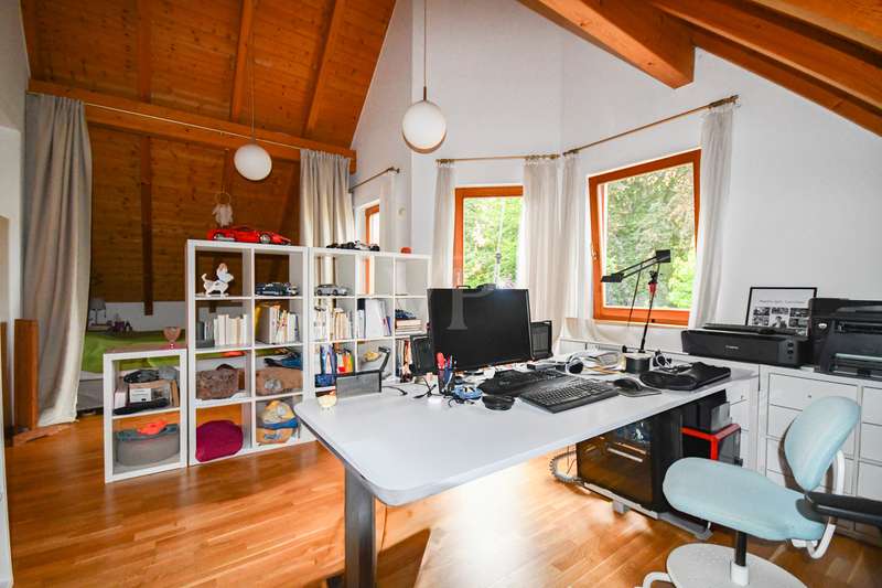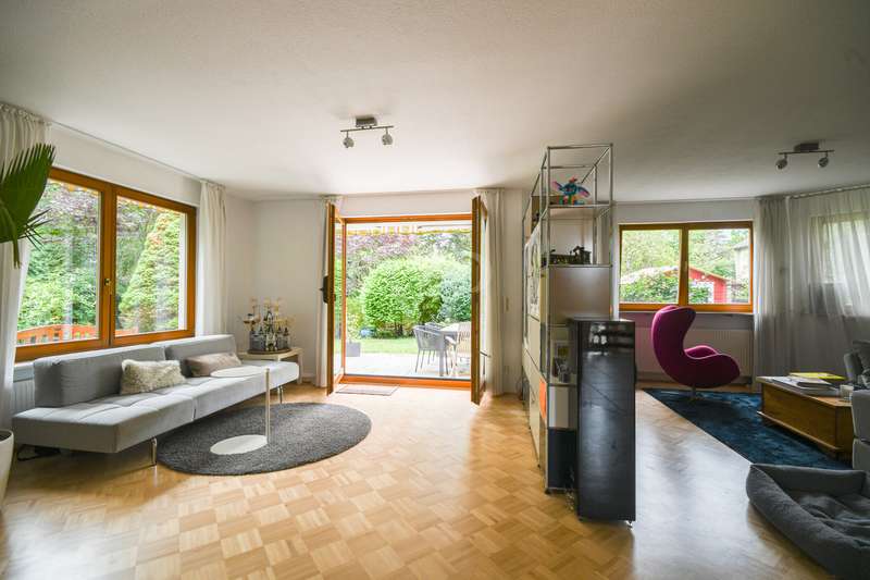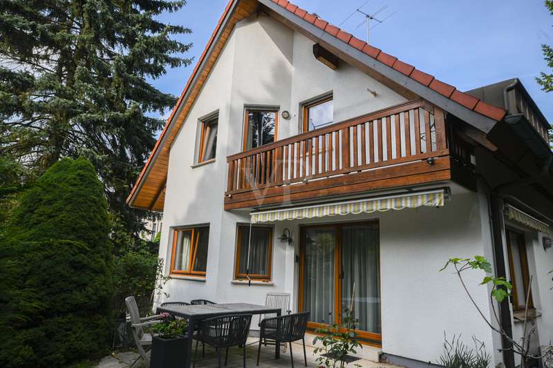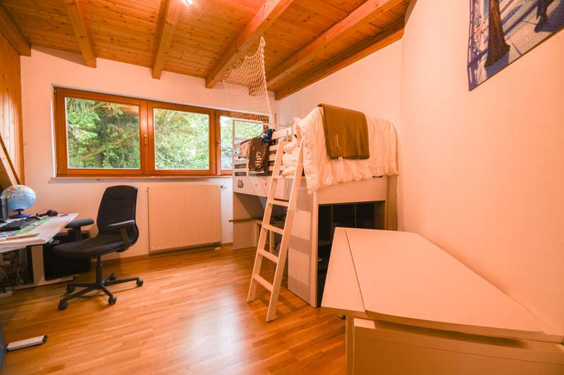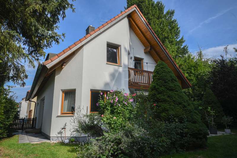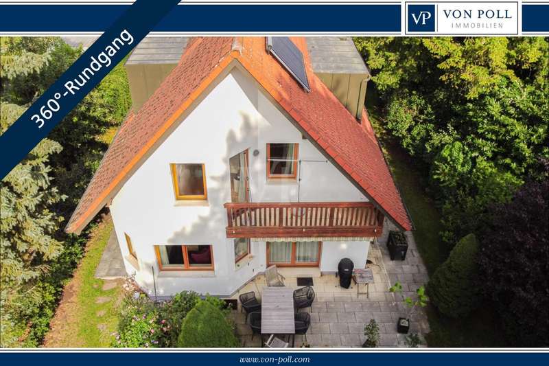 This well-kept detached house from 1998 combines spacious living, well thought-out furnishings and a quiet, secluded location. With approx. 143 m² of living space and a lovingly landscaped plot, it offers the ideal combination of living comfort, functionality and privacy - perfect for families or couples looking for space and quality of life. The bright living and dining area with fireplace forms the heart of the house. Large windows create a friendly atmosphere, while the south-west-facing terrace invites you to relax - in the sun or in the evening with a view of the greenery. The adjoining, high-quality fitted kitchen has a modern, open-plan design and is already included in the purchase price. There are four rooms in total, including three well-proportioned bedrooms. One of the rooms on the upper floor also boasts its own balcony. The bathroom with window is equipped with both a bathtub and a shower, while the separate guest WC offers a further shower - ideal for everyday life and visiting guests. The basement of the house also offers plenty of space and a variety of uses. A spacious hobby room is ideal for sports, creative projects or individual leisure activities, while classic cellar and utility rooms offer additional storage space. The well-tended garden is a real highlight, as tall conifers create natural privacy and lend the outdoor area a peaceful, green atmosphere. A newly built garden shed complements the space on offer and offers practical uses - whether as storage space or as a cozy retreat in the countryside. The interior of the house has been continuously modernized. The floor coverings were replaced with high-quality parquet flooring in 2020 and the heating system was also brought up to date in the same year. Double-insulated wooden windows ensure a pleasant living climate. Two separate single garages complete the offer. Occupation is possible by arrangement. A house to arrive and feel at home in - with lots of light, space and quality in a quiet residential area.