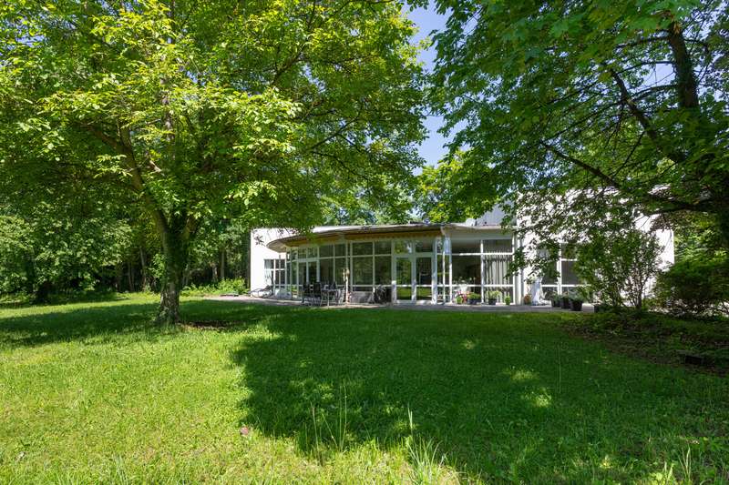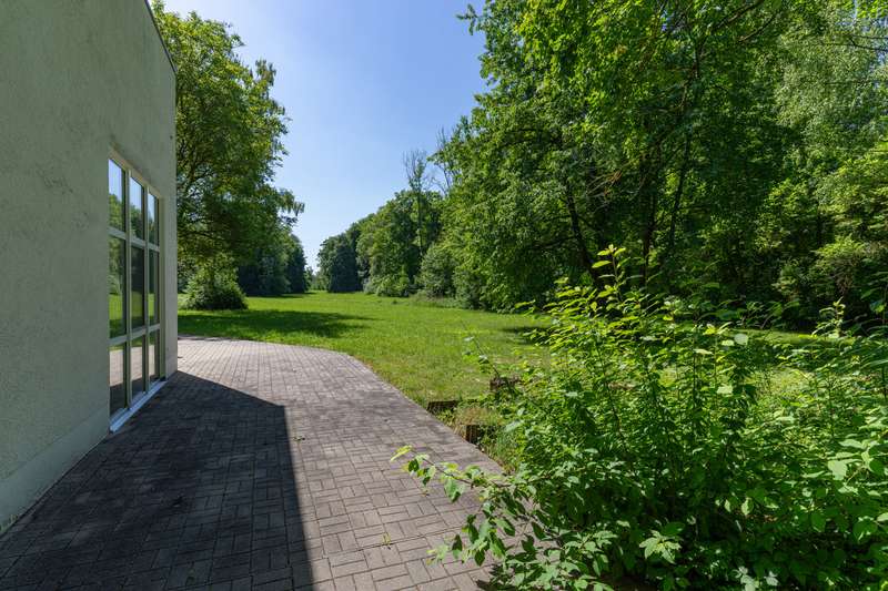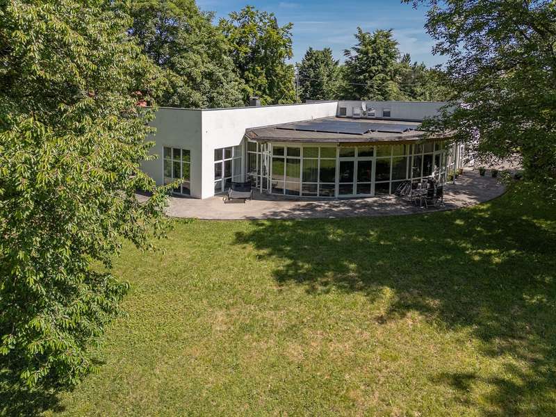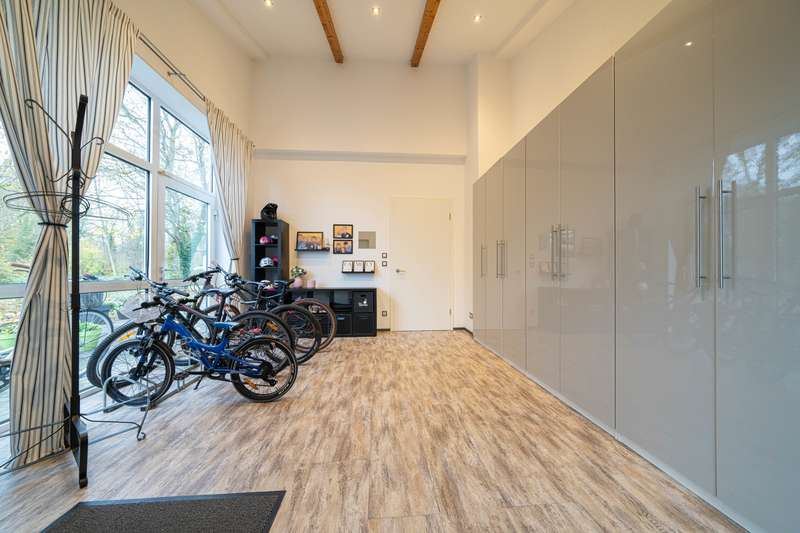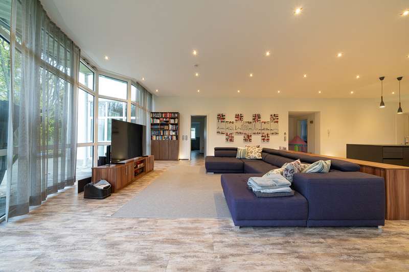 This extraordinary villa is enthroned in a peaceful and picturesque location on the edge of a forest, directly adjacent to a nature reserve. With a generous plot of approx. 2,777 m², the property offers an incomparable symbiosis of luxurious living comfort, natural idyll and flexible usage perspectives. Thanks to its location in a mixed-use area, there is also the possibility of discreet commercial use. The living space of approx. 278.43 m² extends harmoniously over one level and combines high-quality fittings with sophisticated design. The light-flooded living/dining and cooking area forms the heart of the house and impresses with an imposing, floor-to-ceiling glass front that provides a view of the surrounding countryside. The modern fitted kitchen with integrated bar invites you to enjoy convivial moments and combines functionality with exclusive style. With a total of six rooms, including five generously proportioned bedrooms, every demand for space and comfort is met. The master bedroom sets standards with a free-standing bathtub, a luxurious en-suite bathroom and a separate dressing area - all set against a backdrop of natural views and elegance. Two maisonette children's rooms with their own terraces offer young residents individual retreats. A separate children's bathroom with bathtub, WC and washbasin completes the area. A further room is ideal as a guest room or office, complemented by its own guest bathroom with a walk-in shower. There is also a separate room for children, guests or au pairs, which emphasizes the flexible use of this retreat. The spacious hallway offers space for a prestigious checkroom and underlines the exclusive character of the reception area. Underfloor heating throughout the house ensures a comfortable living environment. Sustainability is a top priority: A modern PV system with an output of 9.9 kWp and its own storage unit underlines the property's future-oriented approach. A utility room and a partial basement for the heating and technical room are practical additions. The full refurbishment carried out in 2016 brings the property up to the latest standards, while the first-class infrastructure of the surrounding area ensures convenient access to all important facilities. This property is far more than just a home - it is a statement of style, functionality and closeness to nature. Experience a property that leaves nothing to be desired and see this unique opportunity for yourself. Let us convince you of its noble overall concept during a personal viewing. Please understand that we only allow viewings on presentation of a financing confirmation. VON POLL FINANCE can assist you with this. Our colleagues will be happy to provide you with a mortgage certificate free of charge and without obligation.