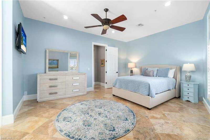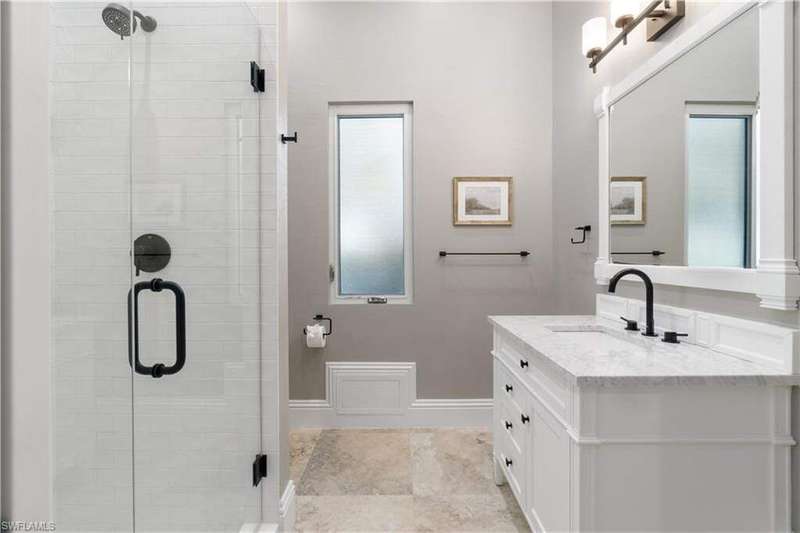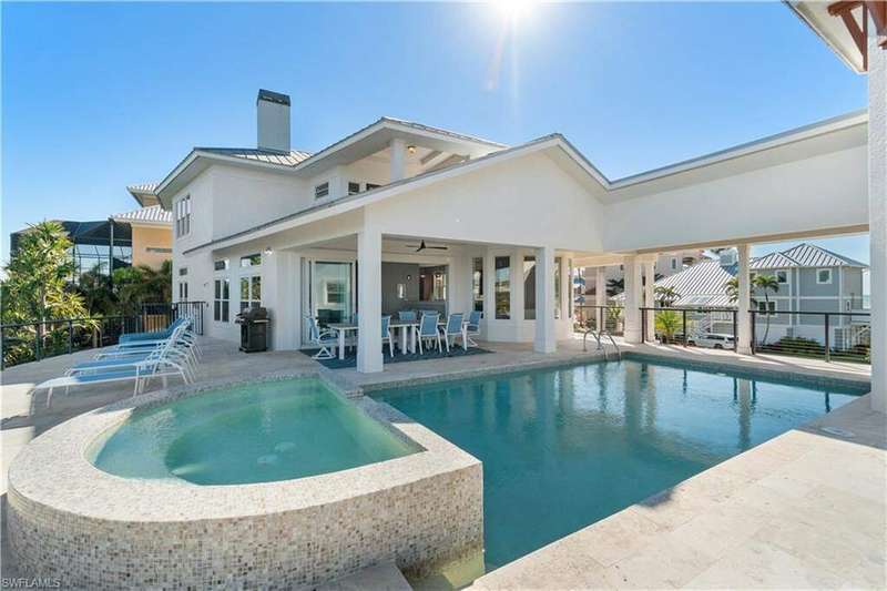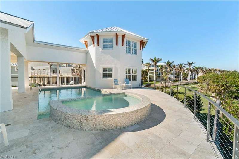 Beautifully renovated estate with breathtaking wide bay views in North Naples' premier community of "Barefoot Beach". A true boater and beach lover's paradise, this home features deeded beach access only a 2-minute walk away and direct Gulf-access from your private dock with a brand-new boat lift. Every detail of this residence has been thoughtfully upgraded, including a new roof, elegant travertine and wood flooring, hurricane-impact windows and doors, and soaring coffered ceilings. Spanning 5,000 sq ft under air, this home offers 4 spacious bedrooms + a den, 4.5 bathrooms, a separate guest villa, dual laundry rooms, a private elevator and a ground-floor flex space. The outdoor space is truly an entertainer's dream, offering sweeping bay views, an elevated pool and spa, an outdoor shower, and ample lounging areas-both covered and open. The oversized chef's kitchen is a true masterpiece, featuring sleek quartz countertops, beautiful mahogany wood cabinetry, an induction cooktop, a breakfast bar, and an inviting eat-in area. The luxurious primary suite is a serene retreat, offering direct access to a private balcony overlooking the water-ideal for enjoying your morning coffee. A spacious office/sitting room, a fireplace, a wet bar with a built-in fridge, and a spa-like bathroom with dual vanities, a separate jetted tub, and a large frameless glass shower complete this tranquil sanctuary. The separate guest suite is perfect for hosting, offering 2 bedrooms, 2 bathrooms, and its own laundry facilities for added privacy. This is the epitome of coastal living. Optional membership to the exclusive "Club at Barefoot" provides access to tennis, two restaurants, beachside food and beverage service, and more. Conveniently located near fine dining, RSW Airport, Mercato, and Waterside Shops, and just 15 miles from the renowned Fifth Avenue in Naples, this home is a true gem in the heart of Barefoot Beach.