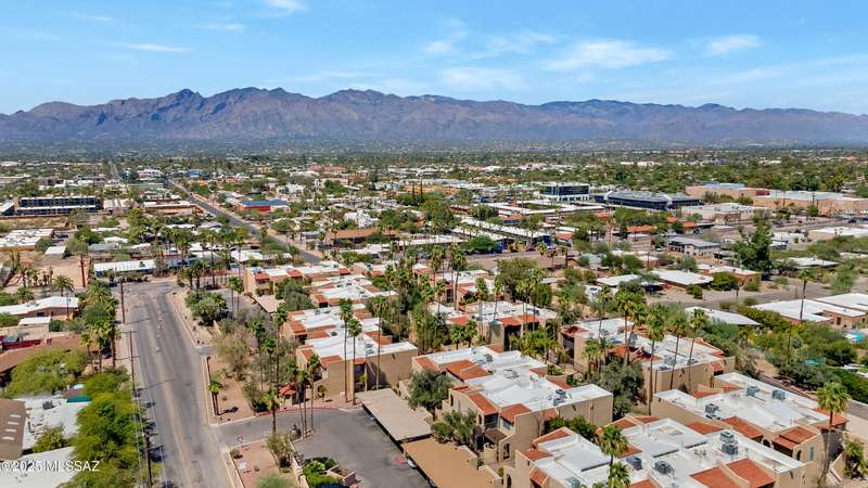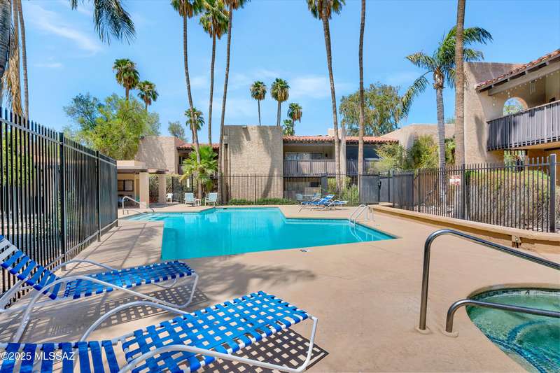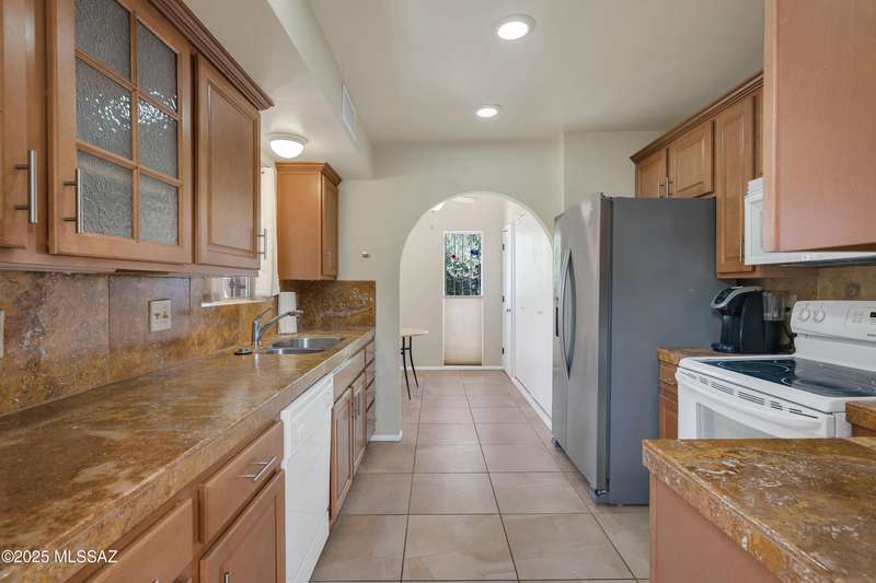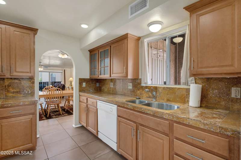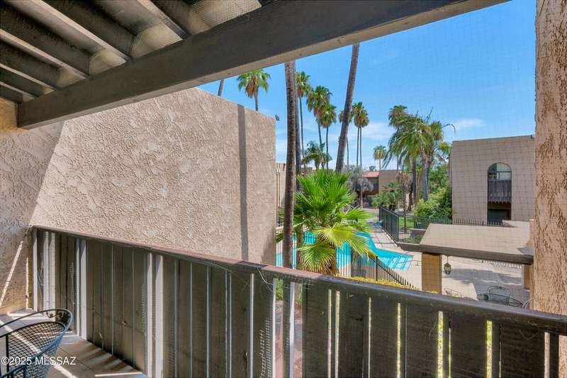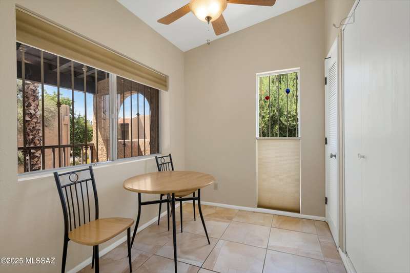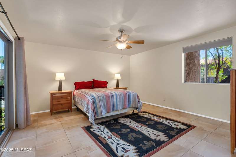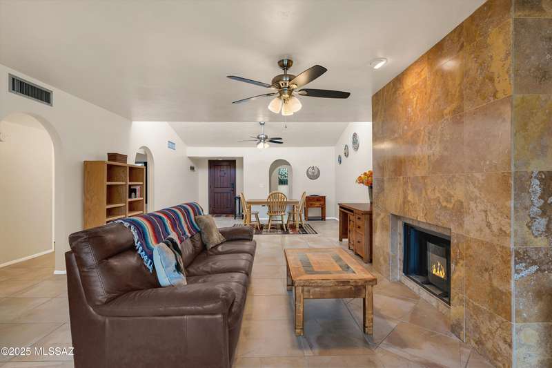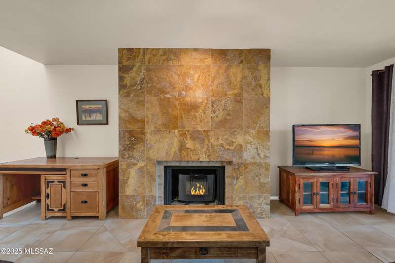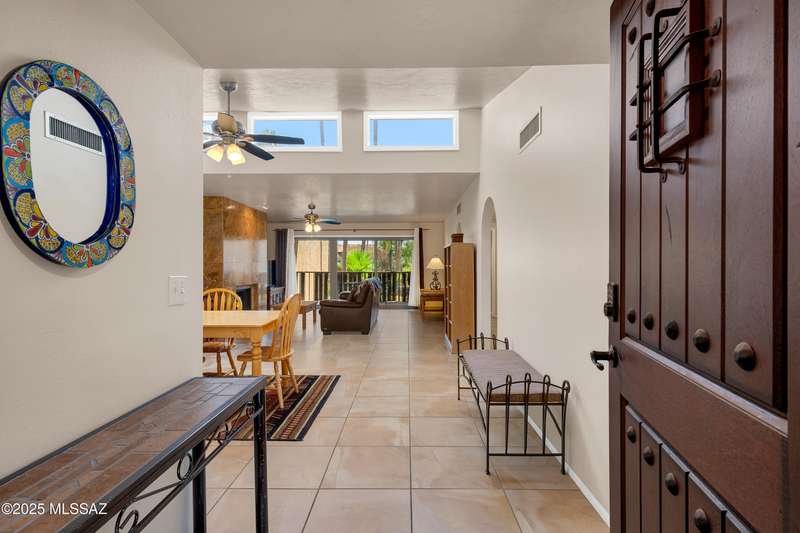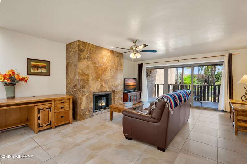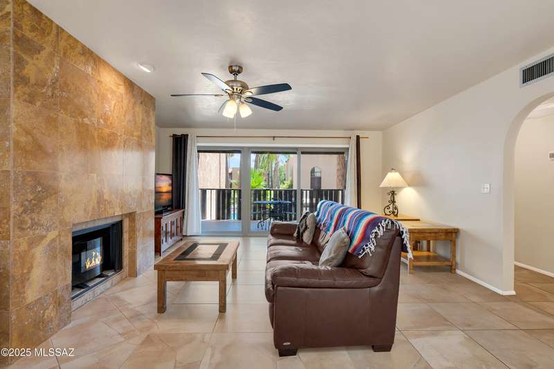 Perfectly combining style, comfort, and convenience, this beautifully maintained upstairs unit offers an exceptional living experience just minutes from Downtown Tucson, the University of Arizona, Reid Park, and an abundance of shopping and dining options. Step inside to discover a light-filled, open floorplan with soaring ceilings, expansive windows, and a spacious great room that flows effortlessly into the modern kitchen and breakfast area. The kitchen is highlighted by all-tile countertops and backsplash, a tile-finished grand fireplace, and a stainless steel refrigerator, creating a warm and inviting space to cook and entertain. The condo features two generously sized bedrooms, each offering excellent storage and comfort. The primary suite enjoys quick access to a covered patio,