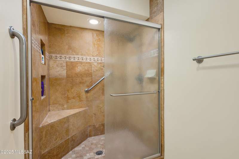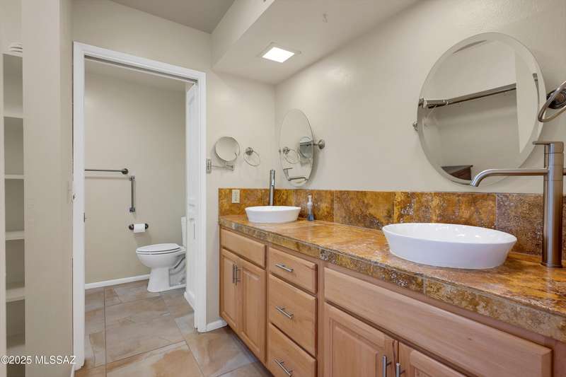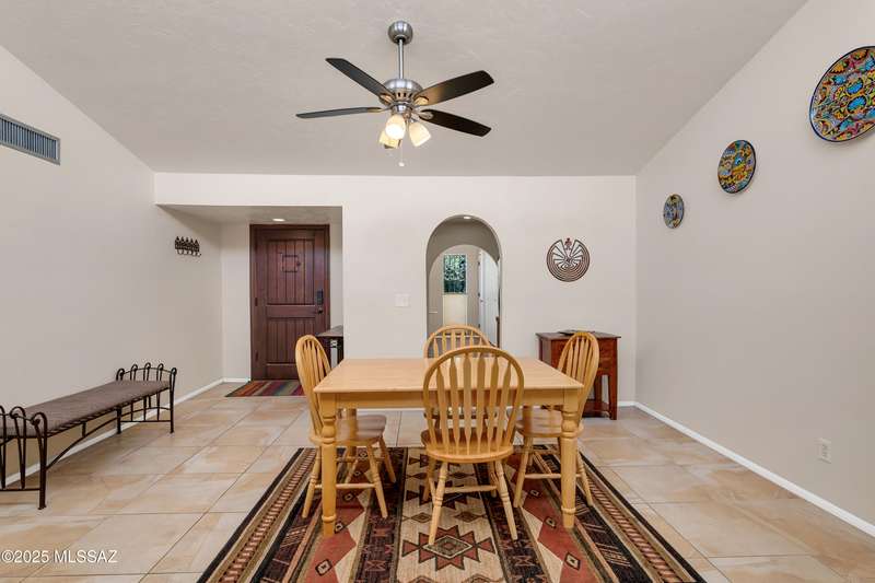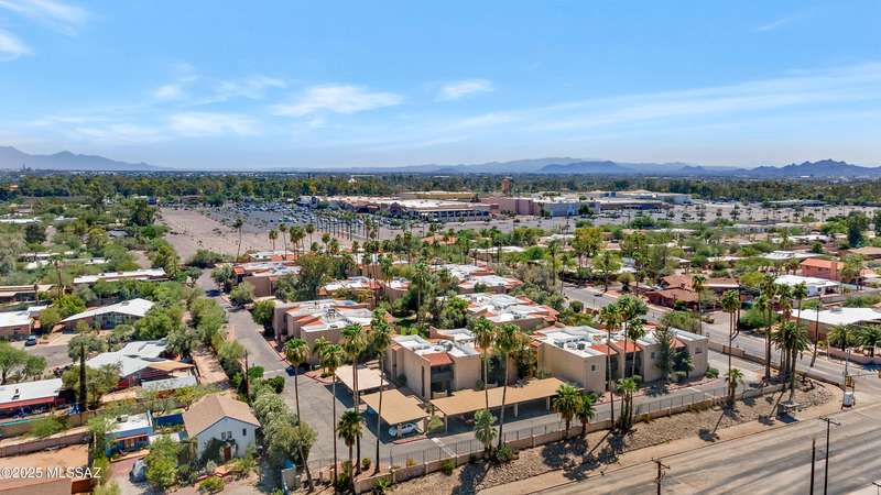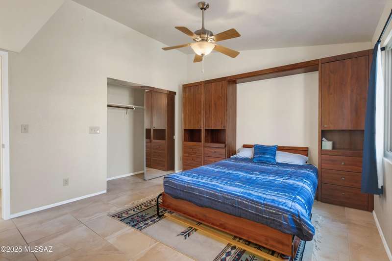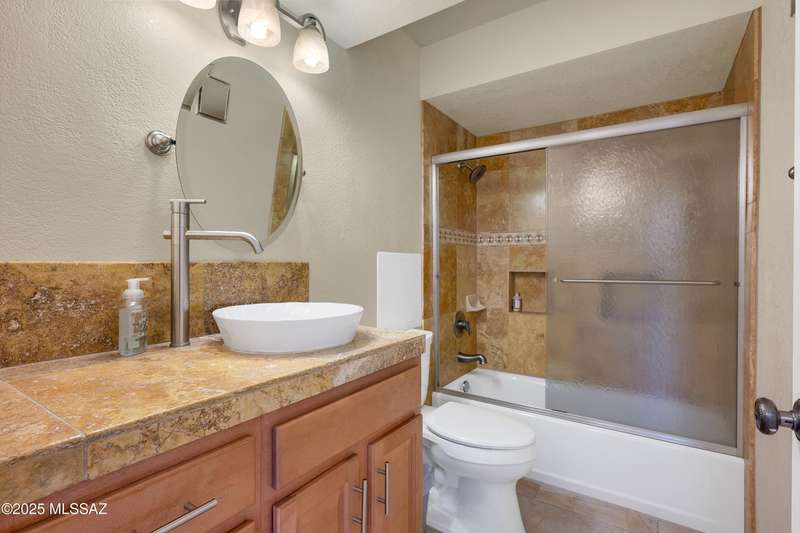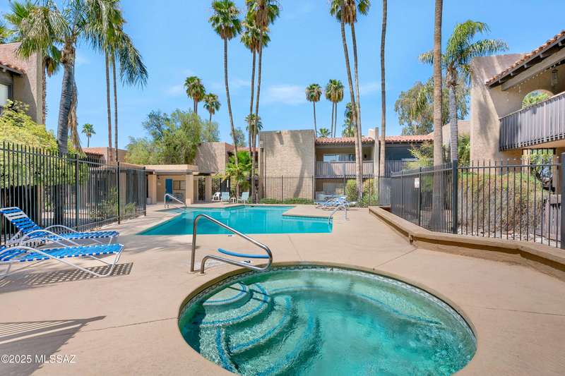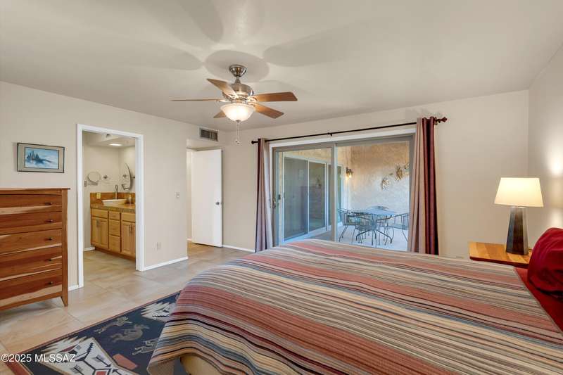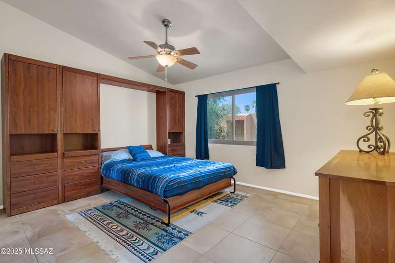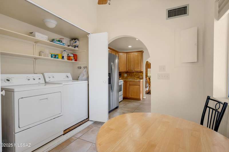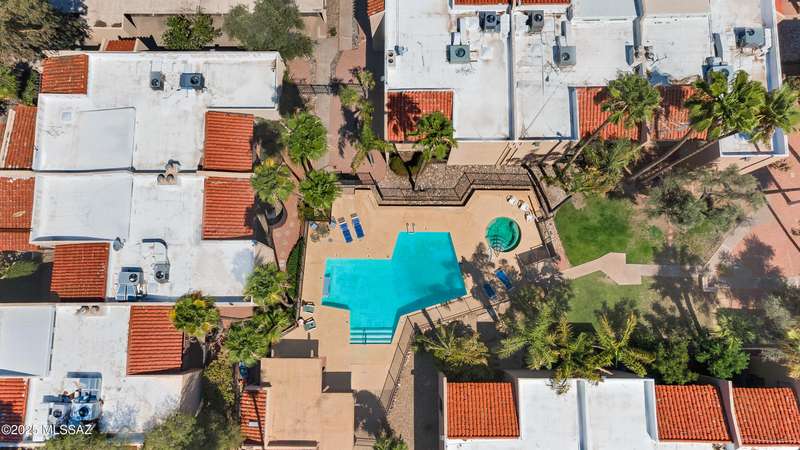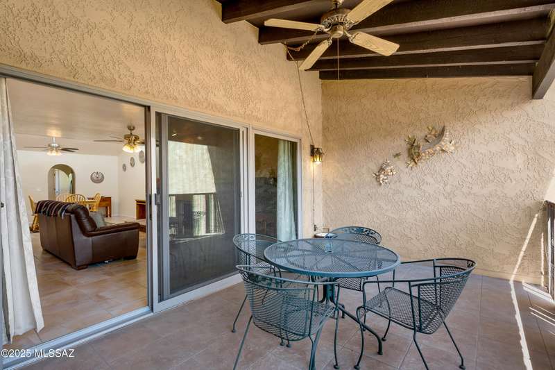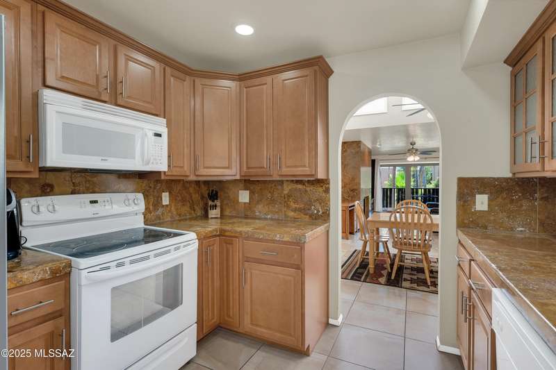 Perfectly combining style, comfort, and convenience, this beautifully maintained upstairs unit offers an exceptional living experience just minutes from Downtown Tucson, the University of Arizona, Reid Park, and an abundance of shopping and dining options. Step inside to discover a light-filled, open floorplan with soaring ceilings, expansive windows, and a spacious great room that flows effortlessly into the modern kitchen and breakfast area. The kitchen is highlighted by all-tile countertops and backsplash, a tile-finished grand fireplace, and a stainless steel refrigerator, creating a warm and inviting space to cook and entertain. The condo features two generously sized bedrooms, each offering excellent storage and comfort. The primary suite enjoys quick access to a covered patio,