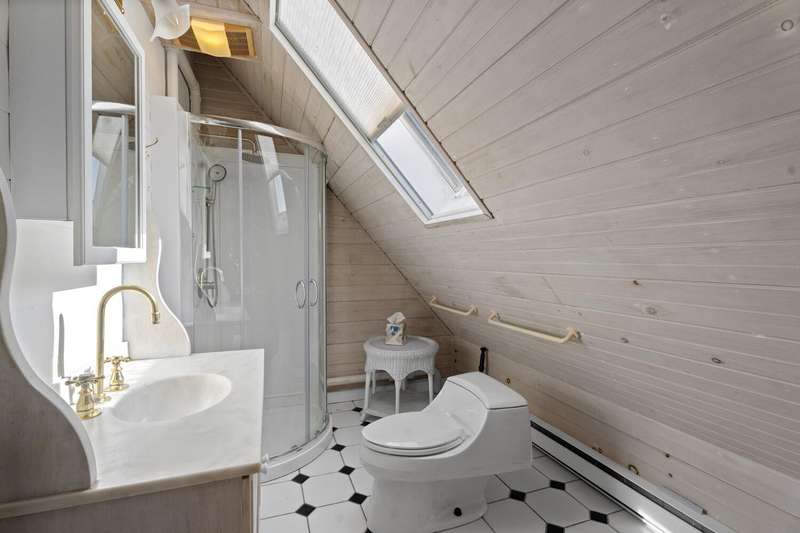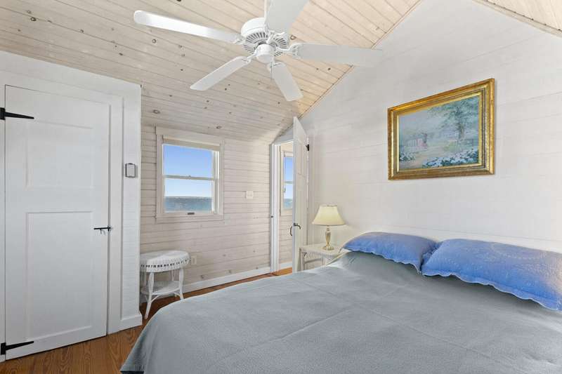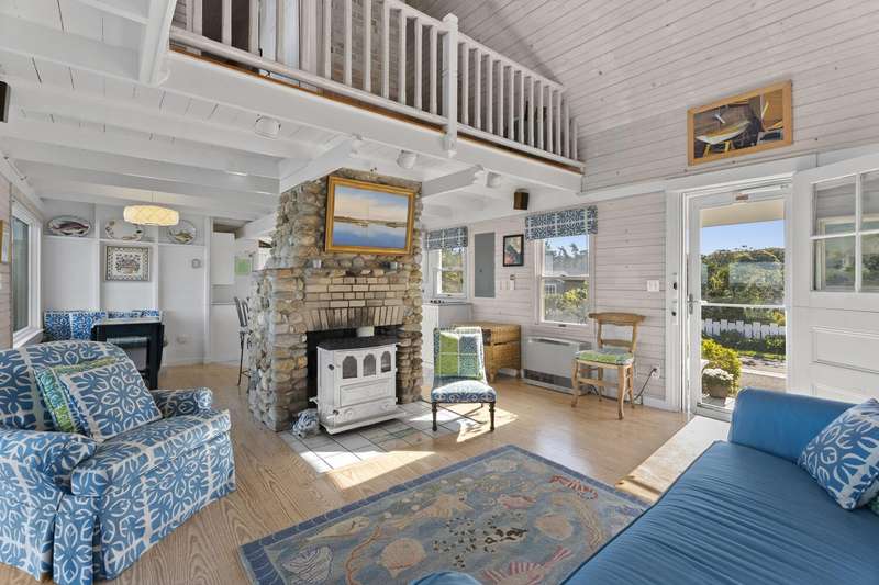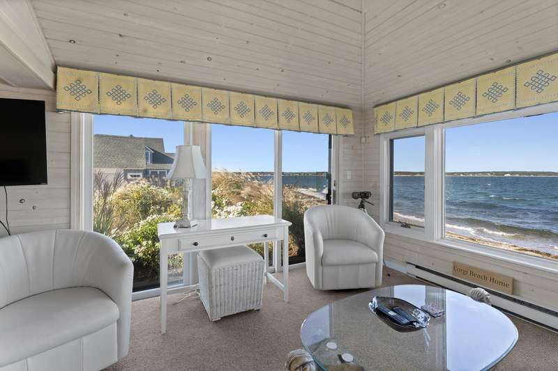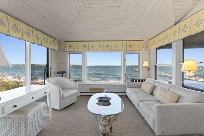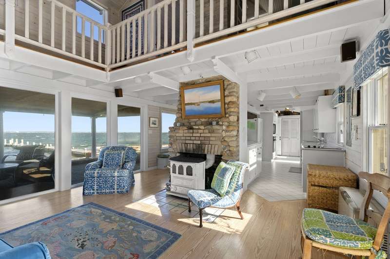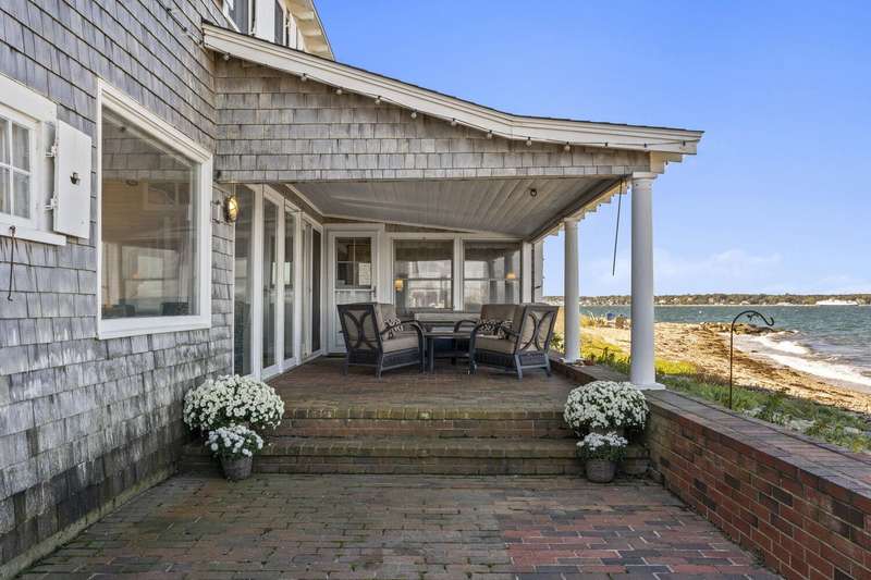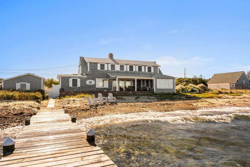Arrive by land or sea to 311 East Chop Drive, a truly rare offering that combines panoramic water views in nearly every direction. Perfectly positioned between Vineyard Haven Harbor, Vineyard Sound, and Crystal Lake, this iconic East Chop residence-known as ''The Sandpiper''-offers 100 feet of private beach, a 125-foot dock, and an additional mooring, all just minutes from the restaurants, shops and attractions of Oak Bluffs and Vineyard Haven. Completely renovated from top to bottom, this two-story waterfront haven blends the charm of its 125-year history with the modern conveniences of today. Expansive glass sliders and bay windows capture the ever-changing seascape, while hardwood floors, whitewashed beadboard, and a beach-stone fireplace infuse timeless coastal character. With four bedrooms and two and a half baths, the home offers generous space for family and friends. The fully appointed kitchen with breakfast bar invites casual dining and easy gatherings, flowing effortlessly to multiple outdoor spaces designed for relaxation and entertaining. A fenced beach-stone patio and brick terraces lead to a car barn with expansion potential, an outdoor shower, and seaside gardens