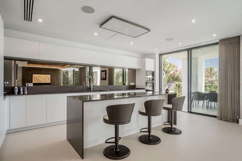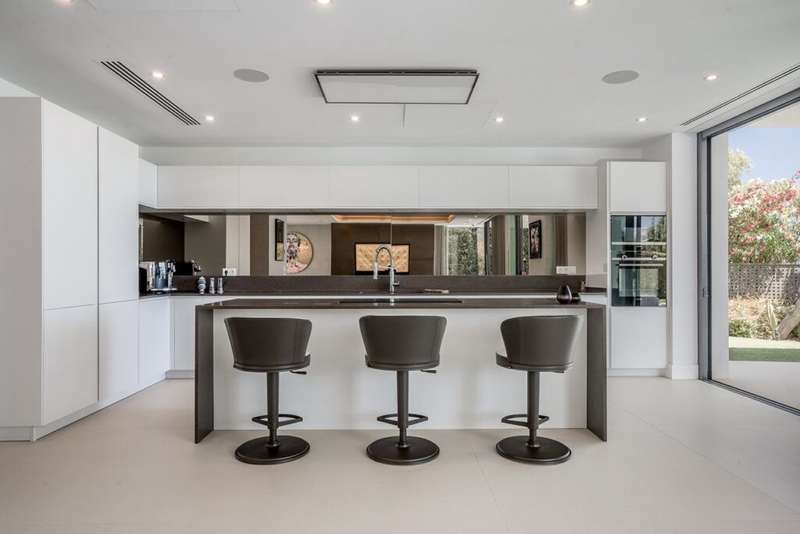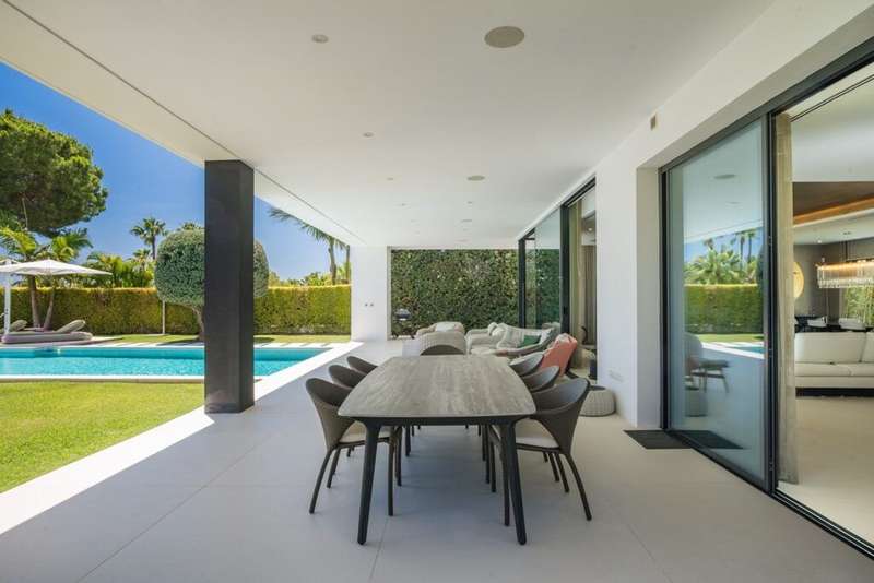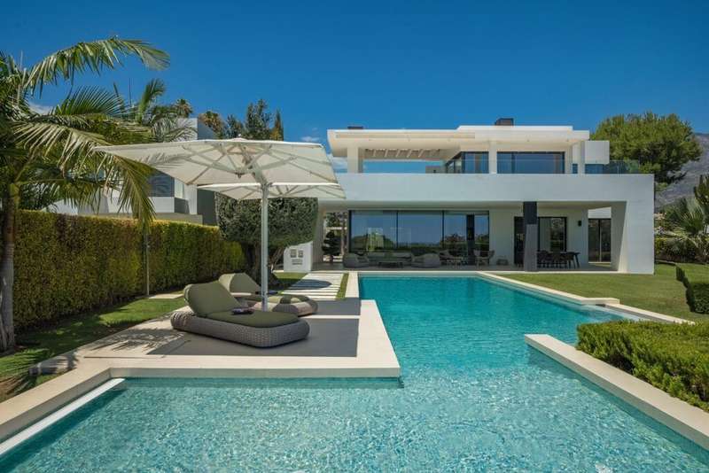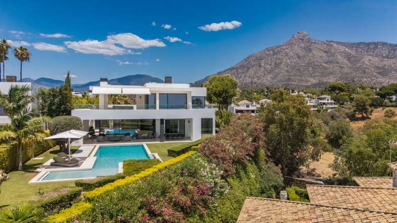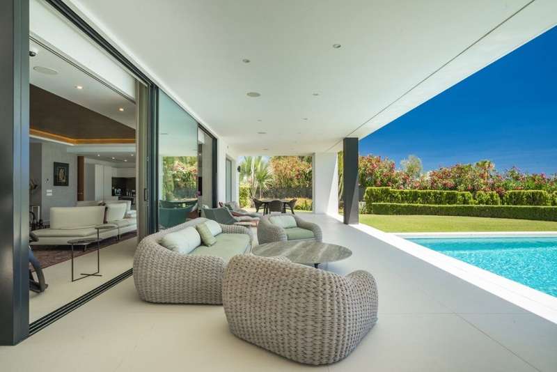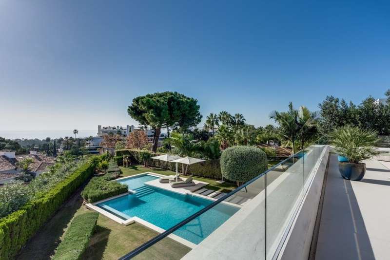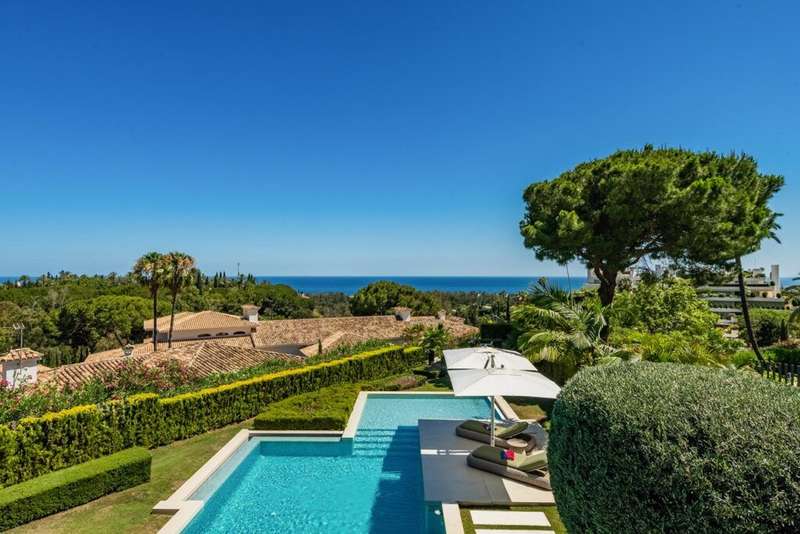 Located in the prestigious gated community of Las Lomas de Marbella Club, this stunning south-facing villa offers breathtaking sea views and a beautifully landscaped garden with a private pool and spacious terraces. Designed by renowned architects Cristian Larrain K. and Rodolfo Nonini, the villa showcases modern elegance with a striking white façade and a rooftop garden terrace offering panoramic views of La Concha Mountain. Inside, the open-plan living area exudes warmth and sophistication, featuring integrated lighting and a seamless flow between the dining area, designer kitchen, and social spaces. Each bedroom boasts an ensuite bathroom, with the master suite spanning the entire first floor, complete with a luxurious spa-like bathroom. Entertainment and leisure spaces include a home cinema, wine cellar, gym, and a dedicated entertainment room. An elevator and a three-car garage add to the convenience, while an advanced indoor-outdoor sound system enhances the ambiance. With ful