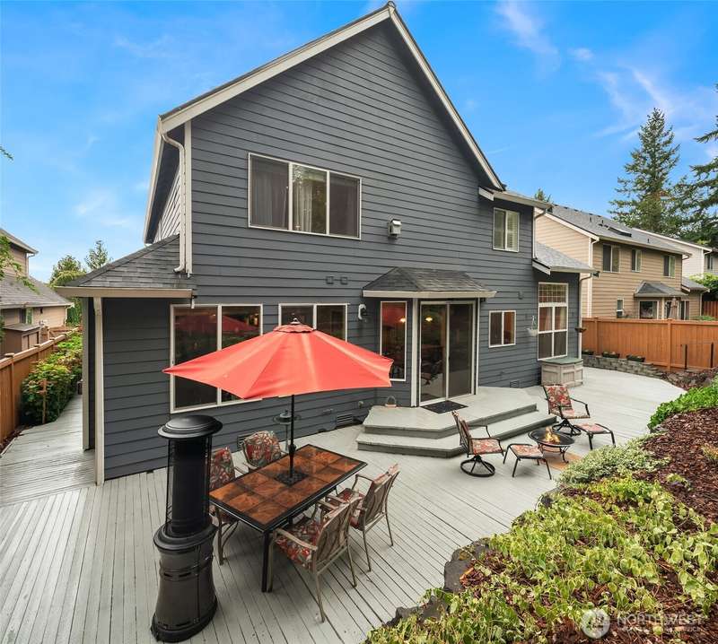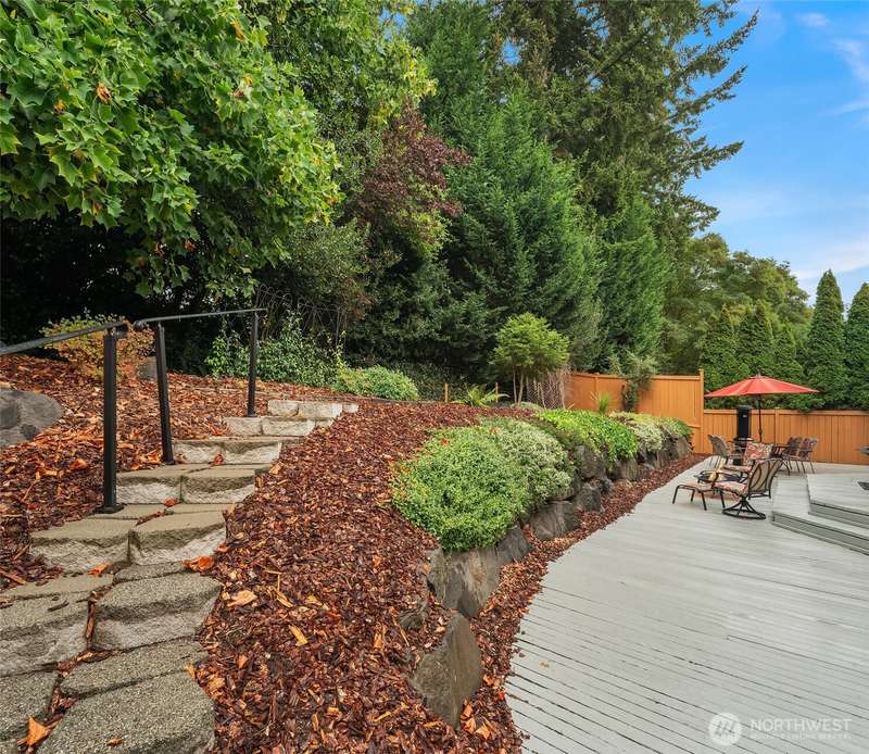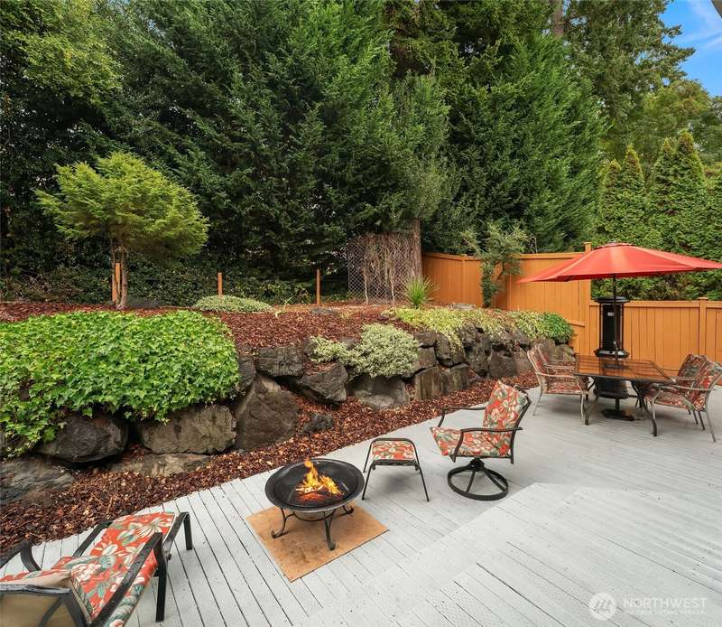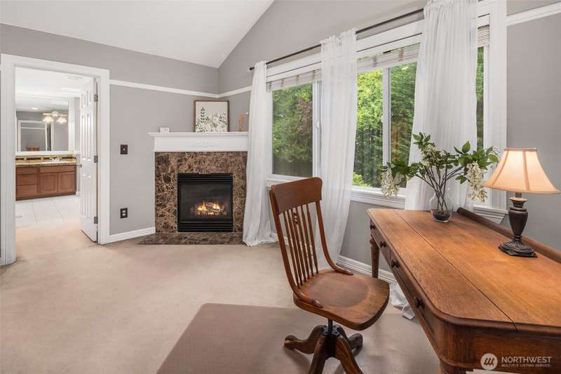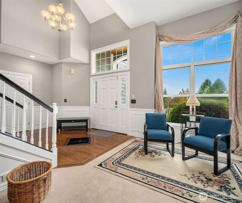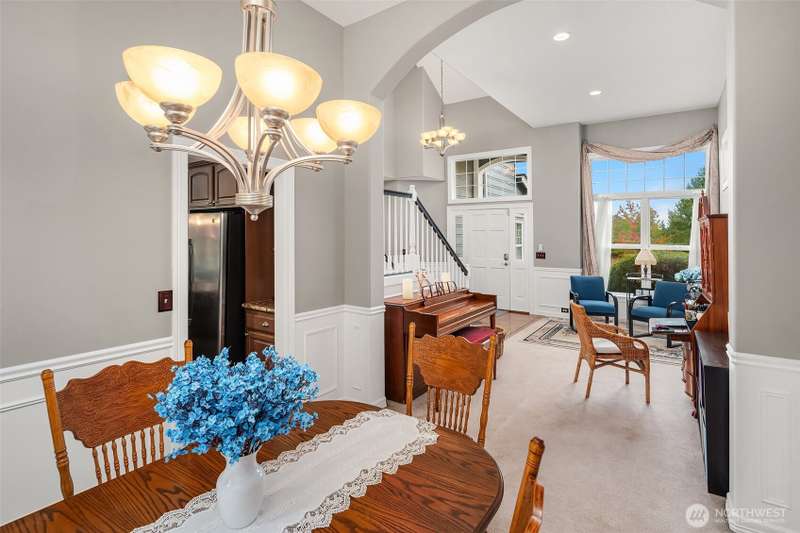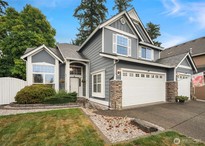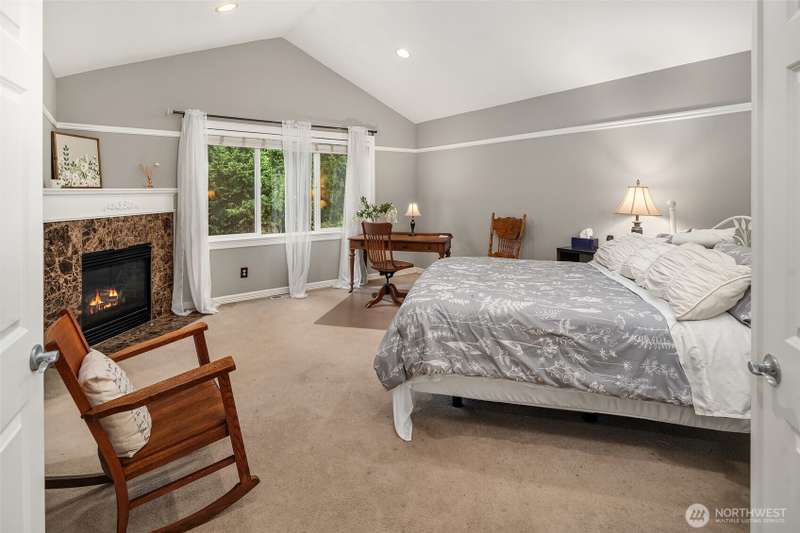 Tucked at the end of a tranquil cul-de-sac, this 5 bed, 2.75 bath home offers rare privacy and serenity. Bedroom and adjacent 3/4 bath for main floor living! The backyard is a garden oasis with wraparound deck, painted fence, stone pathway, and lush landscaping. Inside, soaring 17’ ceilings, wainscoting, French doors, and grand staircase create timeless elegance. The refreshed interior features slab granite kitchen counters, custom stonework in baths, and vaulted primary with fireplace and jetted tub. Recent updates include new roof, skylights, paint, carpet, plumbing, furnace, water heater, and washer/dryer. Central vac, built-ins, and a 3-car garage add comfort. Award-winning Fife schools, public transit, and 5 Mile Lake are nearby.