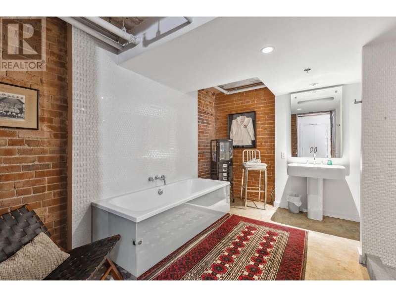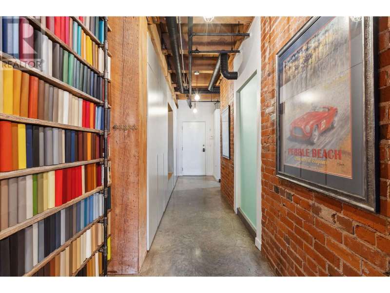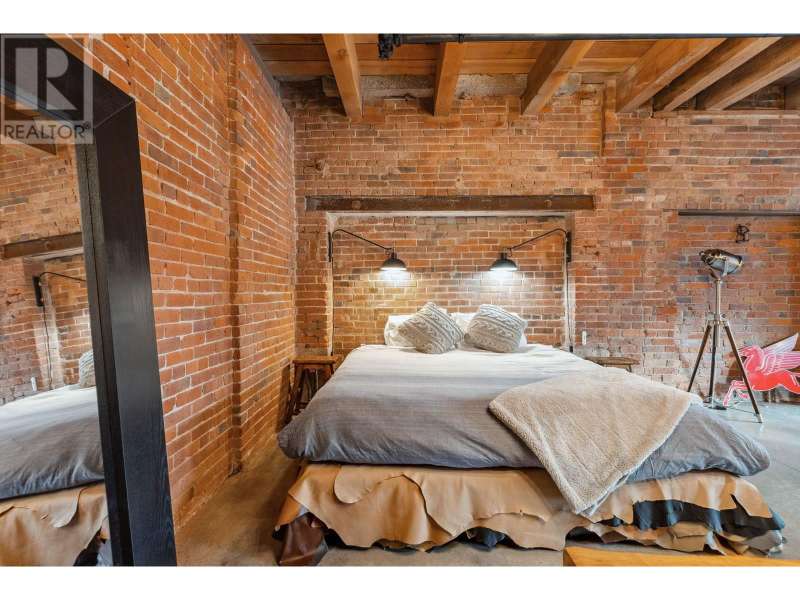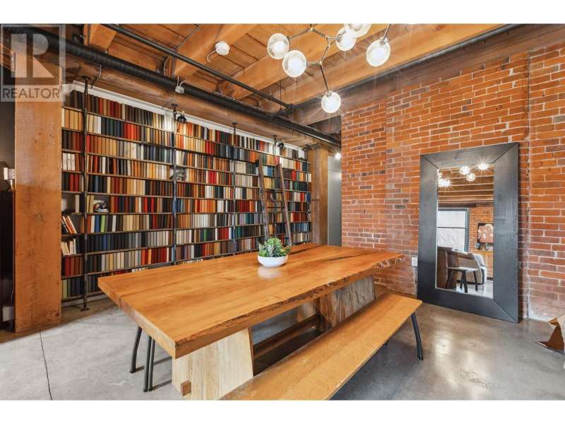 Unique customized character loft at Koret Lofts, Vancouver´s most desirable warehouse conversions. Original timber beams, exposed bricks w/endless character in this unique property, 10´4" ceilings, polished concrete floors & fully upgraded. Beautiful black kitchen with gas cooktop, SMEG fridge, gorgeous textured countertops, unique restoration style bookshelf/library w/sliding ladder, sleek built-ins, & large washroom encased in original brick which was originally a vault! Countless fine details: dramatic old-world inspired lighting, h/w on demand system, great storage & closet spaces, auto blinds. Building zoned commercial live/work. Strata allows pets & shorter term rentals, great revenue from film/movie industry crews as well. Includes one secure parking. Call today for a private showing! (id:58403)