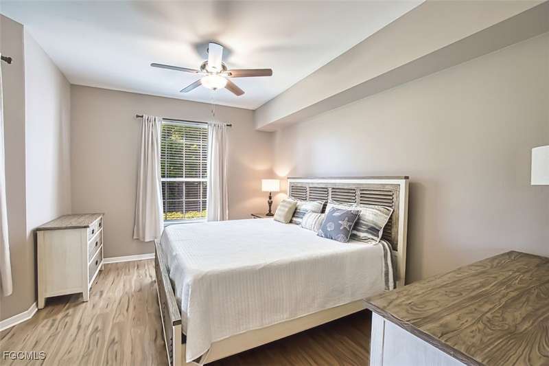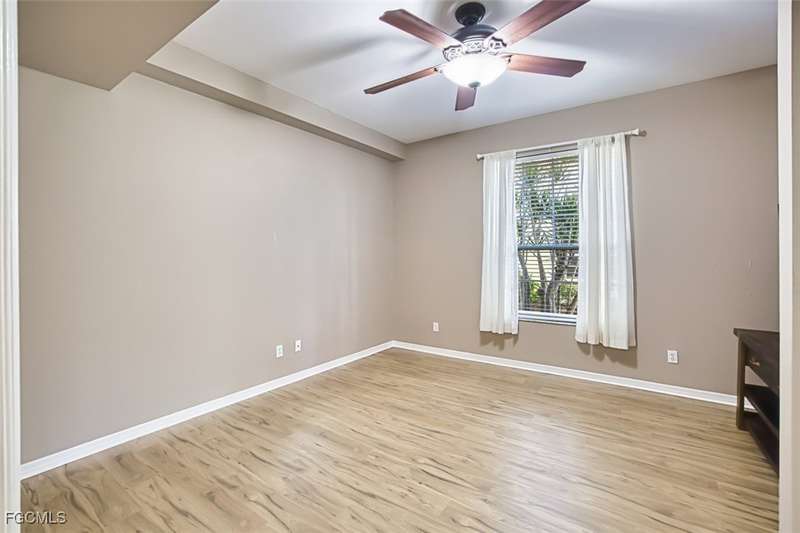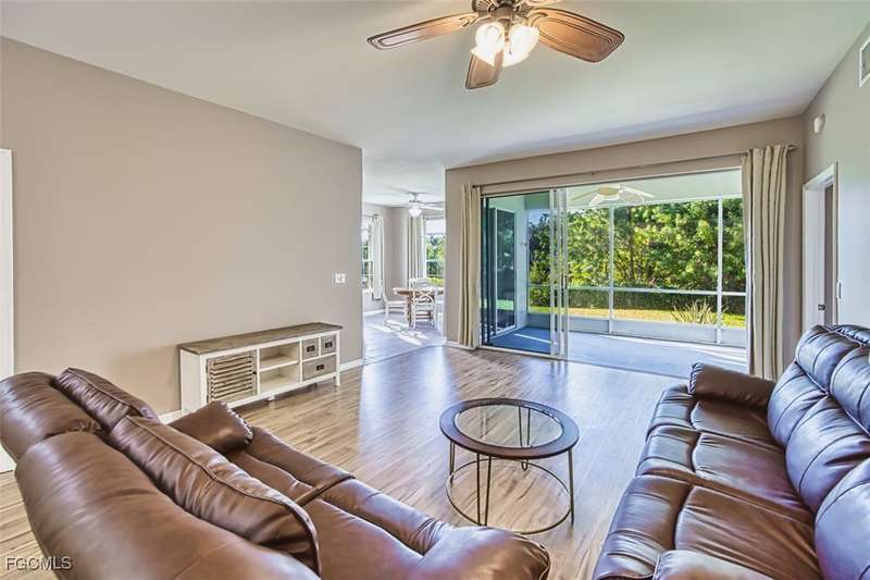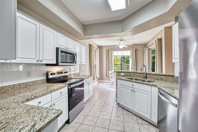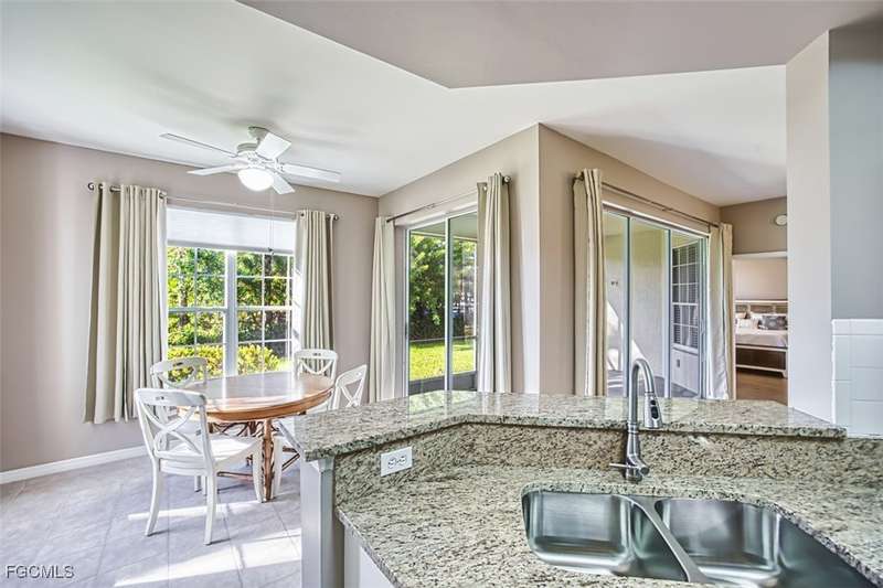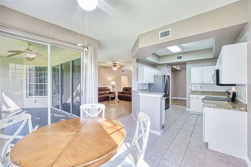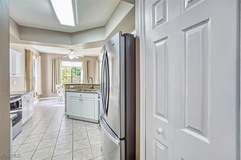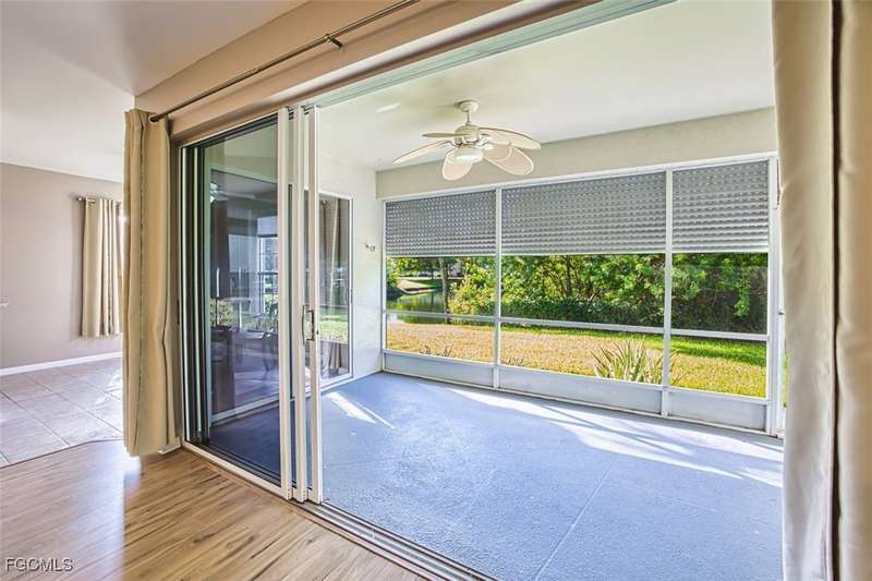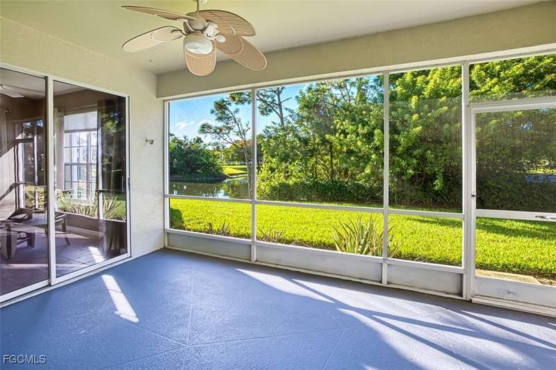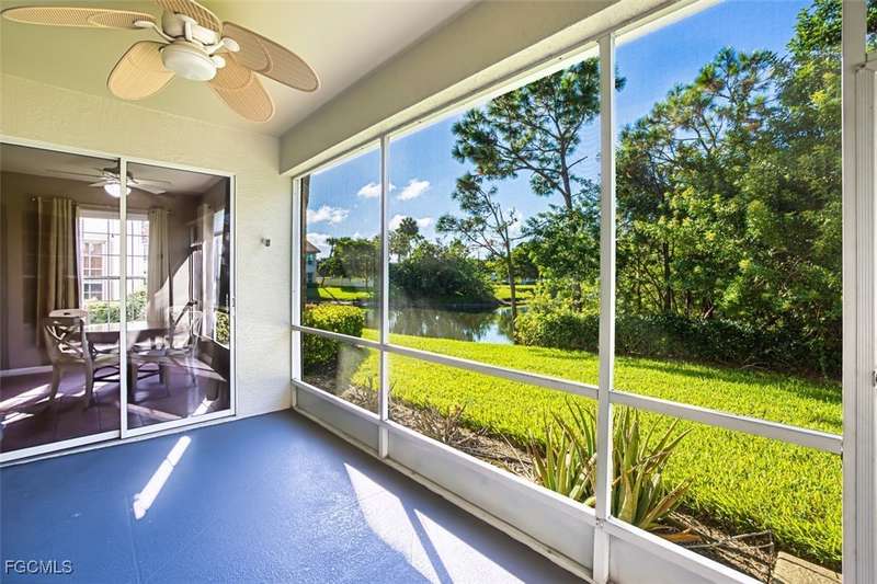 First-Floor Carriage Home in Avalon Bay - Minutes from the Beaches! Ideally situated just off Summerlin Road, this spacious and inviting 2 car garage home offers the perfect blend of comfort, convenience, and coastal living. With no stairs and an end-unit location, natural light fills the space from windows on the East, South and North sides. Featuring a 2-bedroom, 2-bath split floor plan plus a versatile flex room, this home offers both privacy and flexibility. The flex room-perfect for a home office, guest room, or workout space-can be easily closed off with pocket doors for added privacy. Relax and unwind on the large screened lanai with peaceful water views, protected by electric roll-down and accordion storm shutters. The 2-car garage includes extra space for your beach, biking, or fishing gear. Both bedrooms offer ensuite baths for ultimate comfort and convenience, with dual sinks and a soaking tub and shower in the master. Recent updates include New AC and lines (2024), Granite countertops, sink, and lower kitchen cabinets (2024), New laminate flooring (2025). Freshly painted, this clean, move-in-ready home is perfect for seasonal or year-round living. Avalon Bay is a beautifully maintained community that had No Flooding, no-CDD, No City Tax, and replaced all roofs in 2021. Just a short stroll to the clubhouse pool residents enjoy access to tennis courts, spa, fitness center, billiards room, and more. Live minutes from Sanibel and Fort Myers beaches, Lakes Park, HealthPark Medical Center, Golisano Children's Hospital, the public library, farmers markets, top restaurants, and Lee County's extensive bike trail system.