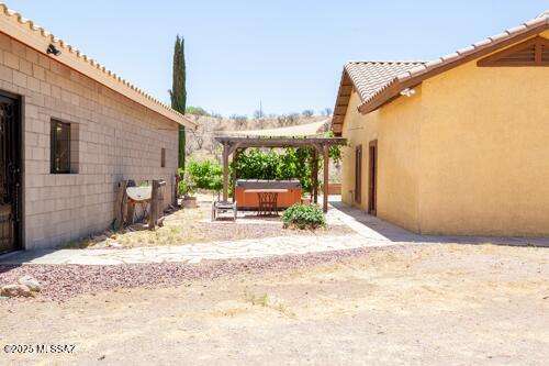 Southwestern Contemporary home is now available in West Rio Rico, above the Santa Cruz River Valley in Southern Arizona. The custom-built one level 3-bedroom and 2 bath, 2564 square foot tile-roofed home on 1.16 acres is a rare find.Distinctive features include custom metalwork entry doors, circular covered gated entry, generous covered back patio and large surrounding level fenced yard. Large bonus workshop/kitchen/carport, 1936 sqft,ideal for projects, the creative or designers. Including connections for half bathroom planned with toilet and shower plumbing installed, but not complete. RV parking and hookup. From the elevated larger lot, set back from the road, you can enjoy privacy, family, entertaining, fabulous sunrise/sunset views.