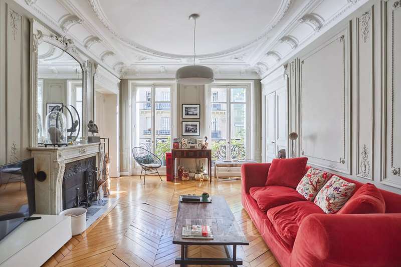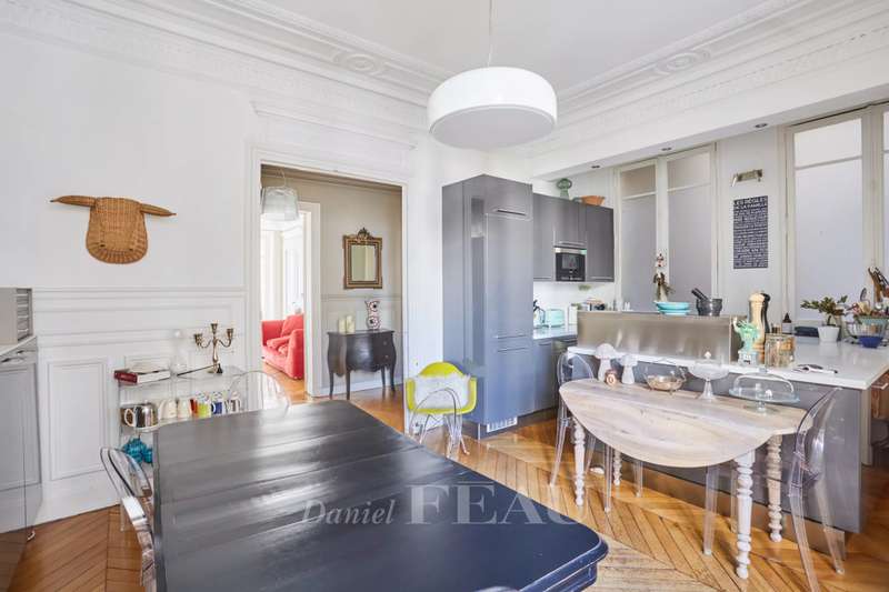 Rue de Prony, a stone’s throw from leafy Parc Monceau. This 7-room apartment is on the 3rd floor of a fine late 19th century freestone building boasts period features including high ceilings and is particularly bright. An entrance hall leads to a drawing room with a balcony, a living/reception room, a dining room, a fitted open-plan kitchen, four bedrooms including a master suite with a shower room and dressing room, a bathroom, a utility room and two separate wc. Ample fitted storage space. With a cellar.