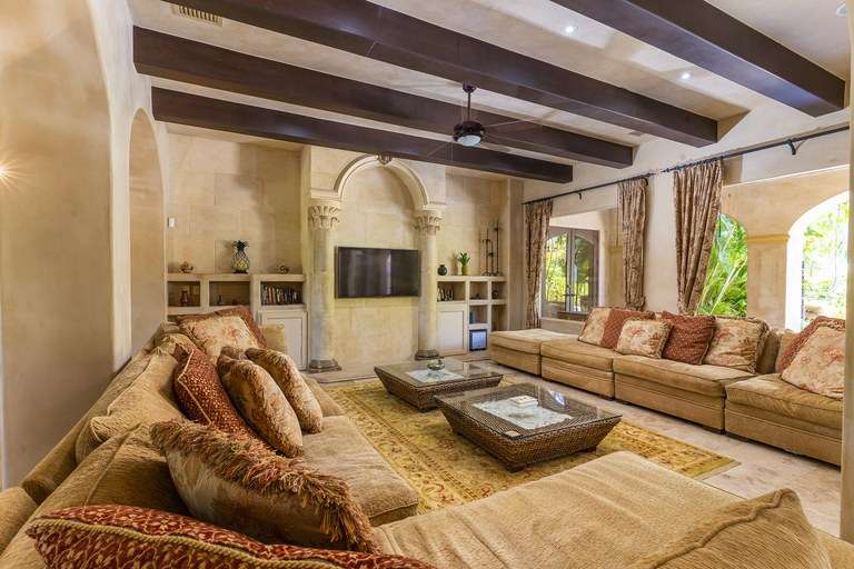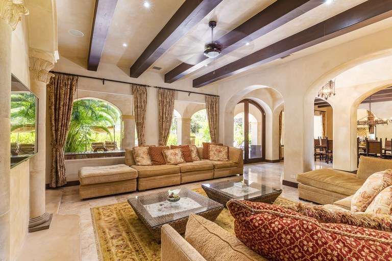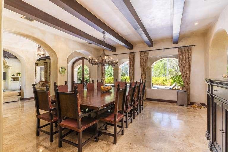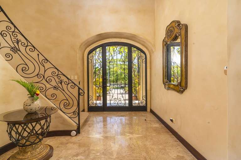 From the moment you arrive, the property's classic Italian design captivates you—arched doorways, wrought-iron detailing, terracotta rooflines, and warm stone accents create an authentic old-world ambiance, while premium hand-laid stucco and modern craftsmanship ensure lasting quality. Mature landscaping provides natural privacy and frames breathtaking golf course views, offering a serene environment that feels worlds away, yet is just minutes from the beach.