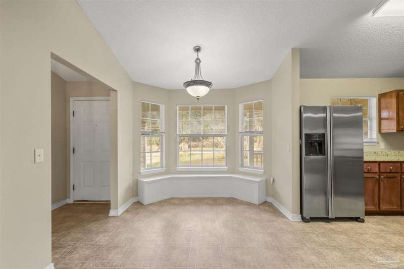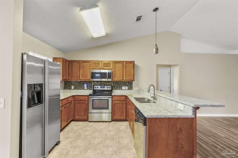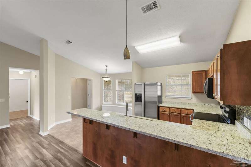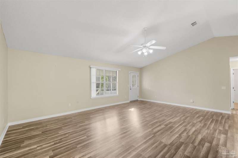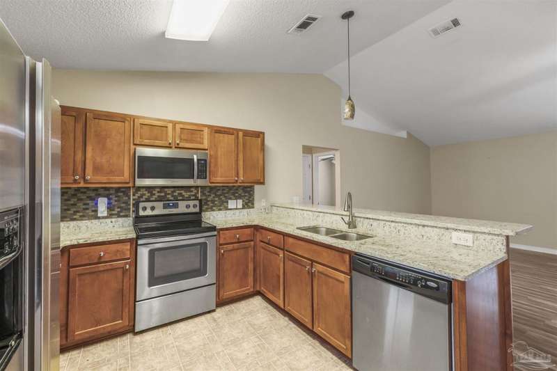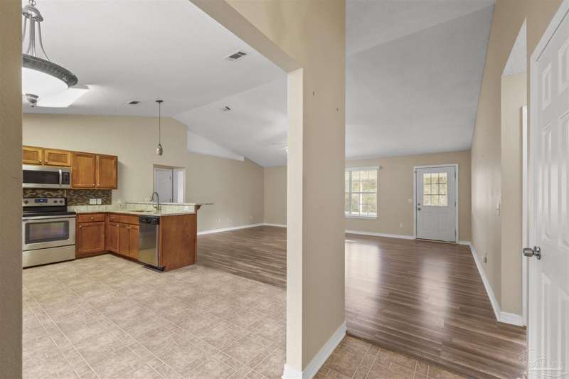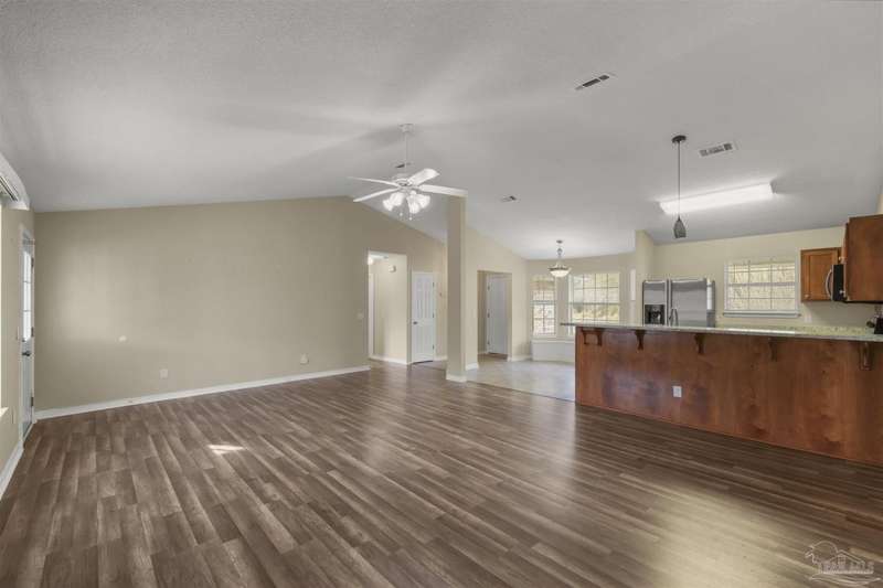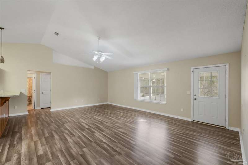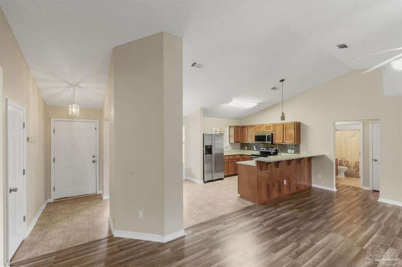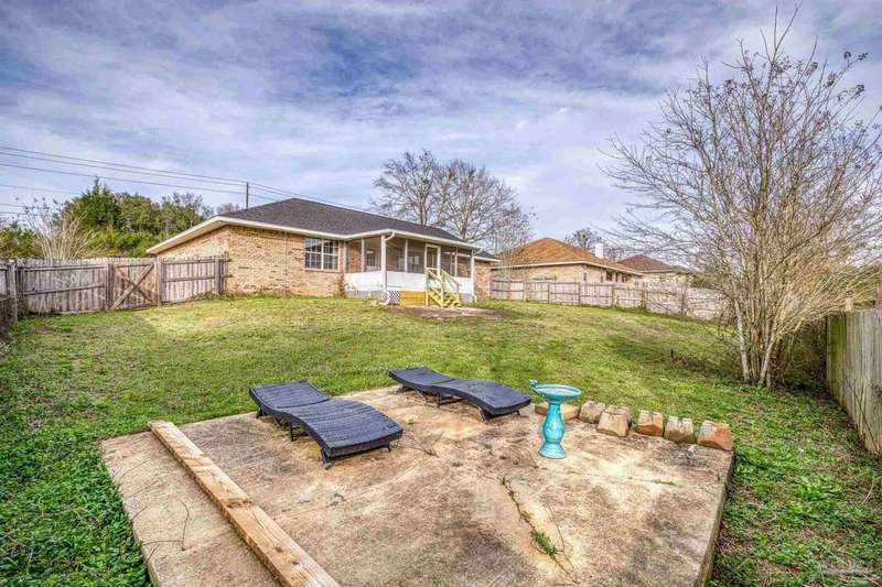 Welcome to your new home at 2481 Devine Farm Rd in Cantonment-a delightful single-family dwelling that seamlessly combines comfort with style, making it an ideal space for both families and individuals. This thoughtfully crafted split floor plan features 3 bedrooms and 2 bathrooms across 1,587 square feet of welcoming living area. At the heart of the home, you'll find a bright and open concept dining and family room, enhanced by a vaulted ceiling that lends an airy ambiance. The kitchen, designed for both function and style, is equipped with a bar separating it from the living room, and showcases elegant granite countertops, modern appliances, and plenty of cabinet space. Relax in the cozy adjoining living room or enjoy the lovely Florida weather on your screened porch-perfect for savoring morning coffee or unwinding in the evening. The fenced yard not only offers privacy but also serves as a great space for outdoor activities or gardening projects. A dedicated laundry room with a utility sink adds convenience and efficiency to your daily chores. Unwind in the spacious master suite, complete with a walk-in closet and an en-suite bathroom featuring a double vanity and a combined shower and tub. The two additional bedrooms provide flexibility, whether for family, guests, or a home office, and the second bathroom enhances comfort and convenience. Notable features of this property include central air conditioning, ceiling fans in both the living room and bedrooms for added comfort, and the peace of mind offered by a new roof and HVAC system installed in 2022, ensuring energy efficiency. The fenced yard is a private retreat perfect for outdoor fun, while the 2-car garage provides ample parking and storage space. Conveniently located, this home is just minutes away from local amenities. Enjoy nearby parks like Ashton Brosnaham Park for outdoor recreation, and take advantage of the proximity to dining and shopping venues for everyday convenience. Schedule a tour today!
