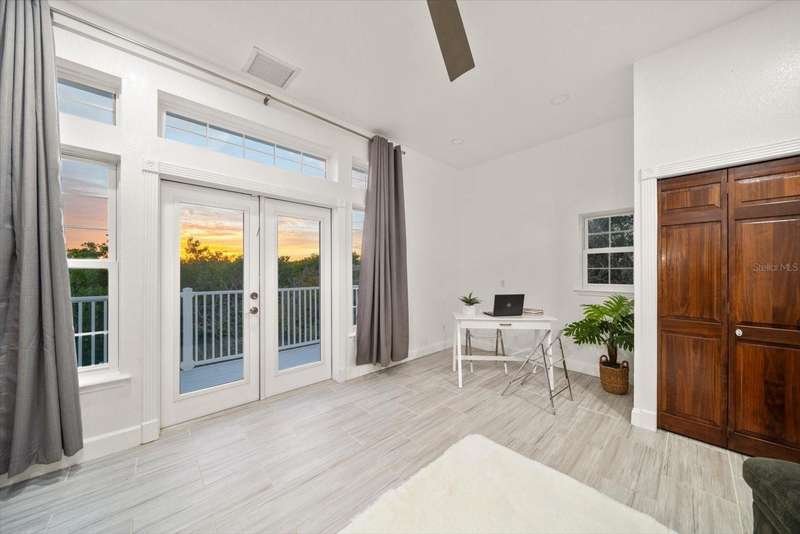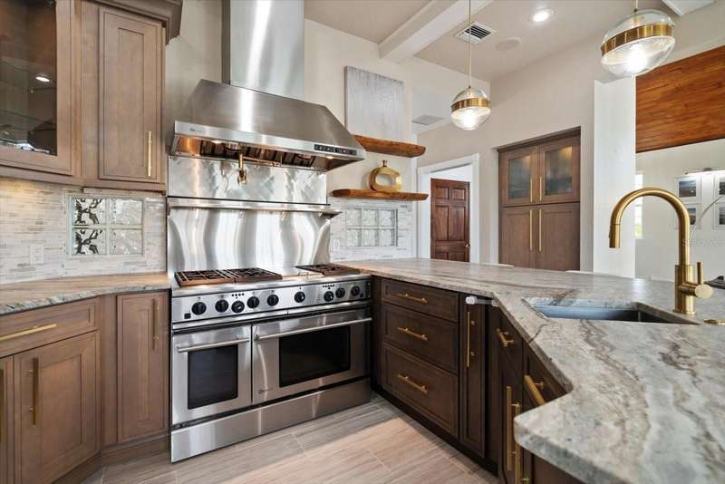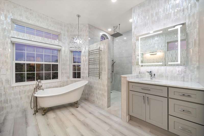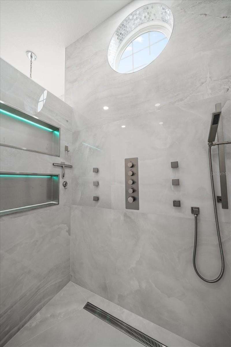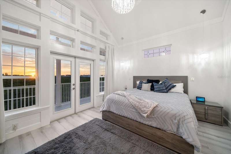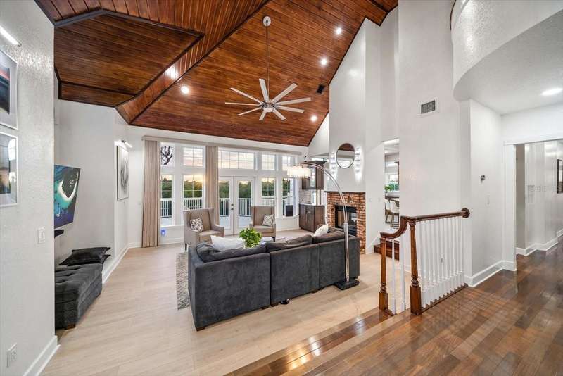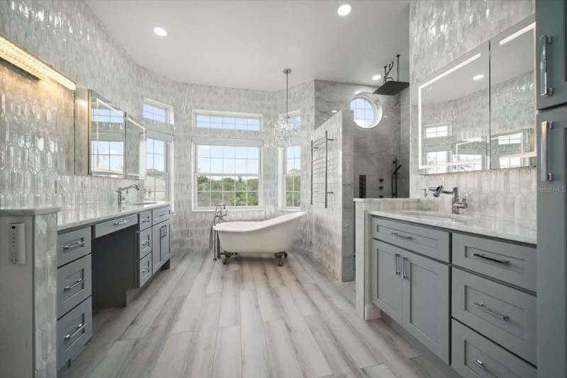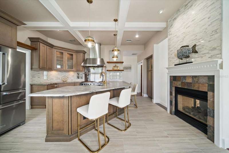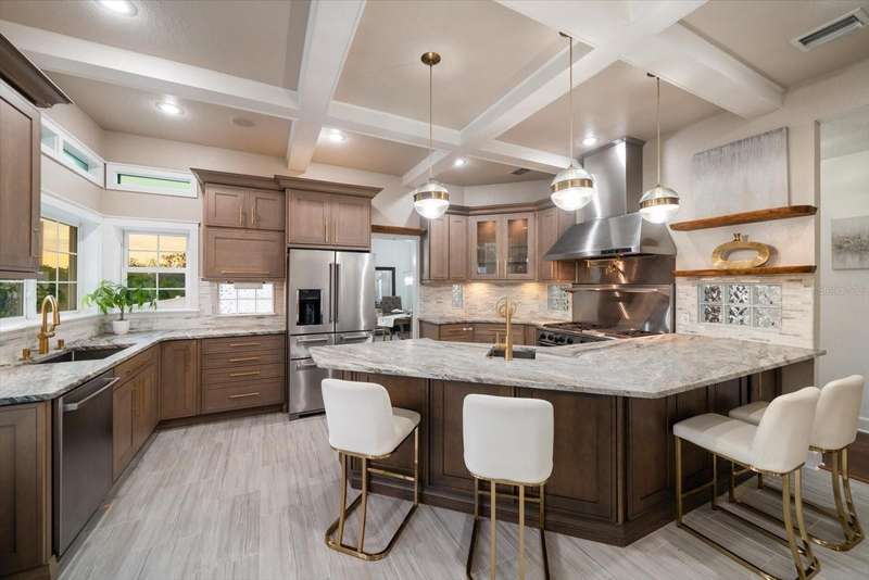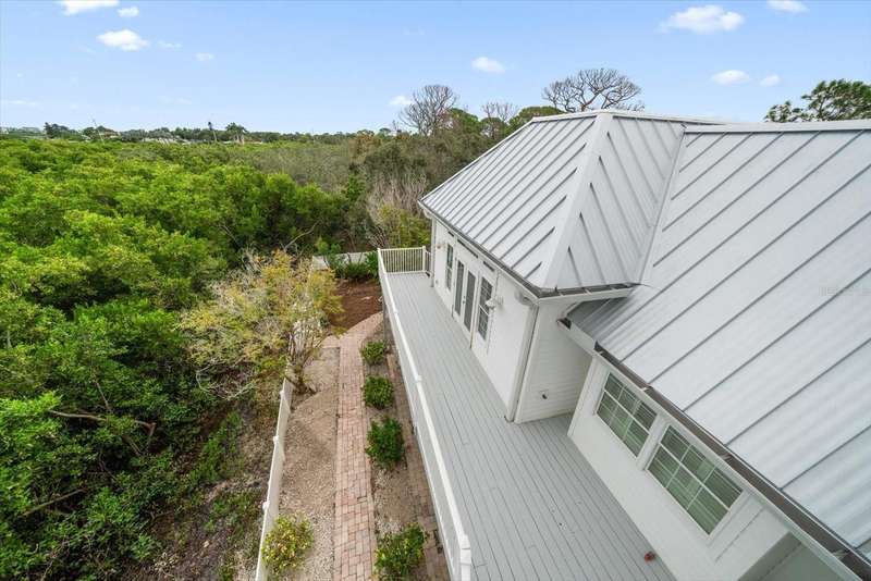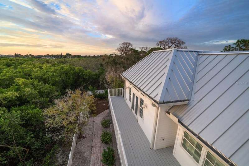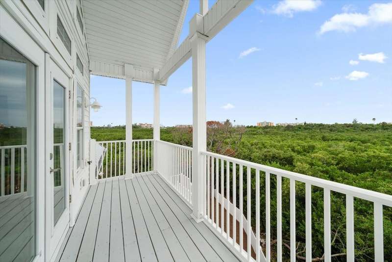 With its unparalleled blend of sophistication and natural serenity, this exquisite residence offers a tranquil setting, abundance of privacy, and notable space appreciated for those with varied interest. The interior is defined by meticulous attention to detail and a sense of timeless, refined luxury. Elevated construction with living areas on the second and third levels are easily accessed by either stairs or elevator. The entry through double etched glass doors to the main living level is impressive with its vaulted ceilings, soft lighting and detailed rich planked wood ceilings. A spectacular kitchen with large center island, top of the line appliances such as a 6 burner gas stove is certain to impress the most selective chef. Family and guests will enjoy the two sided fireplace during casual meals or grand-scale entertaining in the inviting dining room. Three additional bedrooms, one currently used as an office, provide a floor plan that is functional. The entire third level is comprised of the opulent primary suite featuring a lavish bath area with exquisite finishes- soaking tub, walk in shower with multiple heads, mirrors with touch activated lighting and temperature control; the area exudes refined luxury. Be delighted by the sensational sunsets from your expansive private terraces. Ground level flex area of approximately 580 sq. ft., not included in the heated square footage, provides additional space for exercise, hobbies, or recreational activities and is equipped with a spacious bar and full bath. Additionally, the property offers an oversized air conditioned 4 car garage, separate work shop, storage and hard wired hook up for whole house generator. Opportunity for short term rental income as well with its proximity to the beaches: Car enthusiasts will take note of all of the space! New items include; roof, baths, flooring, HVAC systems, landscaping and much more. Appreciate the private side yard for gardening, play area, or various outdoor activities- Seller has acquired a plan for those who consider an addition of a pool and can be shared. This is a property with a multitude of possibilities for those with varied interest. The striking architectural design blends seamlessly with the natural landscape and allows for a private retreat where luxury meets the beauty of nature! And yet, it is just minutes from beaches, shopping and access roads to neighboring Tampa and St Petersburg. Don’t miss this one-it is outstanding!