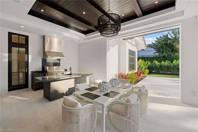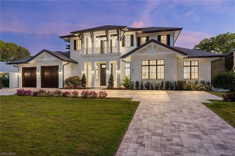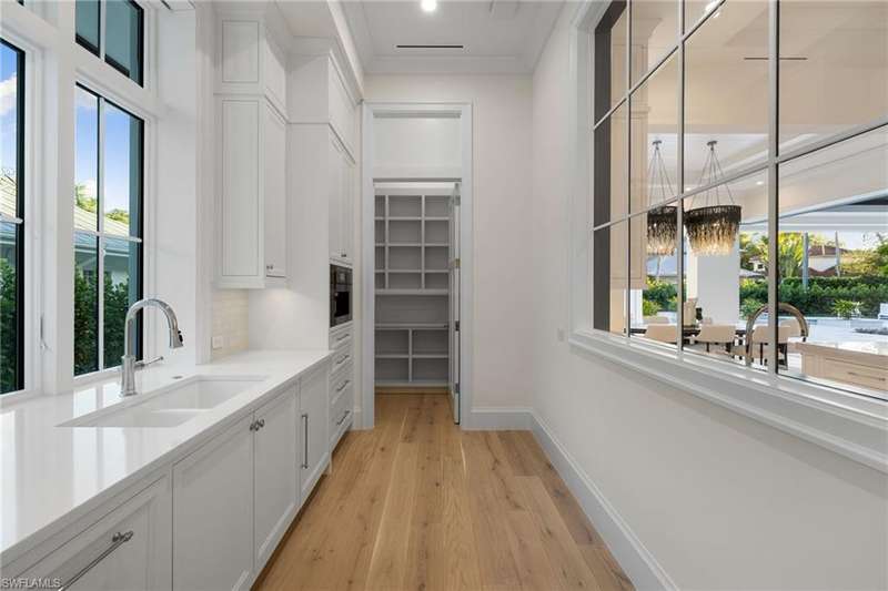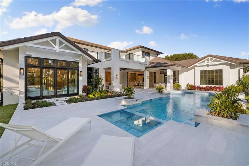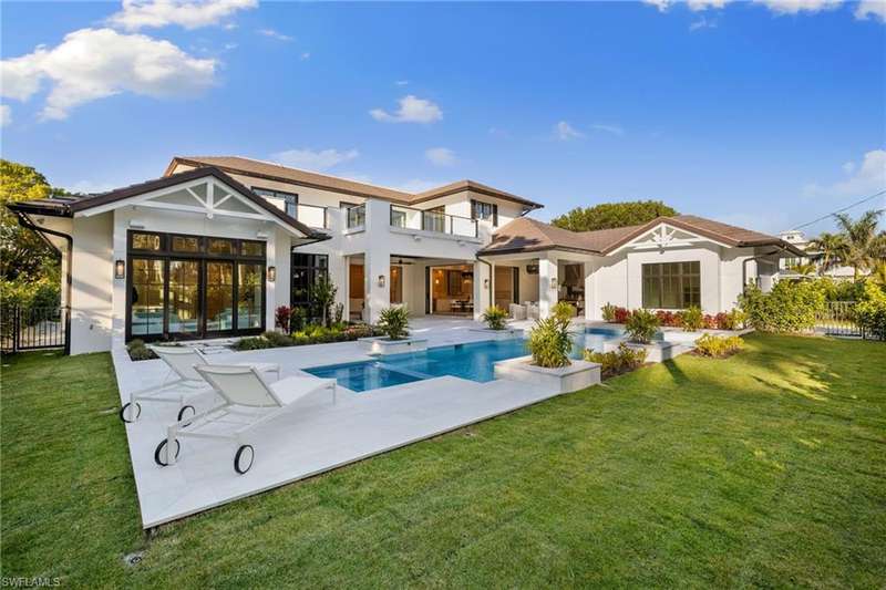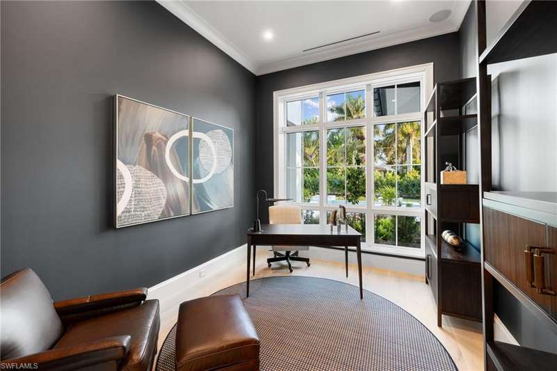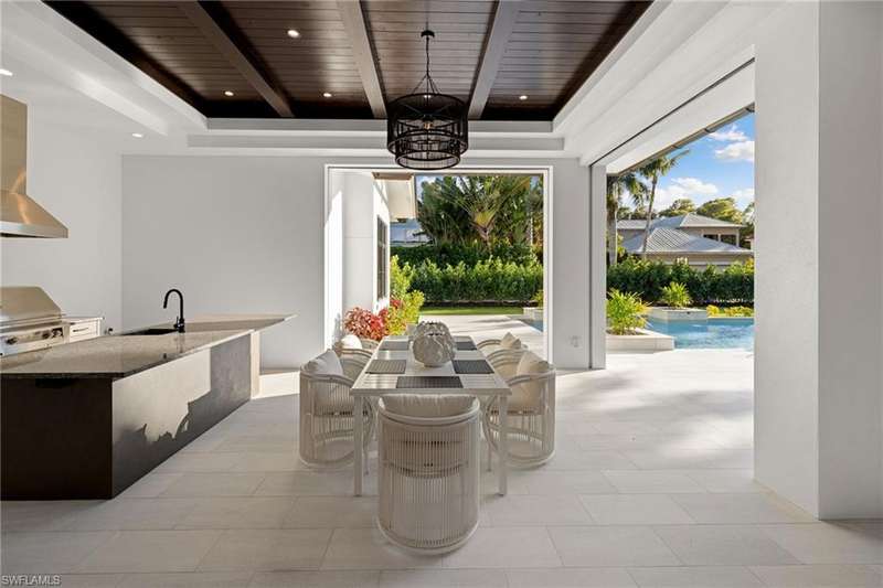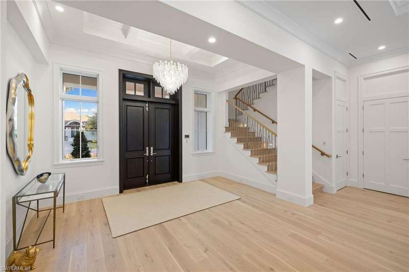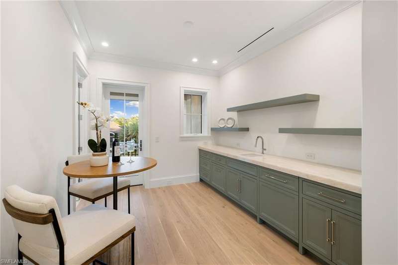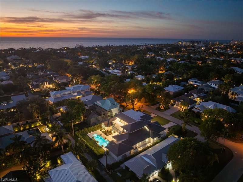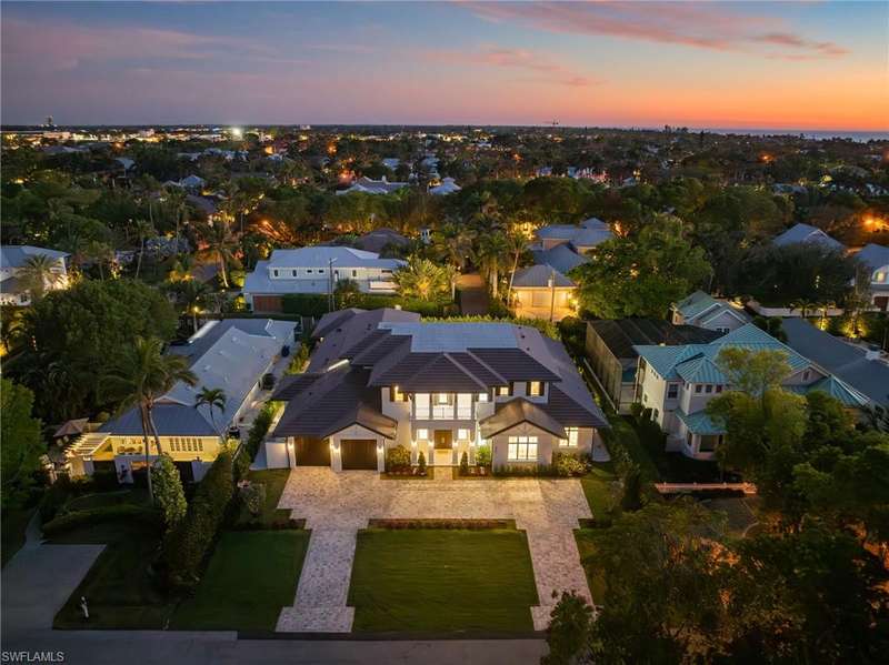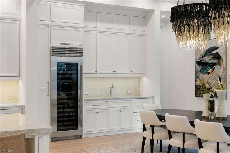 Situated on one of the most prestigious streets in Naples, just moments from its world-renowned sugar sand beaches, this exceptional new construction residence is set on an oversized homesite in the highly desirable X and X500 flood zones allowing for seamless 1st floor living. The home offers five ensuite bedrooms, including a ground-level owner's suite with a spacious dressing room, study, and a flex room that offers a versatile space, perfect for a home gym, second closet, den or art studio. At the heart of the home is a magnificent great room, where timeless sophistication meets modern innovation. The residence includes a formal dining room, a state-of-the-art kitchen, and the latest in home automation, security, and built-in audio with speakers. The chef s kitchen features high-end appliances from SubZero, Miele, and Wolf, dual wall ovens, beverage drawers, and a quartzite-topped island. A separate service kitchen with walk in pantry, a built-in Miele coffee maker, an additional d