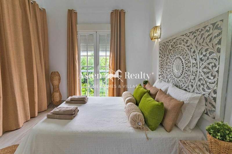 On the ground floor there is an entrance hall, a bright living room with large sliding doors leading to the garden and swimming pool, a toilet, a modern kitchen separate from the dining room and a huge bedroom with en-suite bathroom, with the possibility of dividing it into two complete bedrooms.