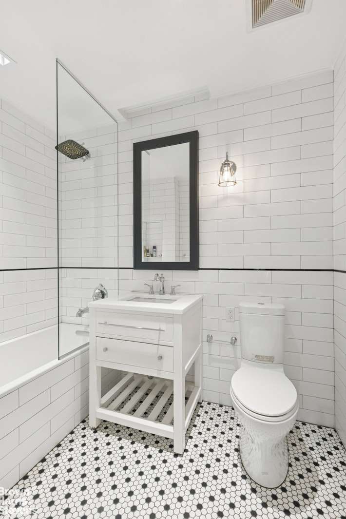 The bedroom is big enough for a king-sized bed, as well as a desk for those working from home. The unique layout offers separation between the living room and bedroom, giving ample space and privacy. The bathrooms offer Kohler sinks and toilets, as well as Restoration Hardware vanity, Carrera marble vanity top, and beautiful classic subway tiles.