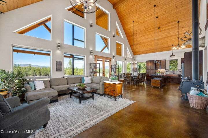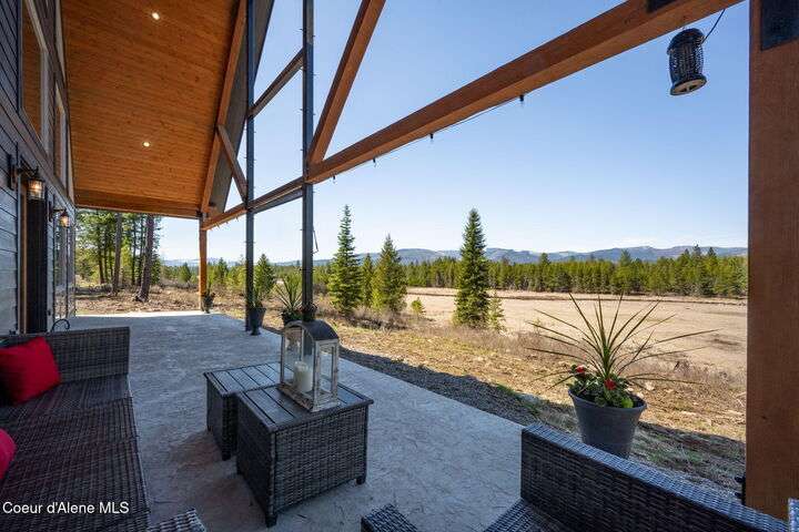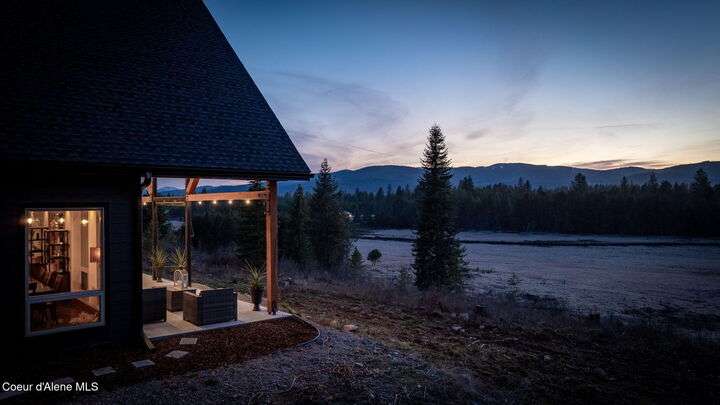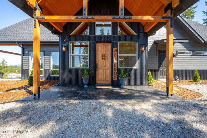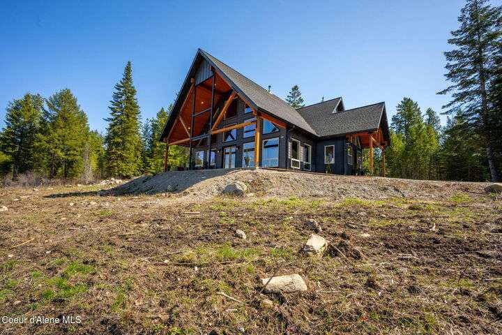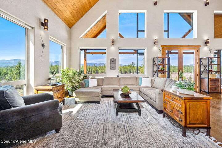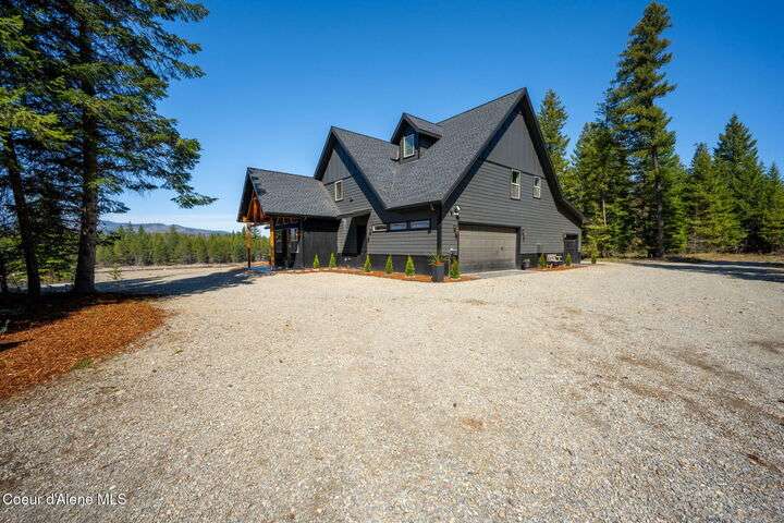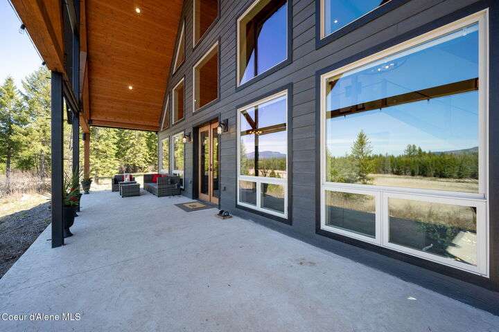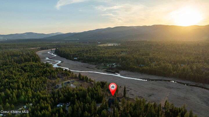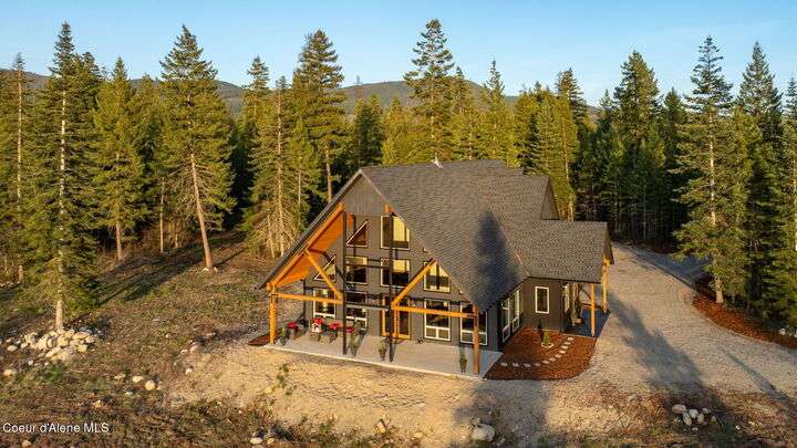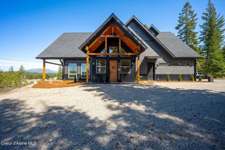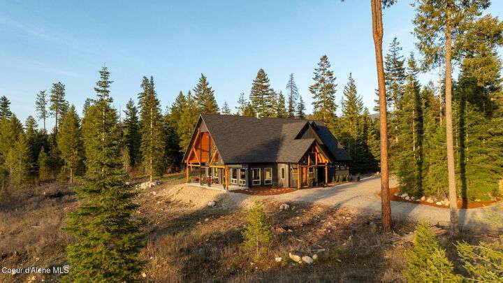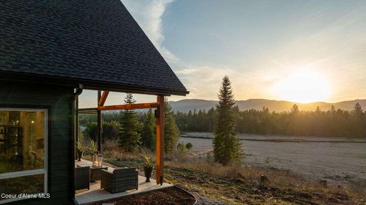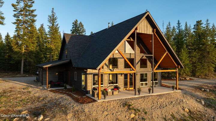 MOTIVATED SELLER Custom-built Modern home on 9.8 acres with 'big sky' views and on the Hoodoo River! Just 35 minutes to CDA or Sandpoint, the 5-bedroom plus office, 3.5-bath, 3,889 sq ft home built in 2022 is truly breathtaking from the moment you walk through the front door. The main living area features 30-foot vaulted ceilings, clean radiant floor heat, and expansive picture windows that flood the space with natural light. The designer kitchen is a showstopper, with incredible views you can enjoy while cooking. Copper sink and lighting accents complement the gorgeous quartz countertops, high-end appliances, and custom cabinetry. The main floor master suite offers a spa-like retreat, complete with a jetted tub and French doors leading to a private deck perfect for soaking in the serene surroundings. The front deck is ideal for taking in vibrant evening sunsets or watching local wildlife. Upstairs, beyond the 3 additional bedrooms, you'll find an 800 sq ft apartment with 1 bedroom,