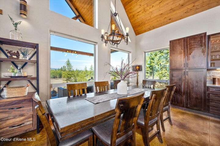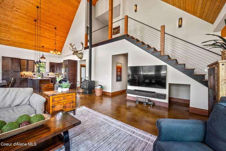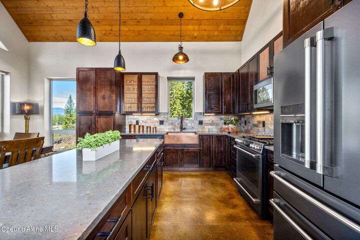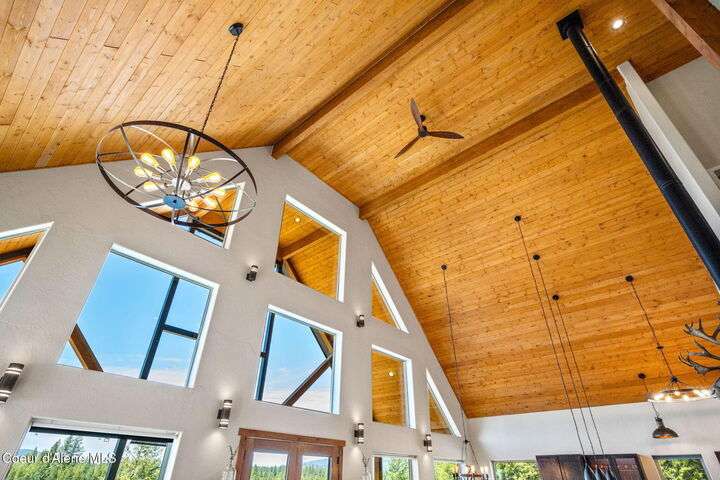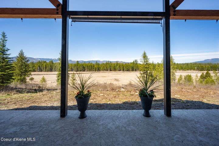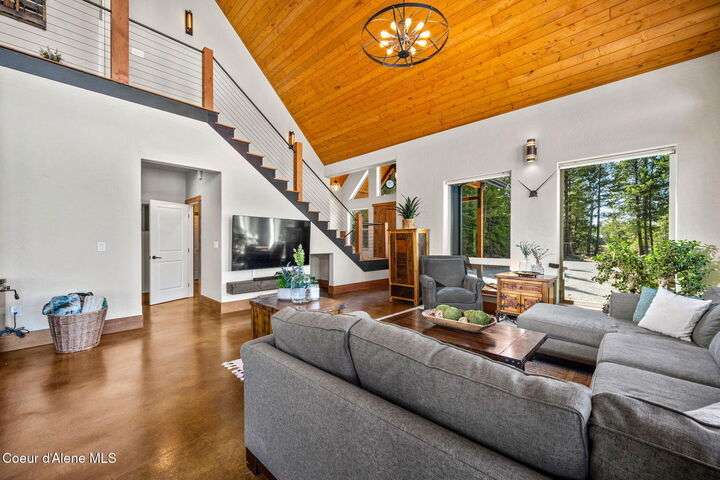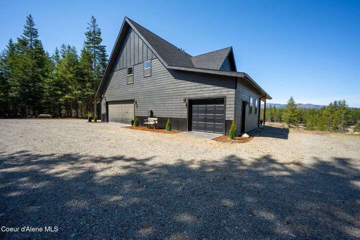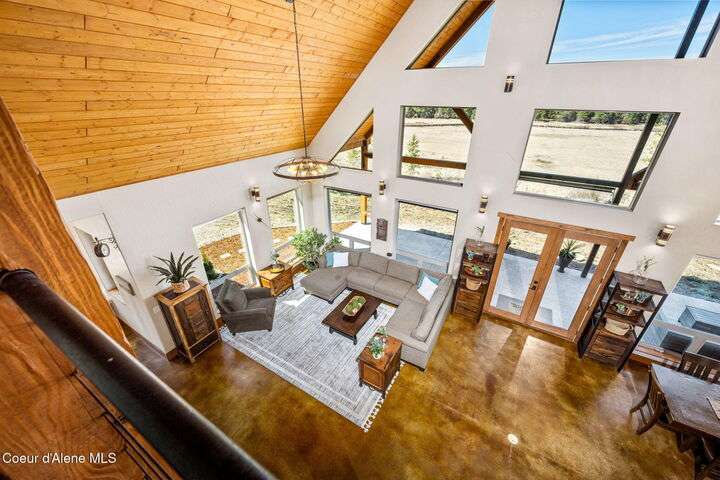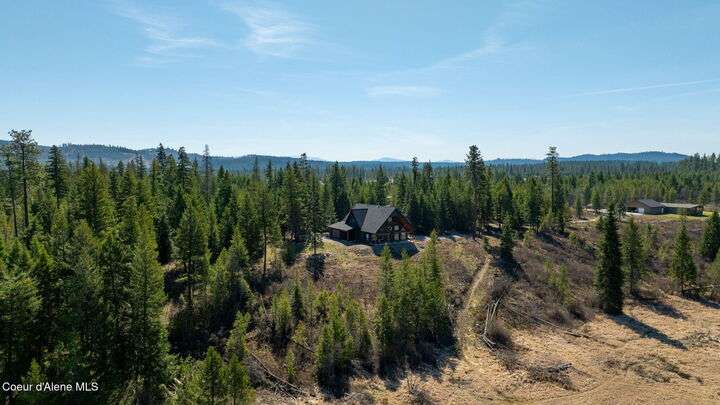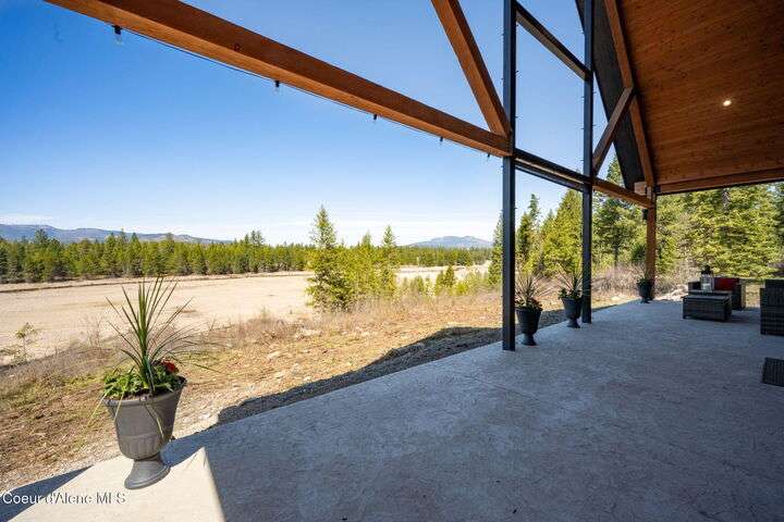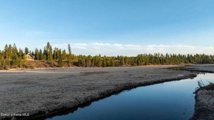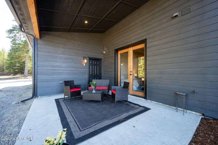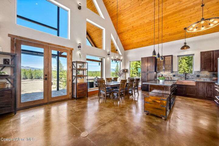 MOTIVATED SELLER Custom-built Modern home on 9.8 acres with 'big sky' views and on the Hoodoo River! Just 35 minutes to CDA or Sandpoint, the 5-bedroom plus office, 3.5-bath, 3,889 sq ft home built in 2022 is truly breathtaking from the moment you walk through the front door. The main living area features 30-foot vaulted ceilings, clean radiant floor heat, and expansive picture windows that flood the space with natural light. The designer kitchen is a showstopper, with incredible views you can enjoy while cooking. Copper sink and lighting accents complement the gorgeous quartz countertops, high-end appliances, and custom cabinetry. The main floor master suite offers a spa-like retreat, complete with a jetted tub and French doors leading to a private deck perfect for soaking in the serene surroundings. The front deck is ideal for taking in vibrant evening sunsets or watching local wildlife. Upstairs, beyond the 3 additional bedrooms, you'll find an 800 sq ft apartment with 1 bedroom,