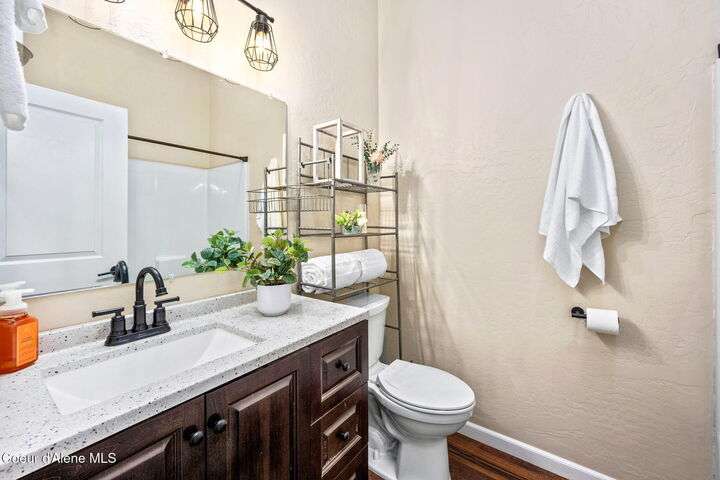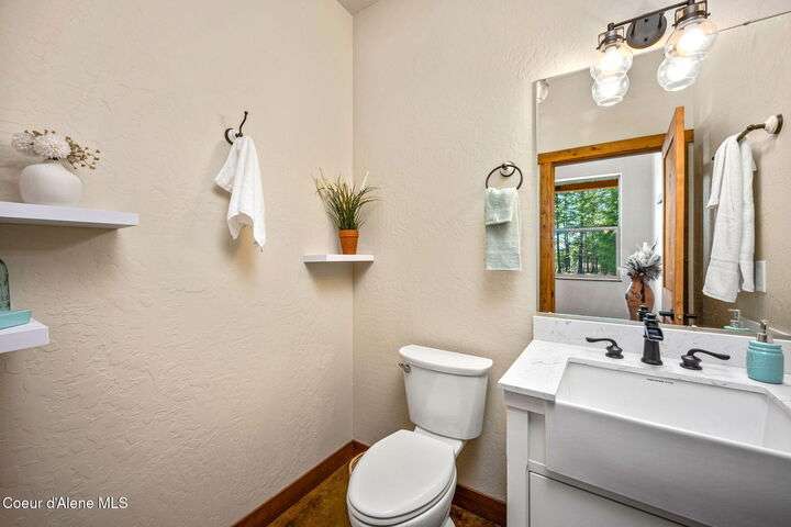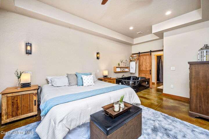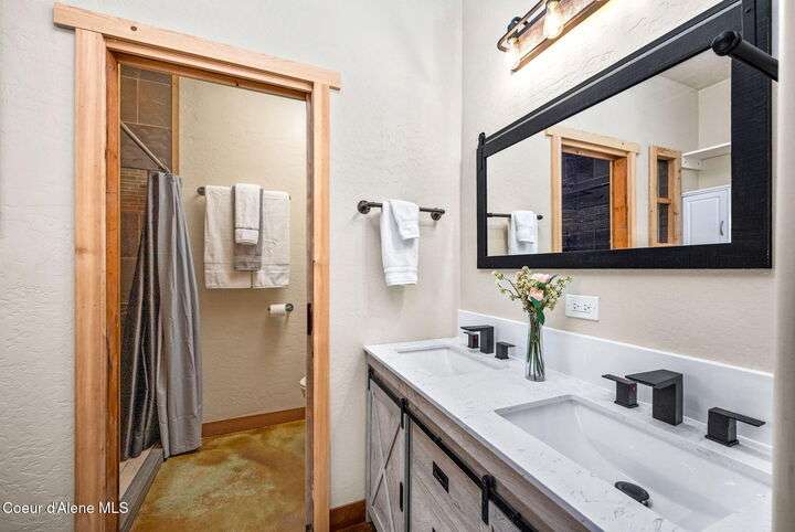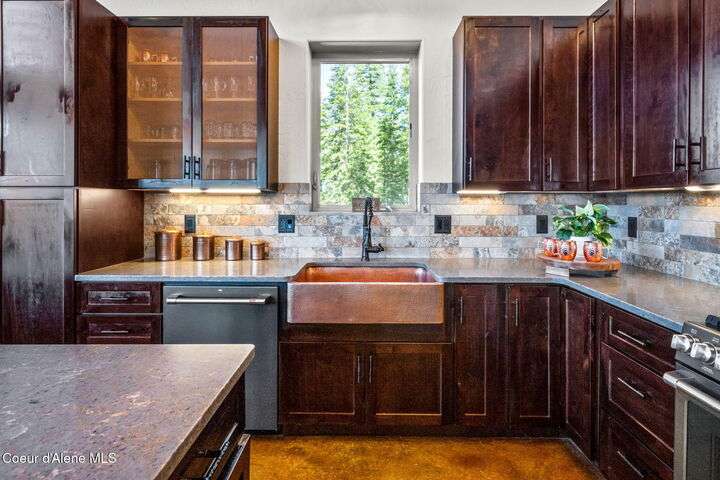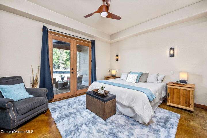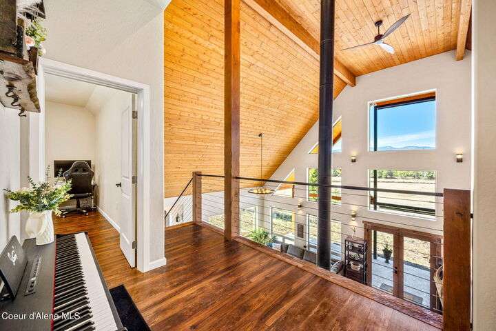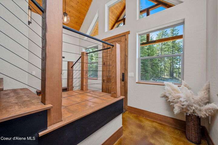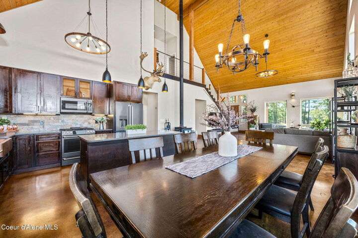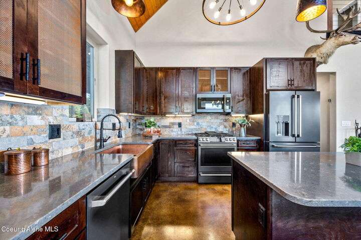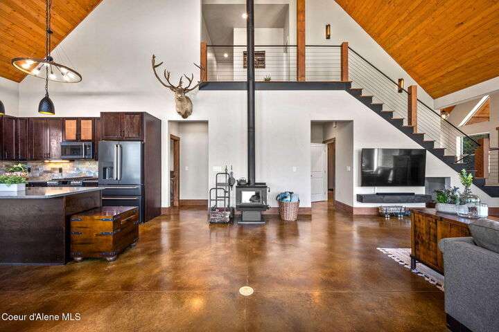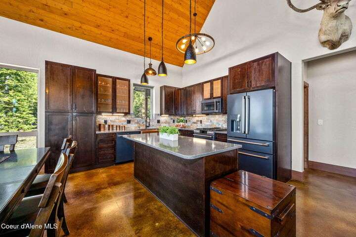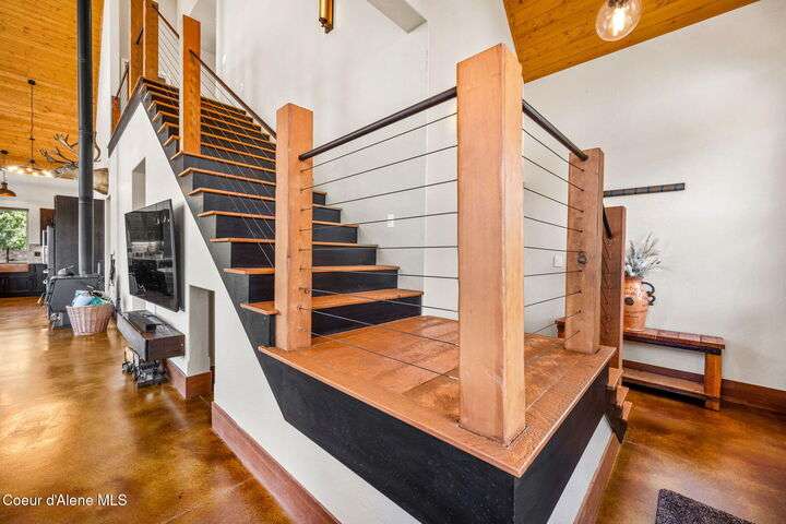 MOTIVATED SELLER Custom-built Modern home on 9.8 acres with 'big sky' views and on the Hoodoo River! Just 35 minutes to CDA or Sandpoint, the 5-bedroom plus office, 3.5-bath, 3,889 sq ft home built in 2022 is truly breathtaking from the moment you walk through the front door. The main living area features 30-foot vaulted ceilings, clean radiant floor heat, and expansive picture windows that flood the space with natural light. The designer kitchen is a showstopper, with incredible views you can enjoy while cooking. Copper sink and lighting accents complement the gorgeous quartz countertops, high-end appliances, and custom cabinetry. The main floor master suite offers a spa-like retreat, complete with a jetted tub and French doors leading to a private deck perfect for soaking in the serene surroundings. The front deck is ideal for taking in vibrant evening sunsets or watching local wildlife. Upstairs, beyond the 3 additional bedrooms, you'll find an 800 sq ft apartment with 1 bedroom,