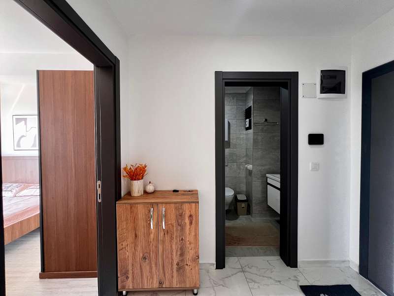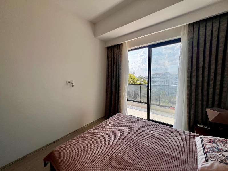 The flat is designed in accordance with the latest trends using quality materials. The interior design includes built-in kitchen furniture, floor coverings, built-in plumbing, fully equipped bathroom, interior doors, PVC windows, shower cabin, central satellite system and balcony.