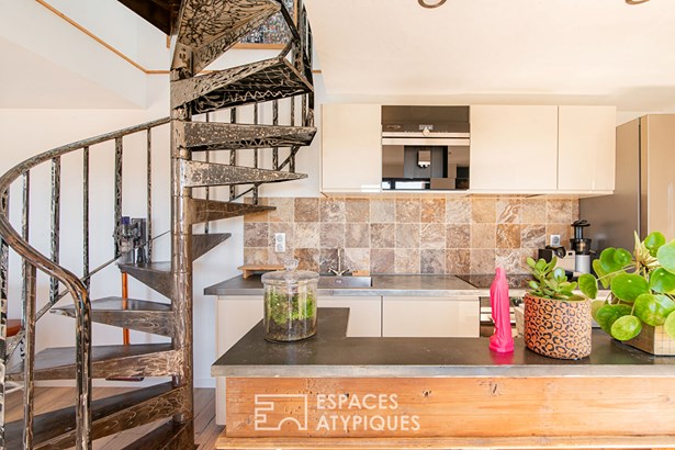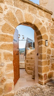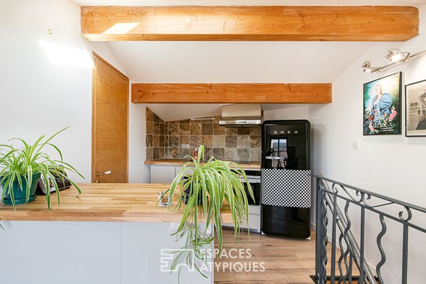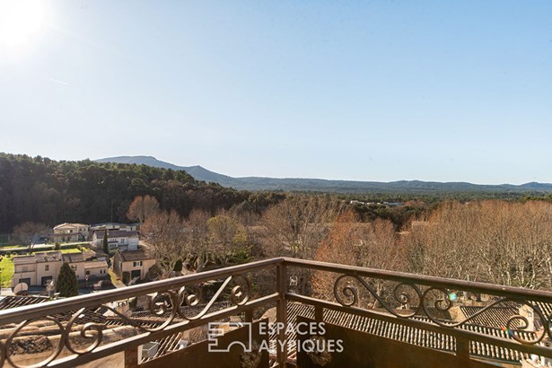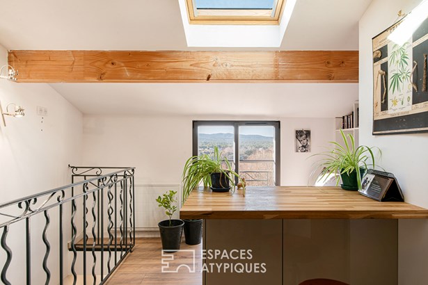 Depuis une charmante place, un porche en pierre marque l'entree de la propriete et laisse deja entrevoir la vue. Quelques marches menent directement a la piece de vie, veritable coeur de la maison. Cet espace convivial reunit un salon baigne de lumiere et une cuisine amenagee, creant un cadre harmonieux et fonctionnel.