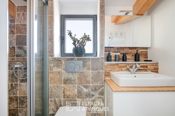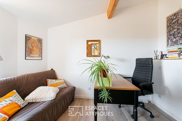 L'etage superieur accueille une salle d'eau, une chambre,un bureau, tous beneficiant egalement d'une belle vue sur les environs.
